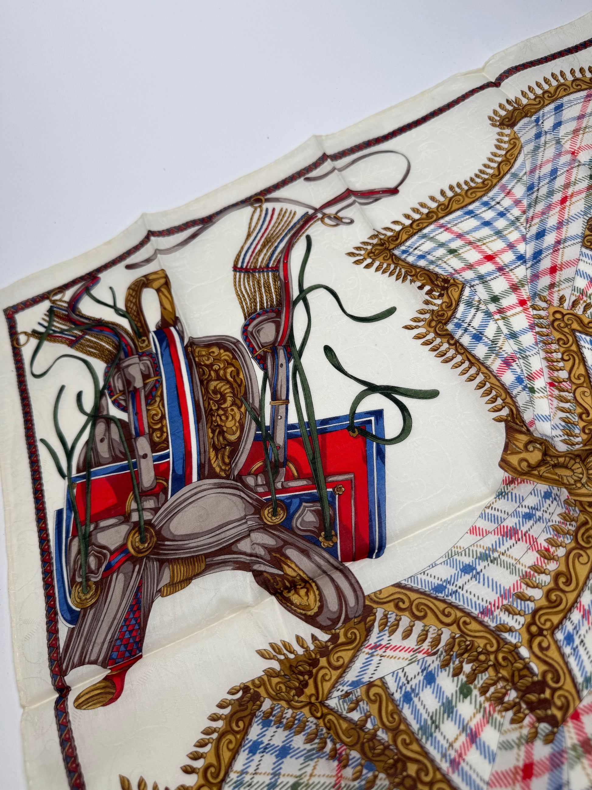 This vintage scarf is finely crafted of silk and canvas with a white base, featuring colorful illustrated saddles and a crumpled fabric motif at the center. A distinctive and playful accessory that reflects Céline’s equestrian-inspired heritage.