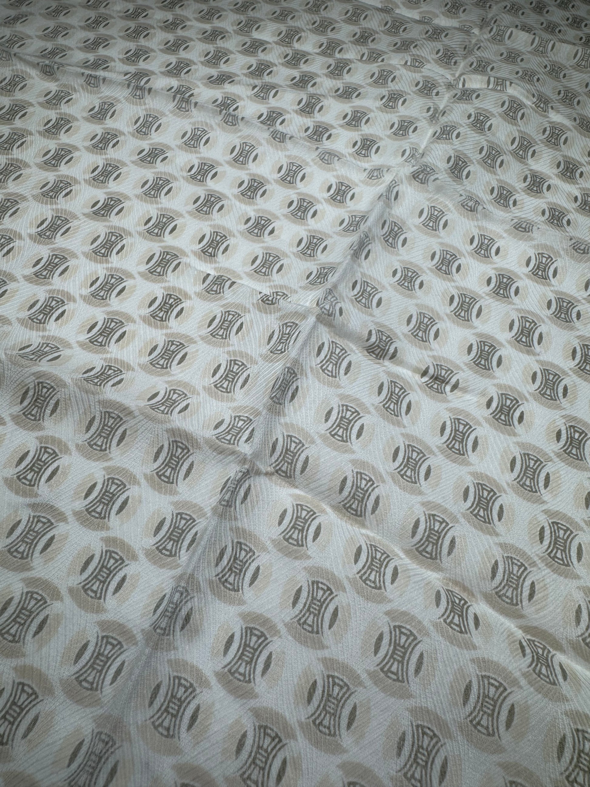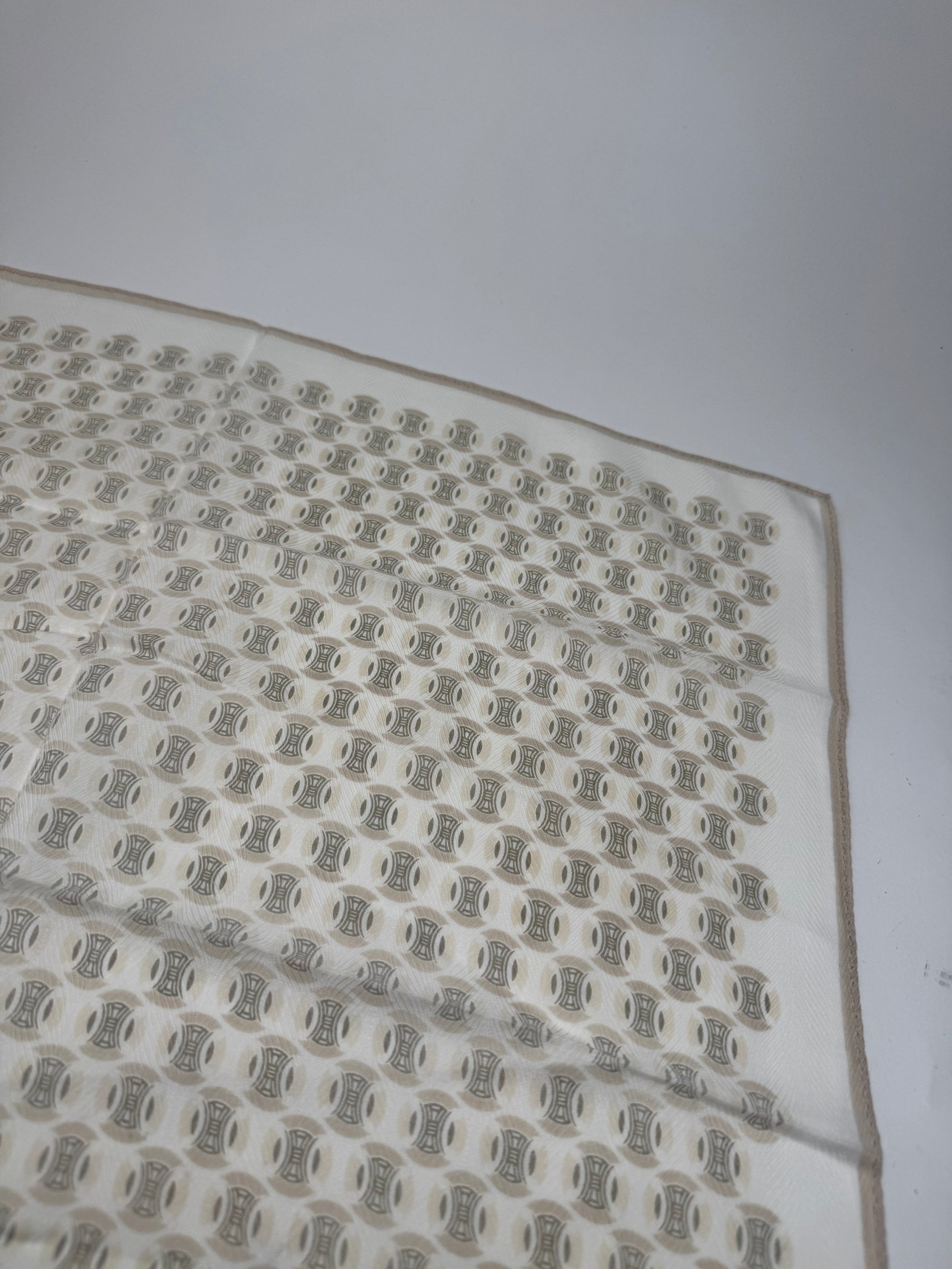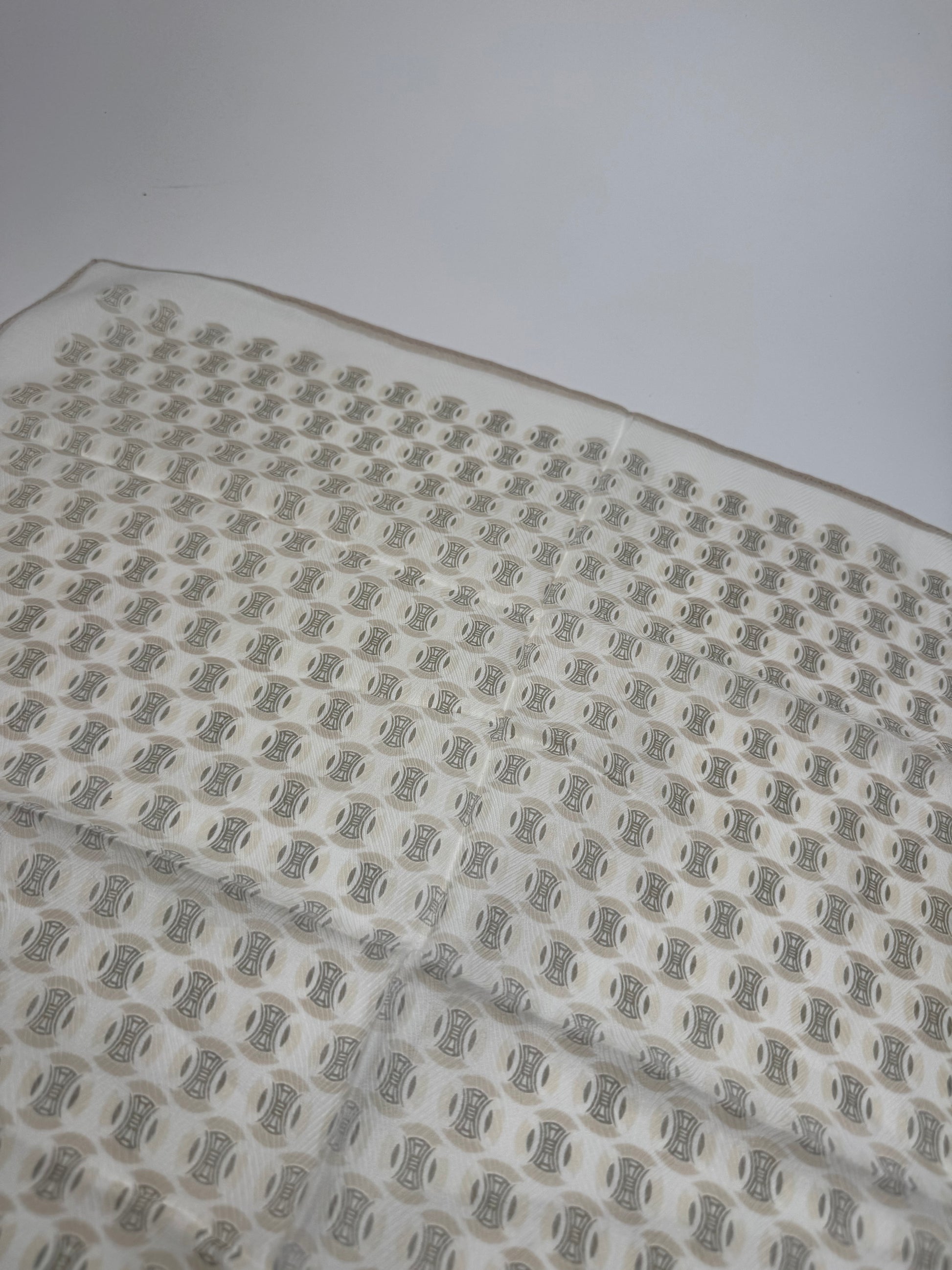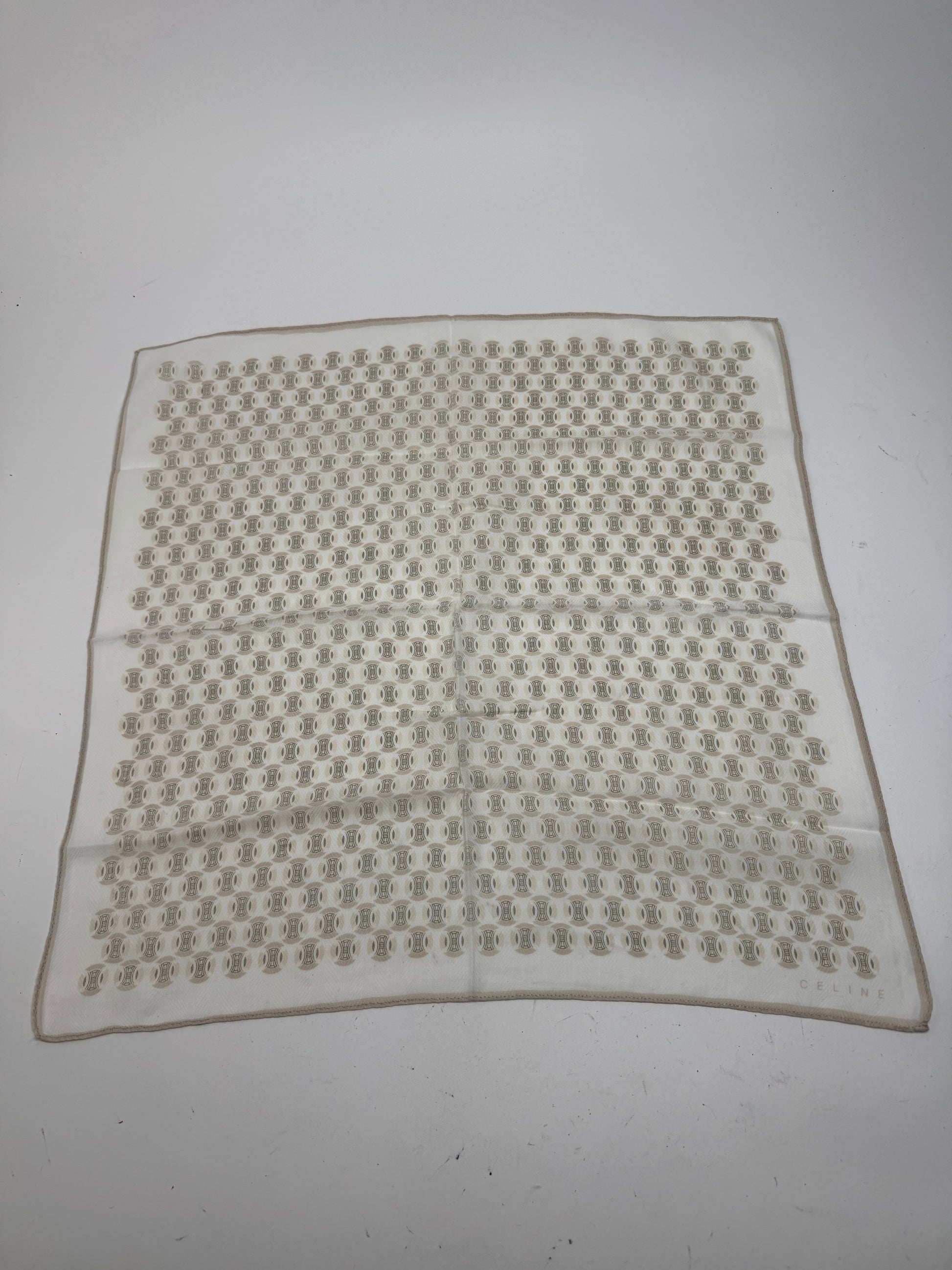 CELINE Triomphe Monogram Scarf. This vintage scarf is crafted from a luxurious blend of silk and cotton with a white base and a subtle light brown border. It features the iconic Celine Triomphe monogram print throughout. The Triomphe monogram, first introduced in the 1970s, was inspired by the chain surrounding the Arc de Triomphe in Paris and remains a timeless symbol of the brand’s heritage.