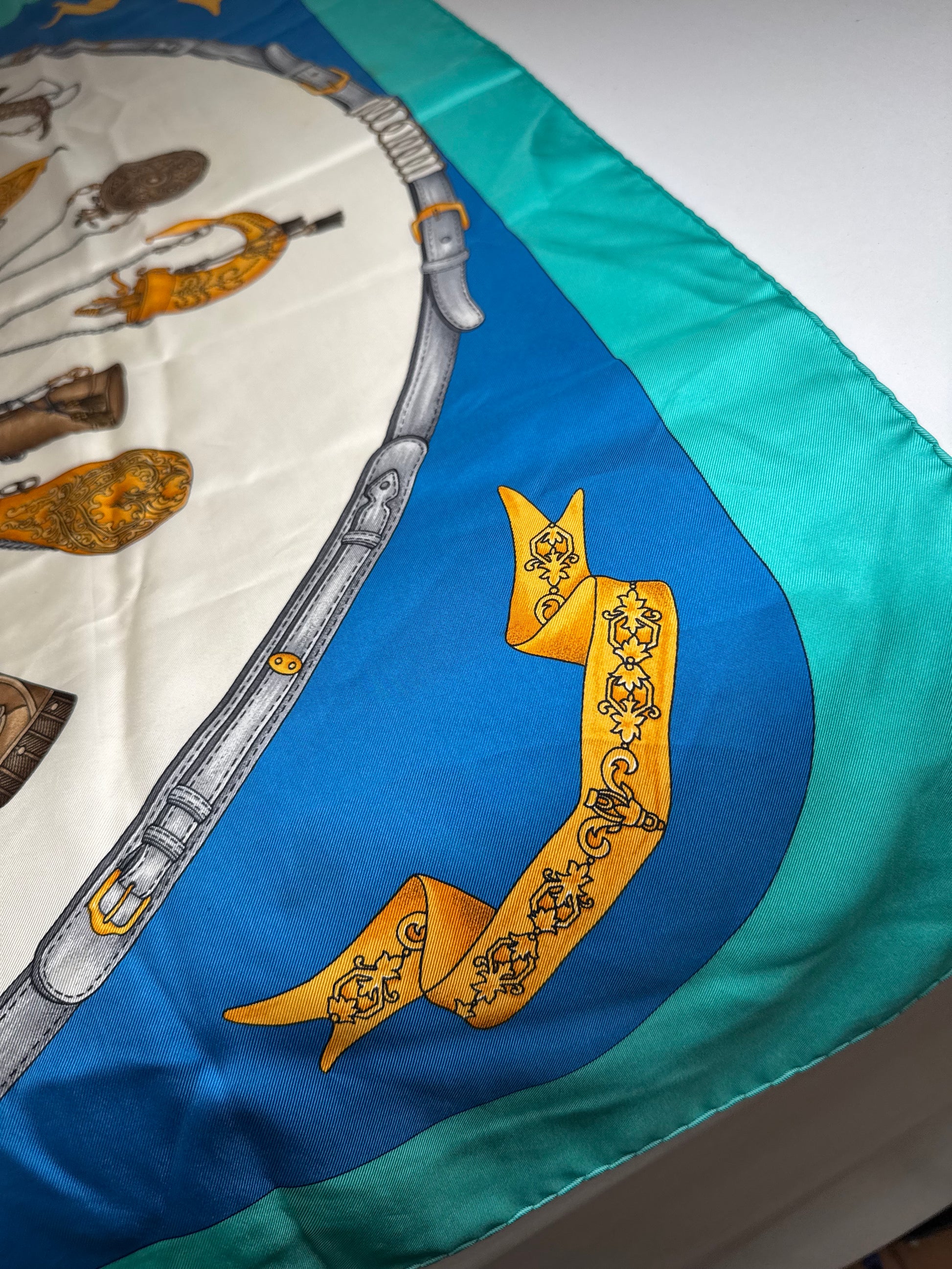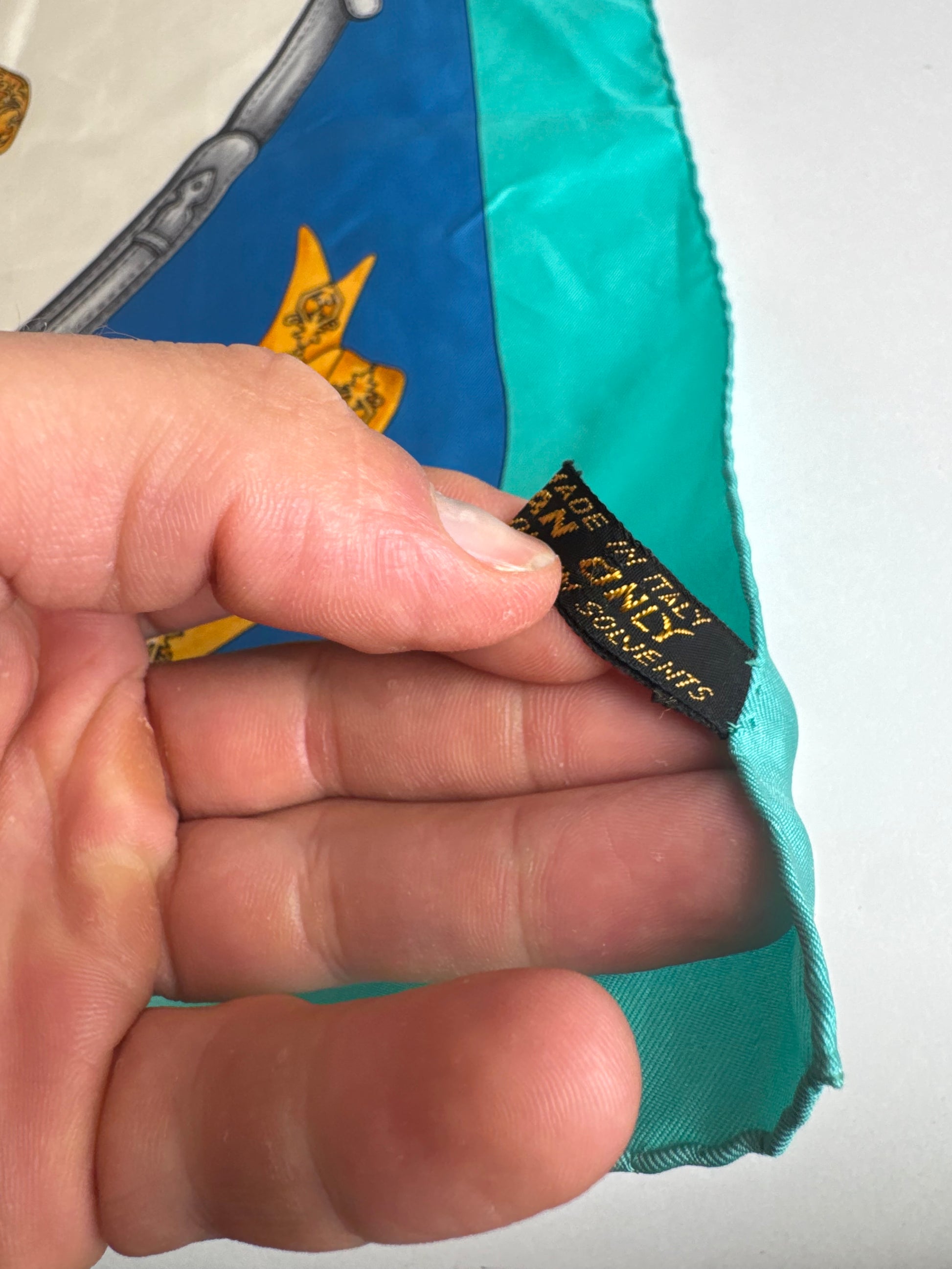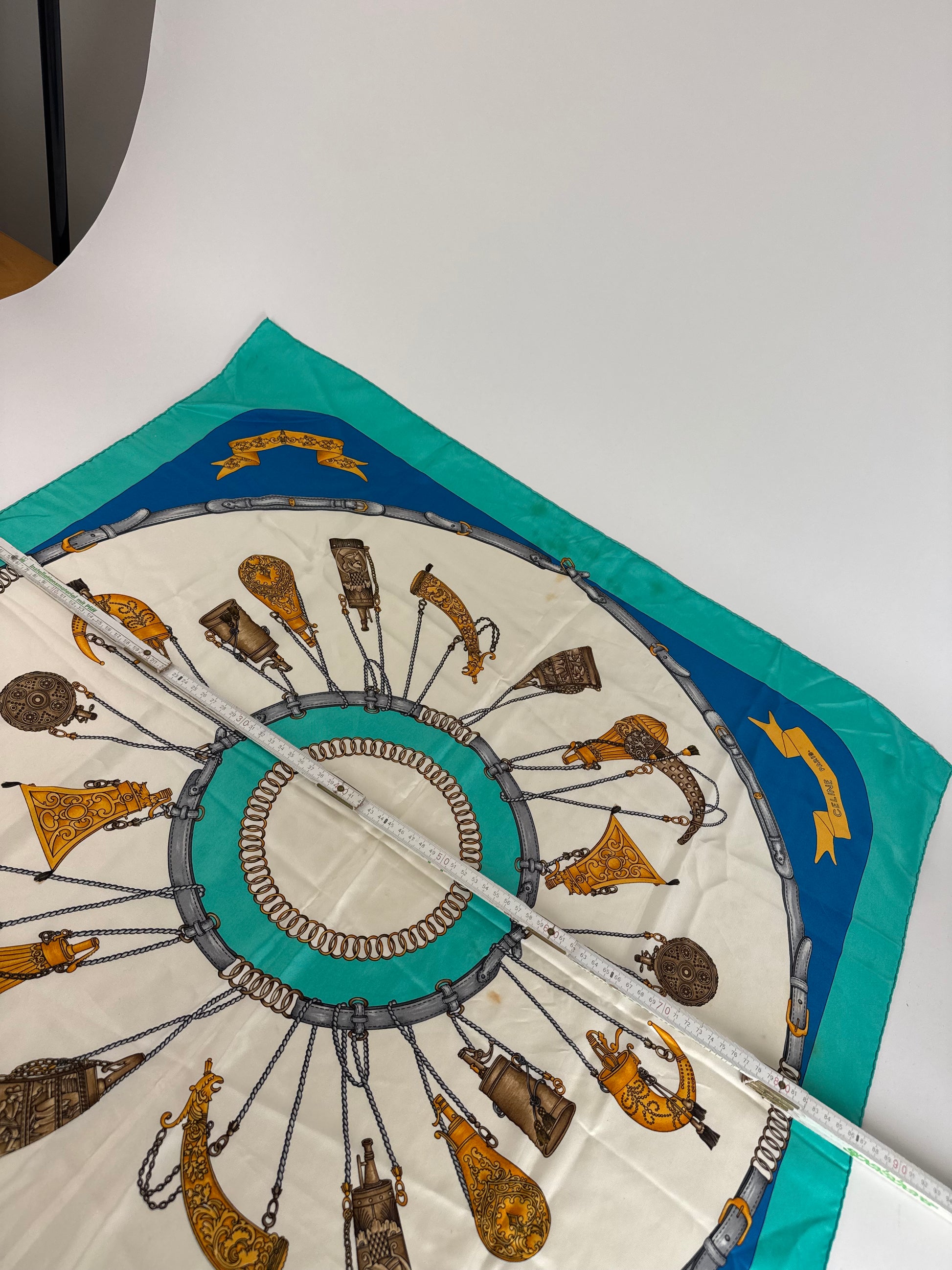 This vintage scarf is finely crafted of 100% silk and features a richly detailed, baroque-inspired design. It has a turquoise border, followed by a deep blue section adorned with yellow ribbons bearing the Céline name. At the center, a white and grey-edged circle showcases golden and brown abstract motifs—bells, horns, and bottles—interlinked in an ornate composition.