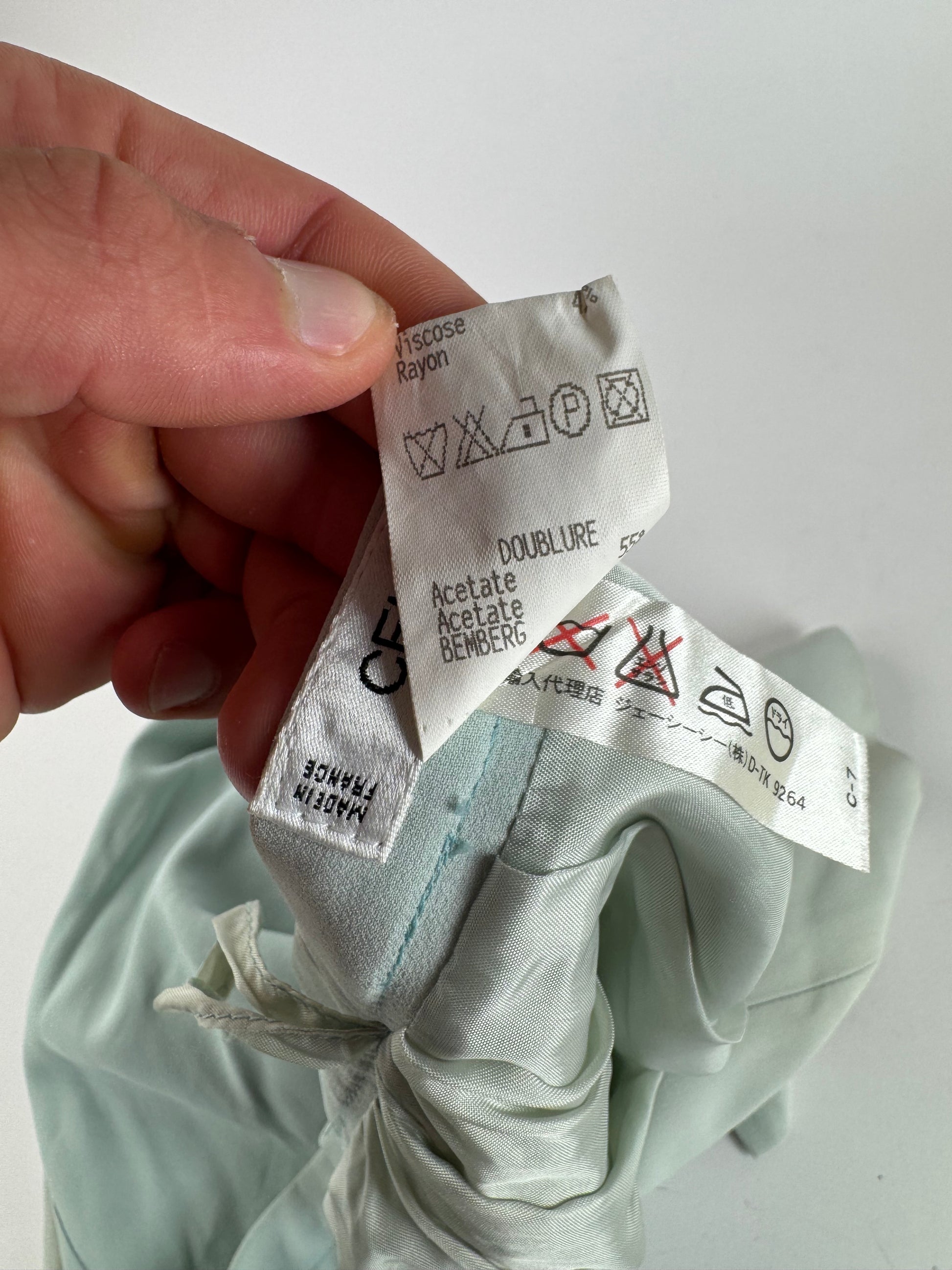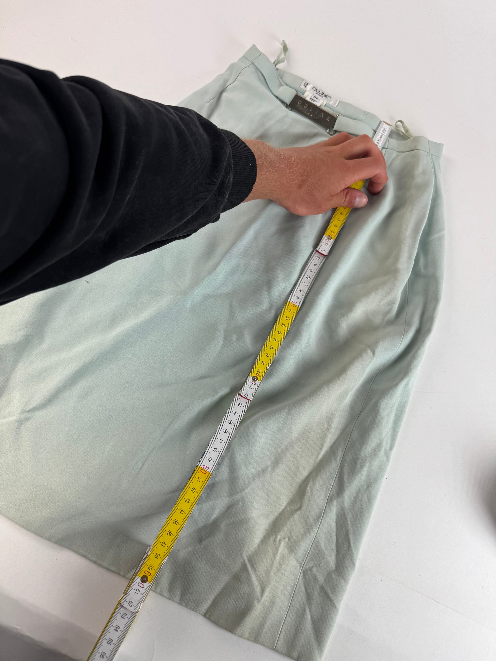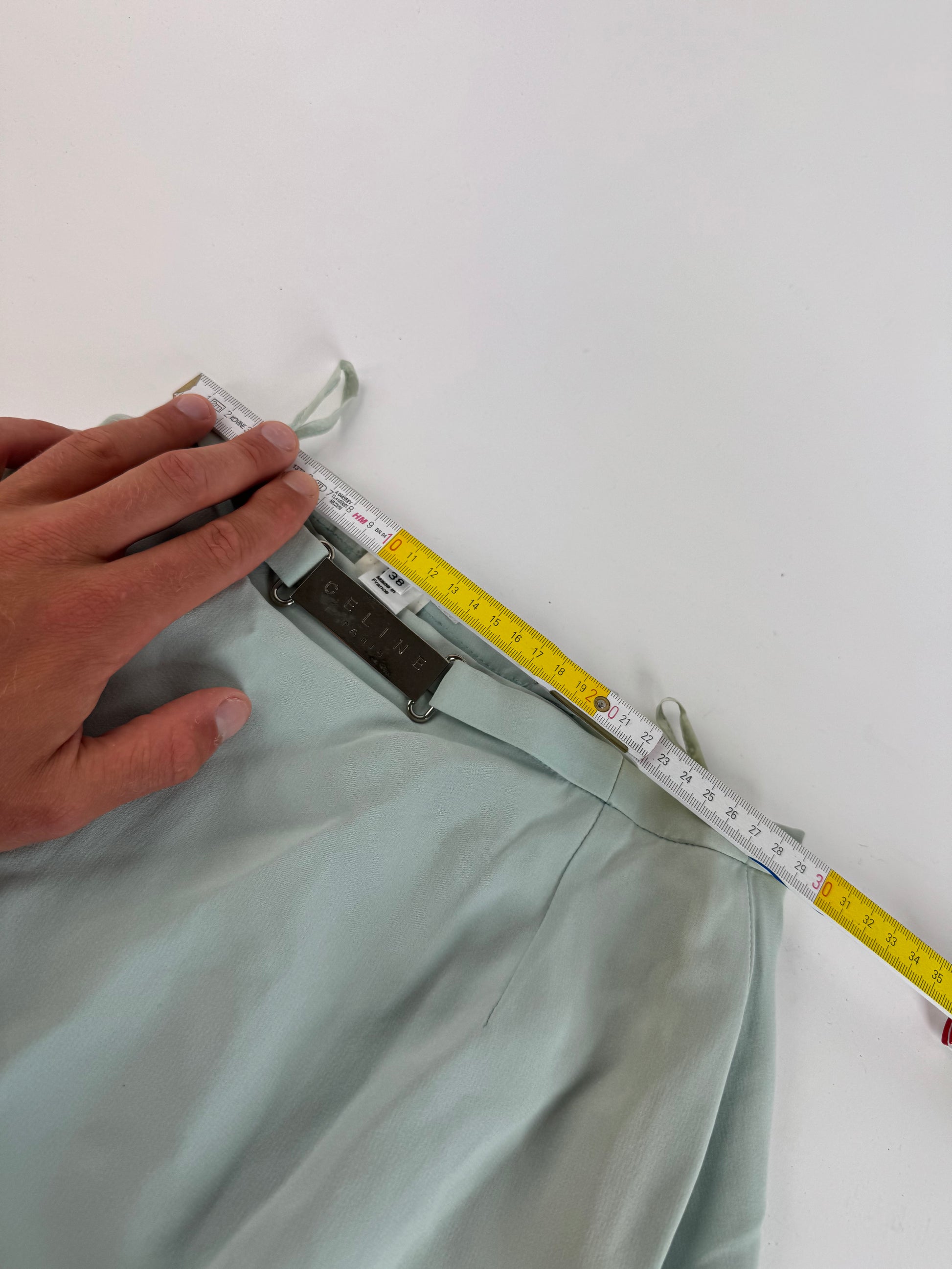 CELINE PARIS Turquoise Acetate Blend Skirt. This vintage skirt is crafted from a turquoise acetate-viscose blend and features a matching fabric belt with gold-tone hardware. Made in France.