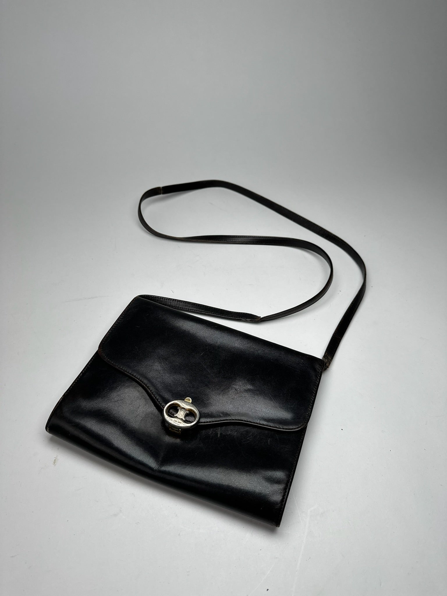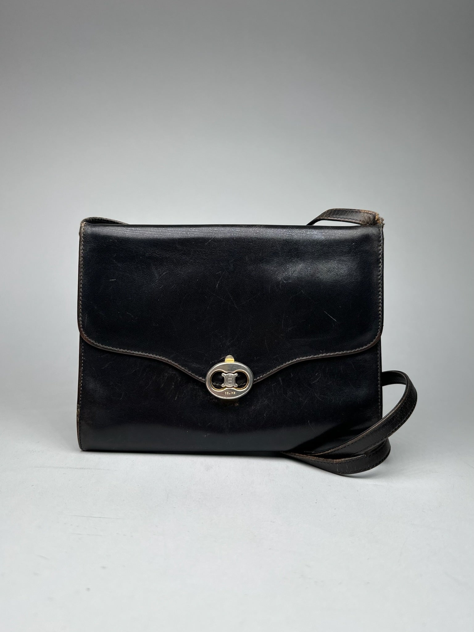 This chic handbag, model Triomphe, is crafted with a structured silhouette and features a flap closure in polished gold-toned steel. The bag can be carried by hand or worn as a shoulder bag, making it a versatile unisex piece. The interior is lined in soft brown suede. Made in Italy.