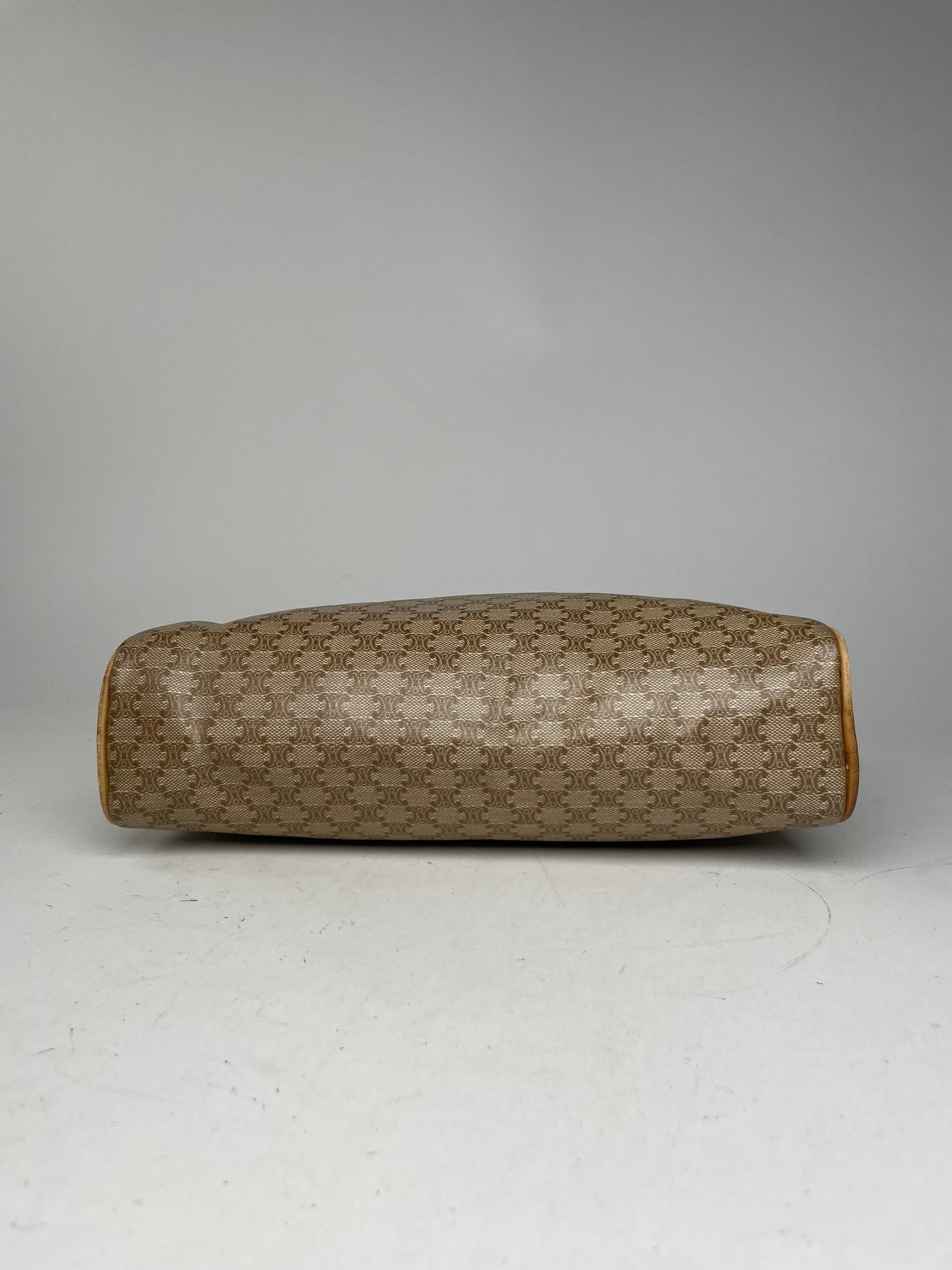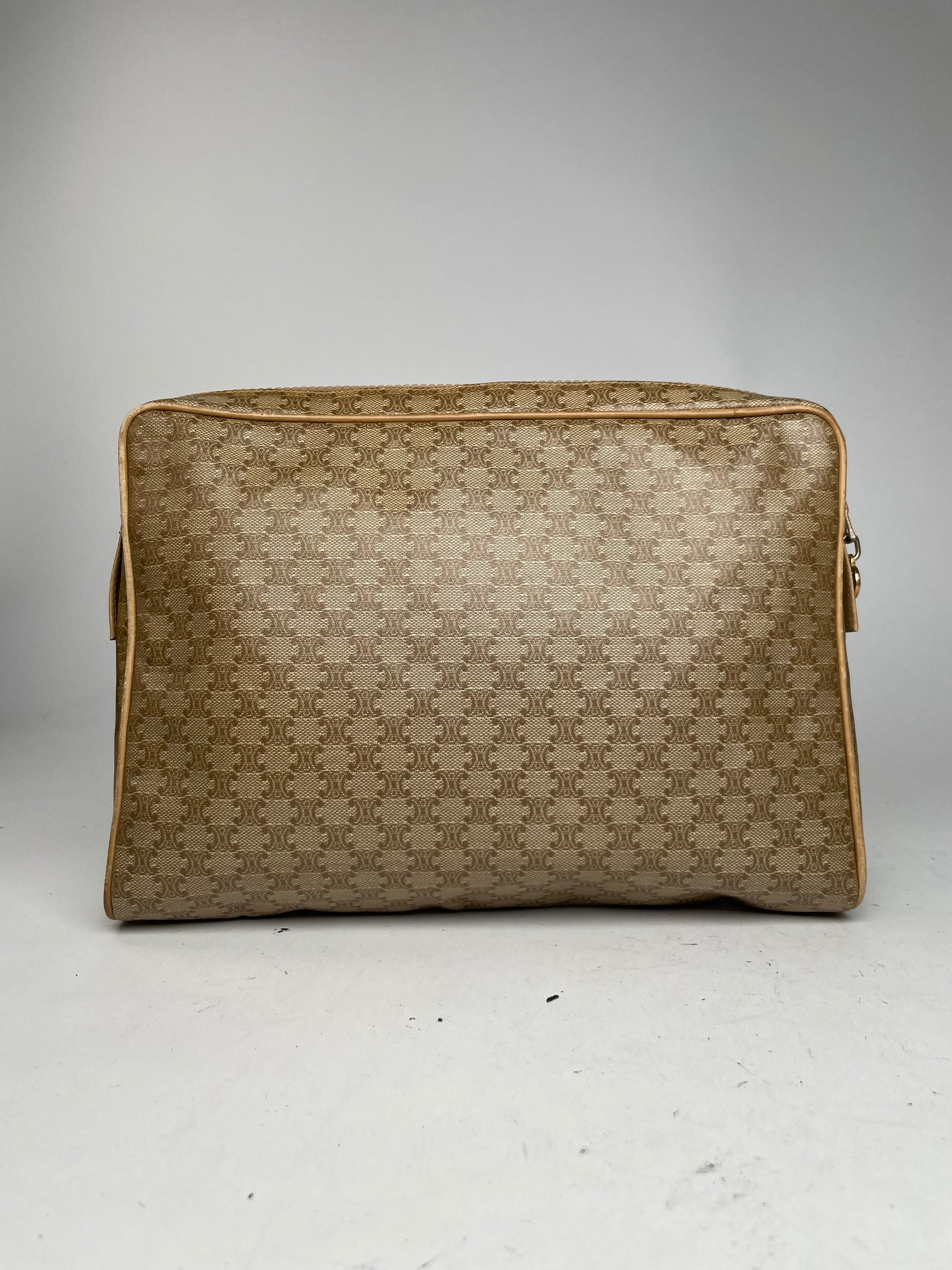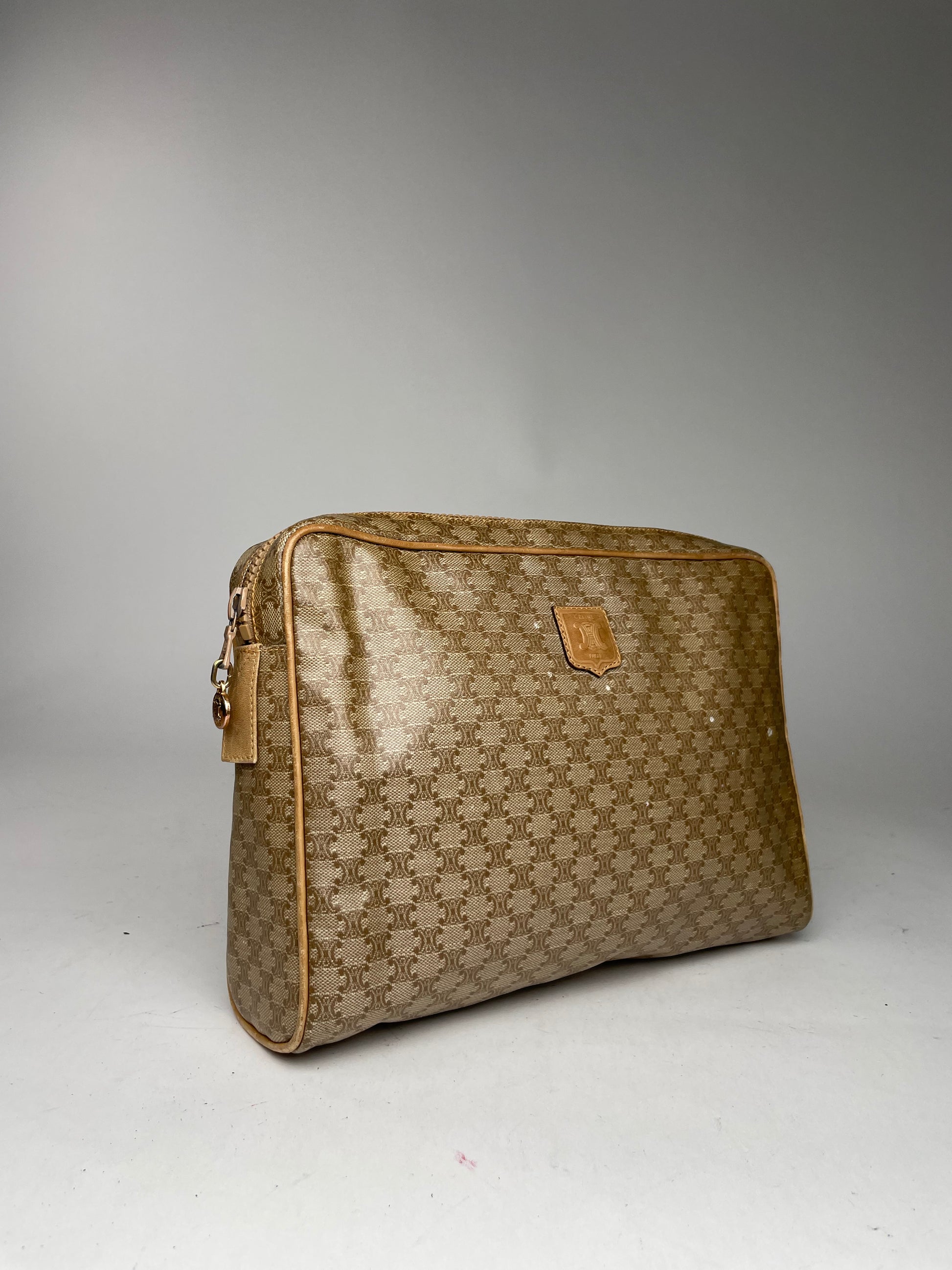 CELINE PARIS Vintage Triomphe Clutch. This elegant vintage clutch is crafted from beige leather featuring the iconic Celine monogram, accented with light brown leather details and bronze-tone steel hardware for a refined look.