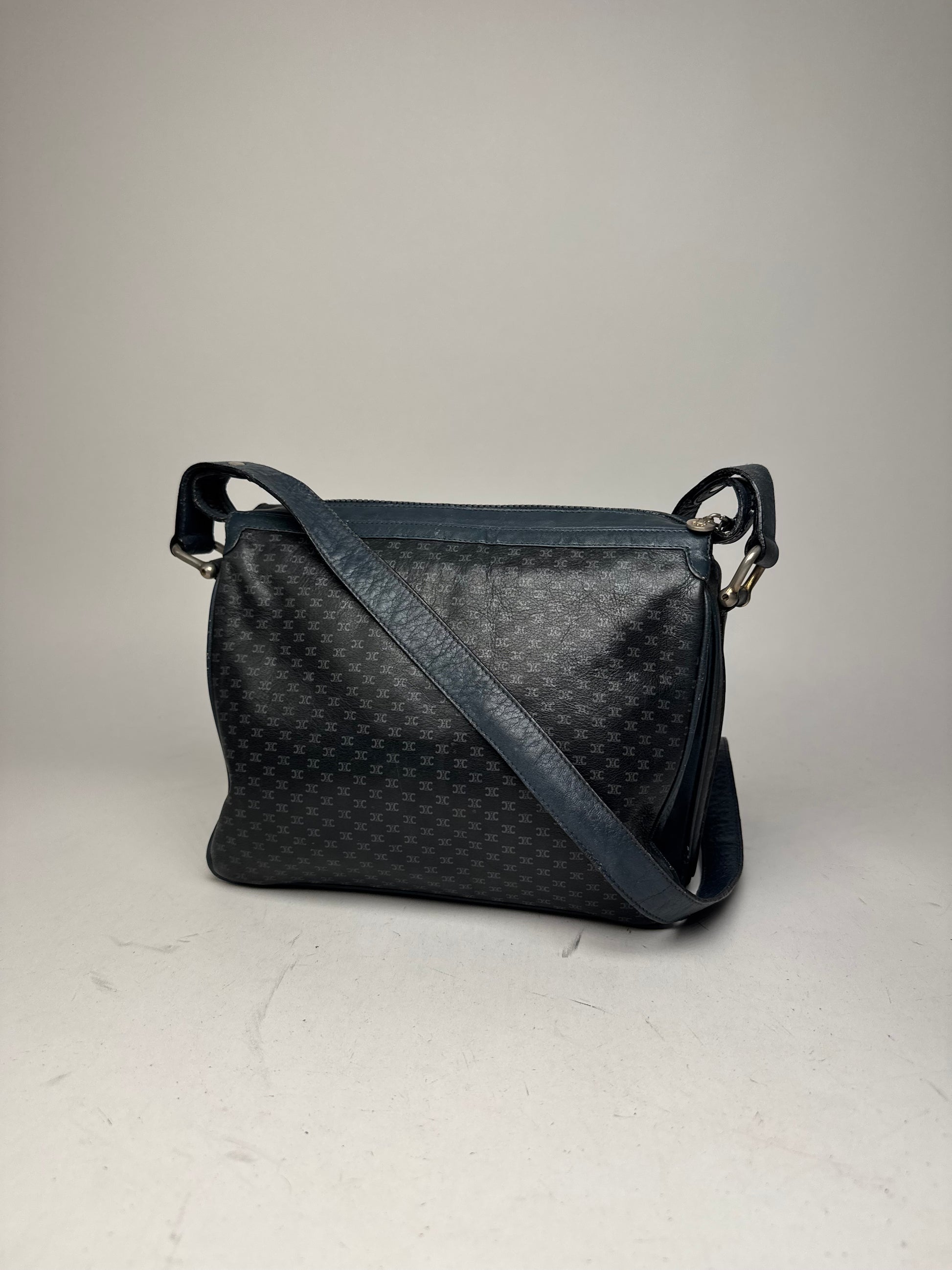 Vintage Celine Triomphe Monogram Leather Shoulder Bag navy Grey