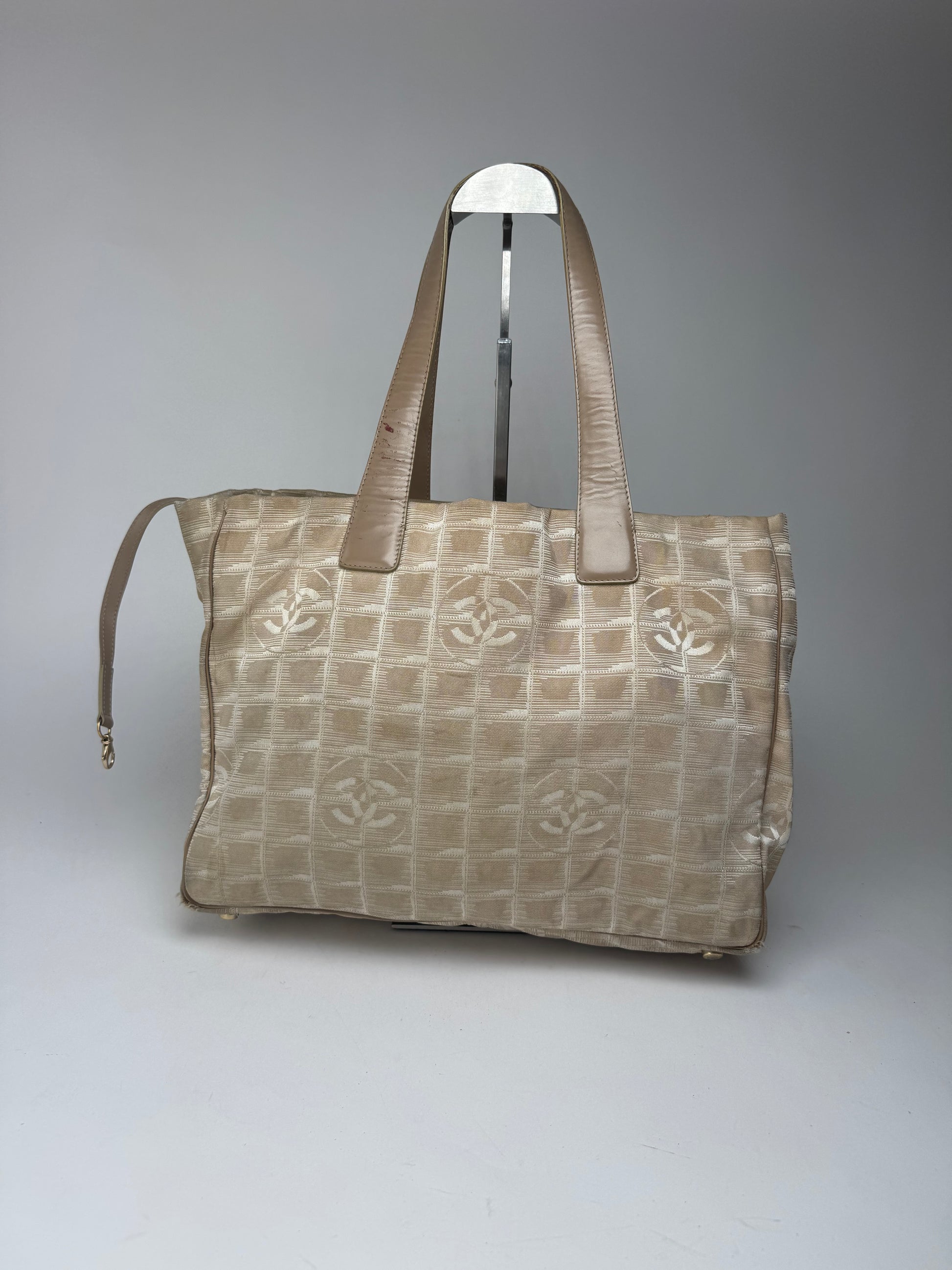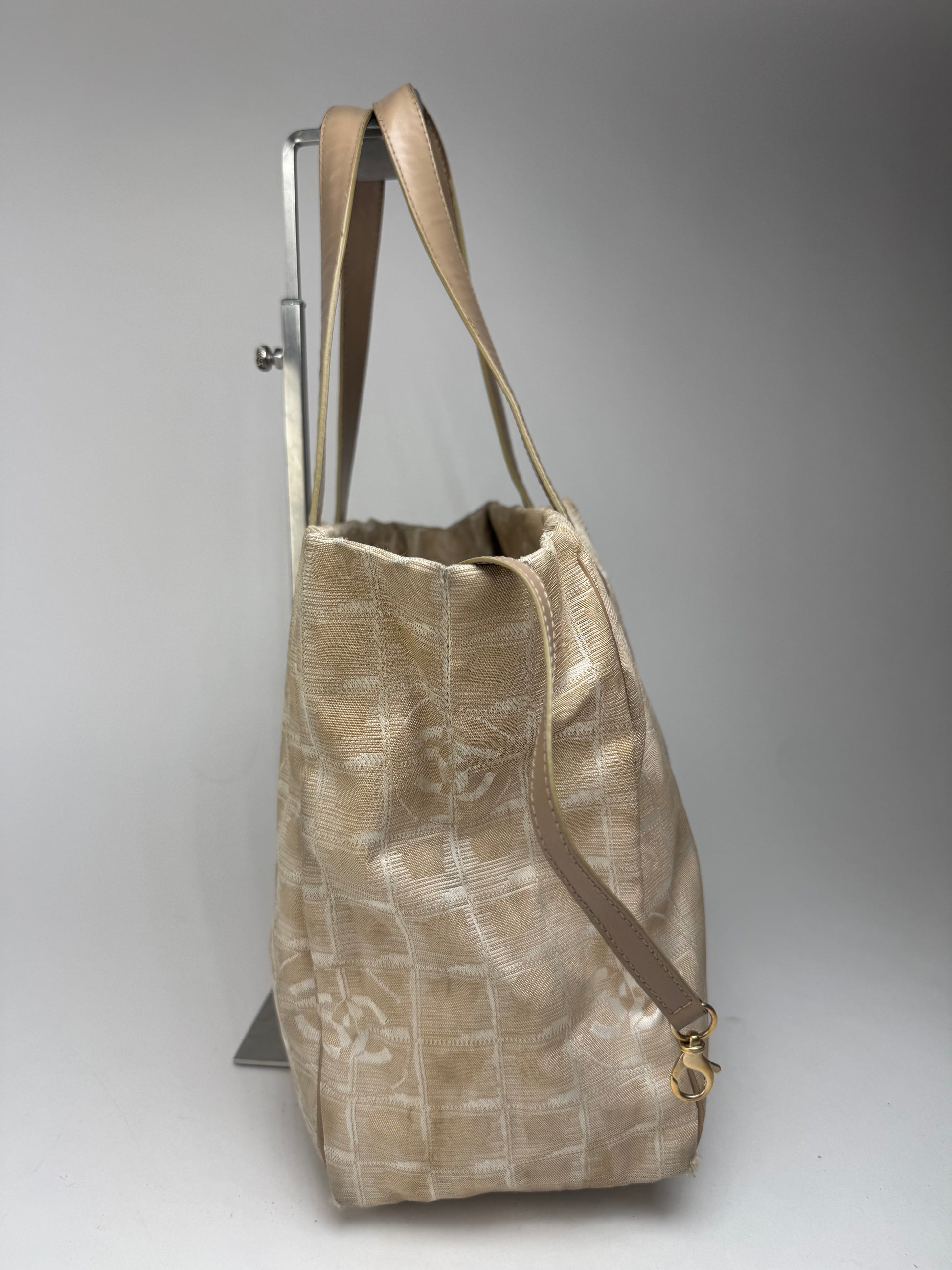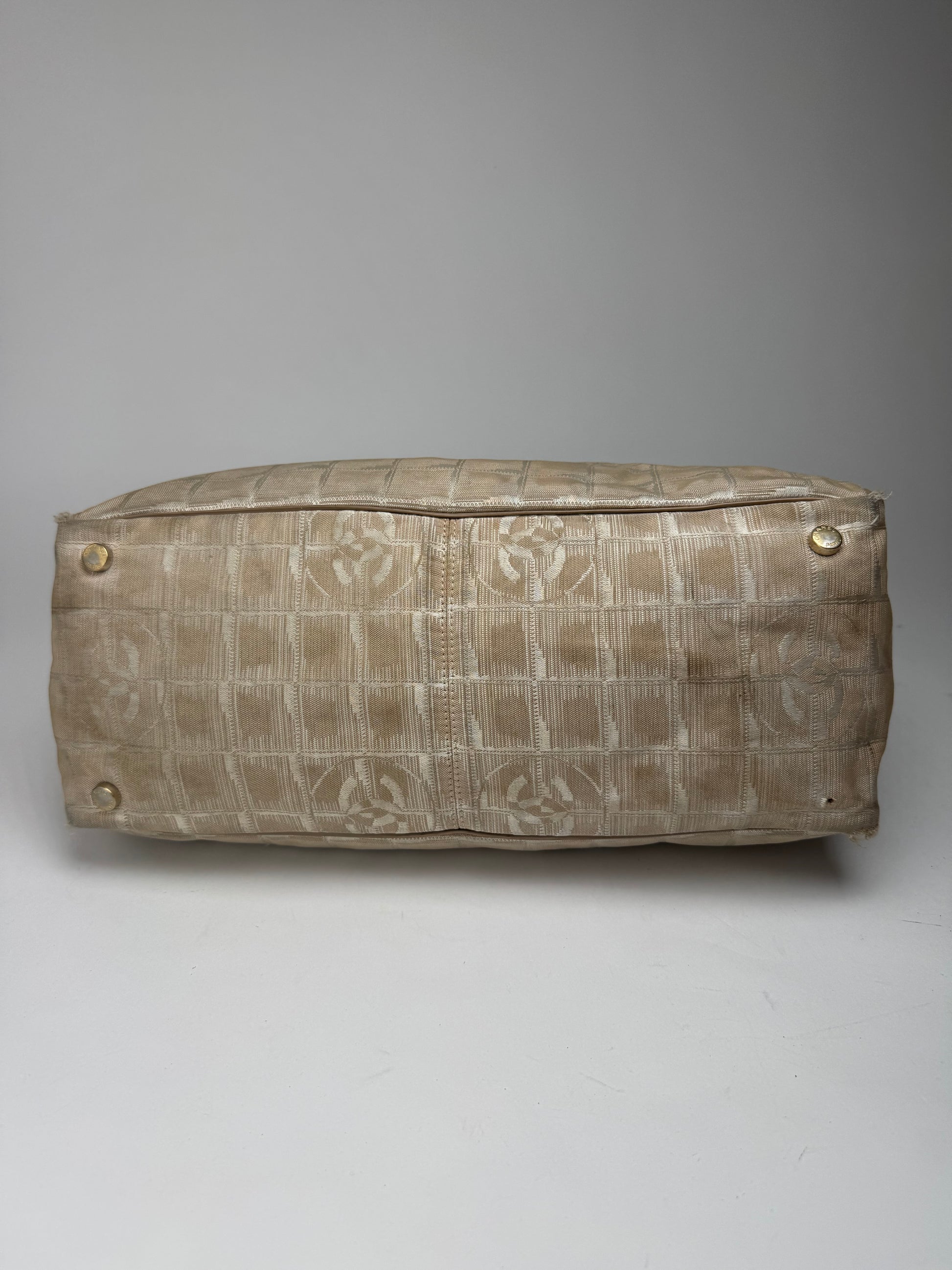 This vintage shopper bag is crafted from beige canvas featuring the iconic Chanel monogram, complemented by beige-brown leather handles and accents. The interior is lined with cream-colored polyester, and the bag is adorned with gold-tone hardware. Despite some stains and the absence of one of the four hardware feet on the base, the bag remains in very good condition. Made in Italy, it bears the serial number 9240016.