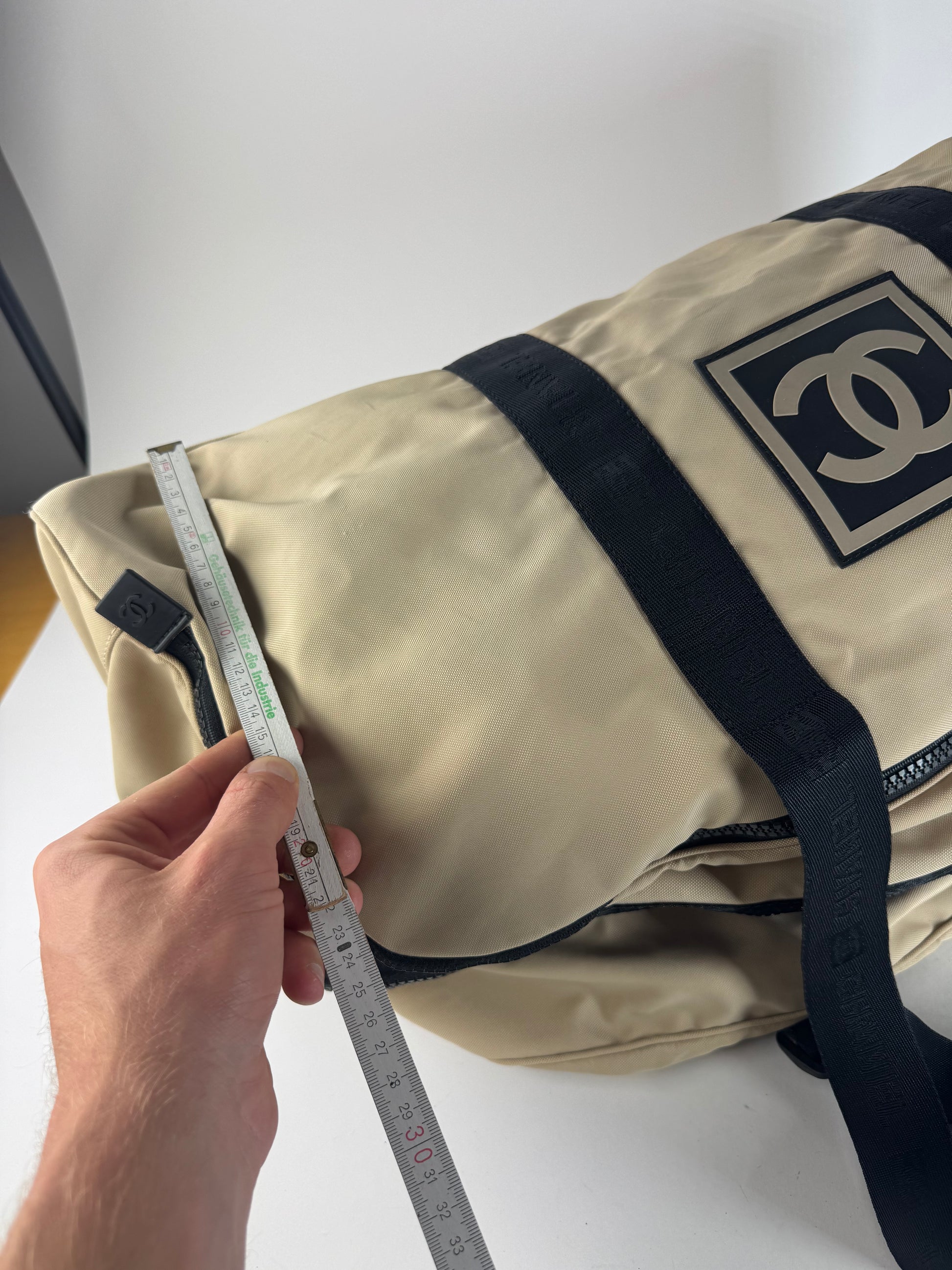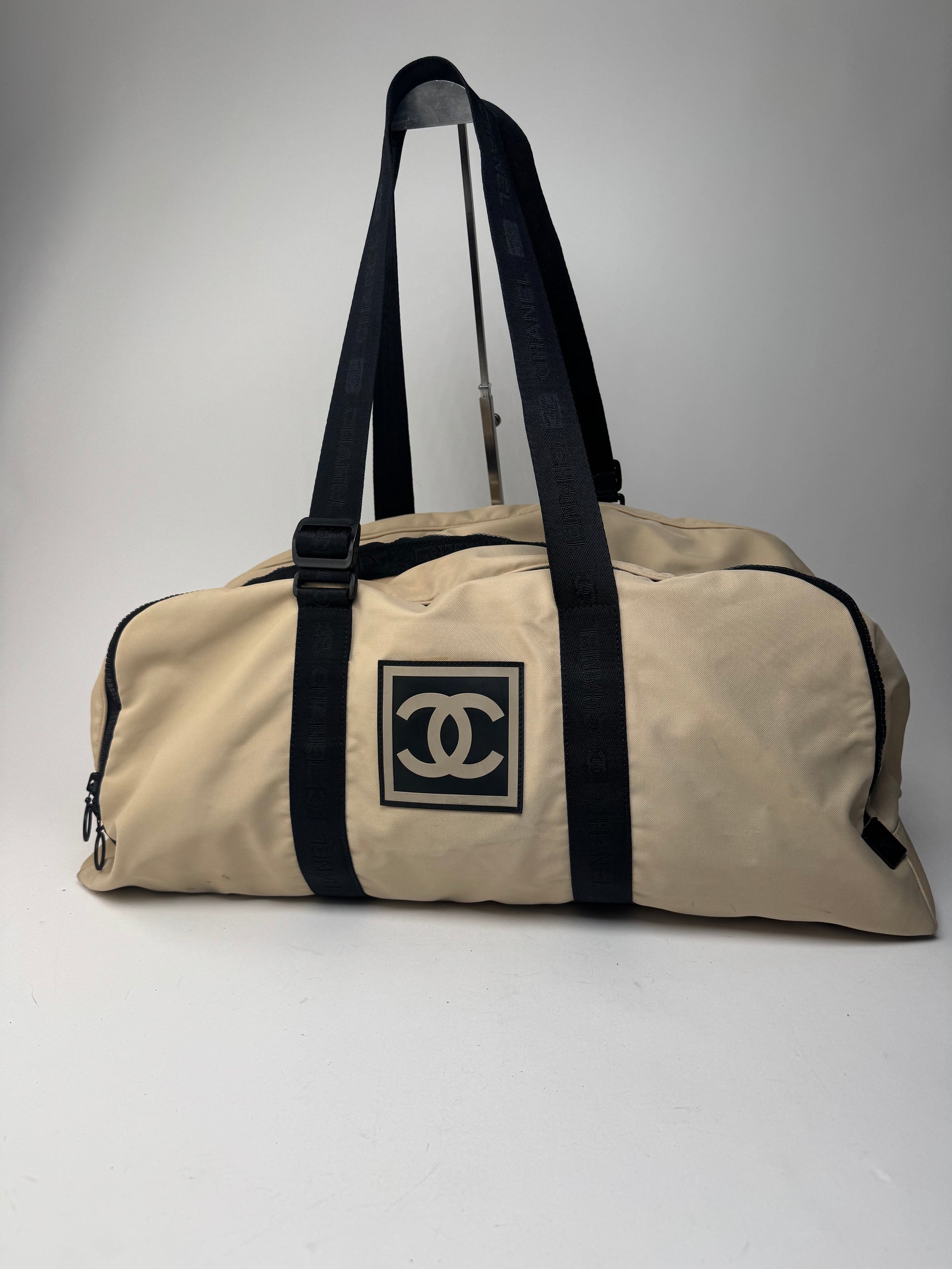 CHANEL Vintage Sports Duffle Bag. This exceptional duffle bag is crafted from grey-beige polyester and originates from the iconic Chanel Sport Collection, originally designed as a tennis bag. The bag features adjustable black canvas handles, a bold black plastic CC logo on the front, and three large exterior zip compartments with black steel zippers. The top opens to a spacious interior lined with black canvas featuring woven Chanel lettering.