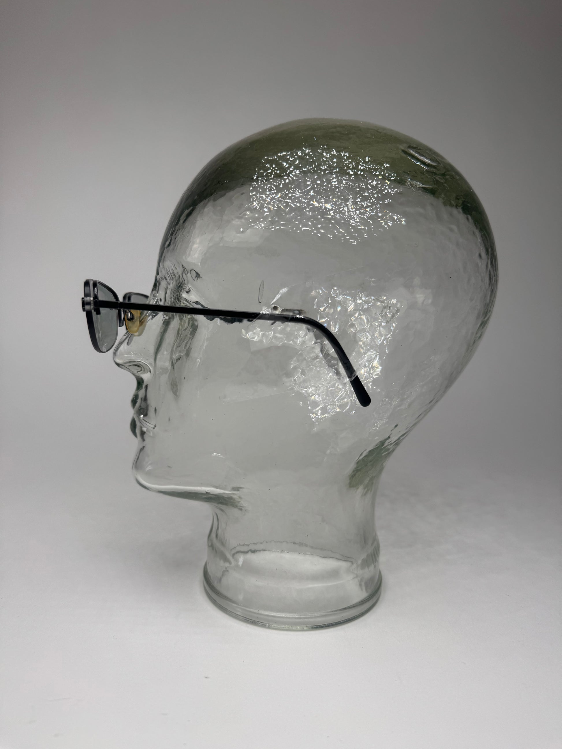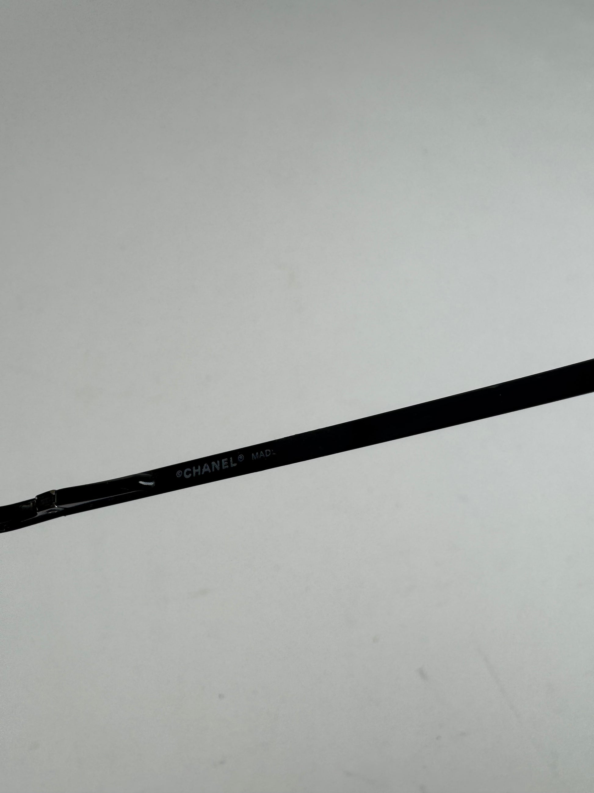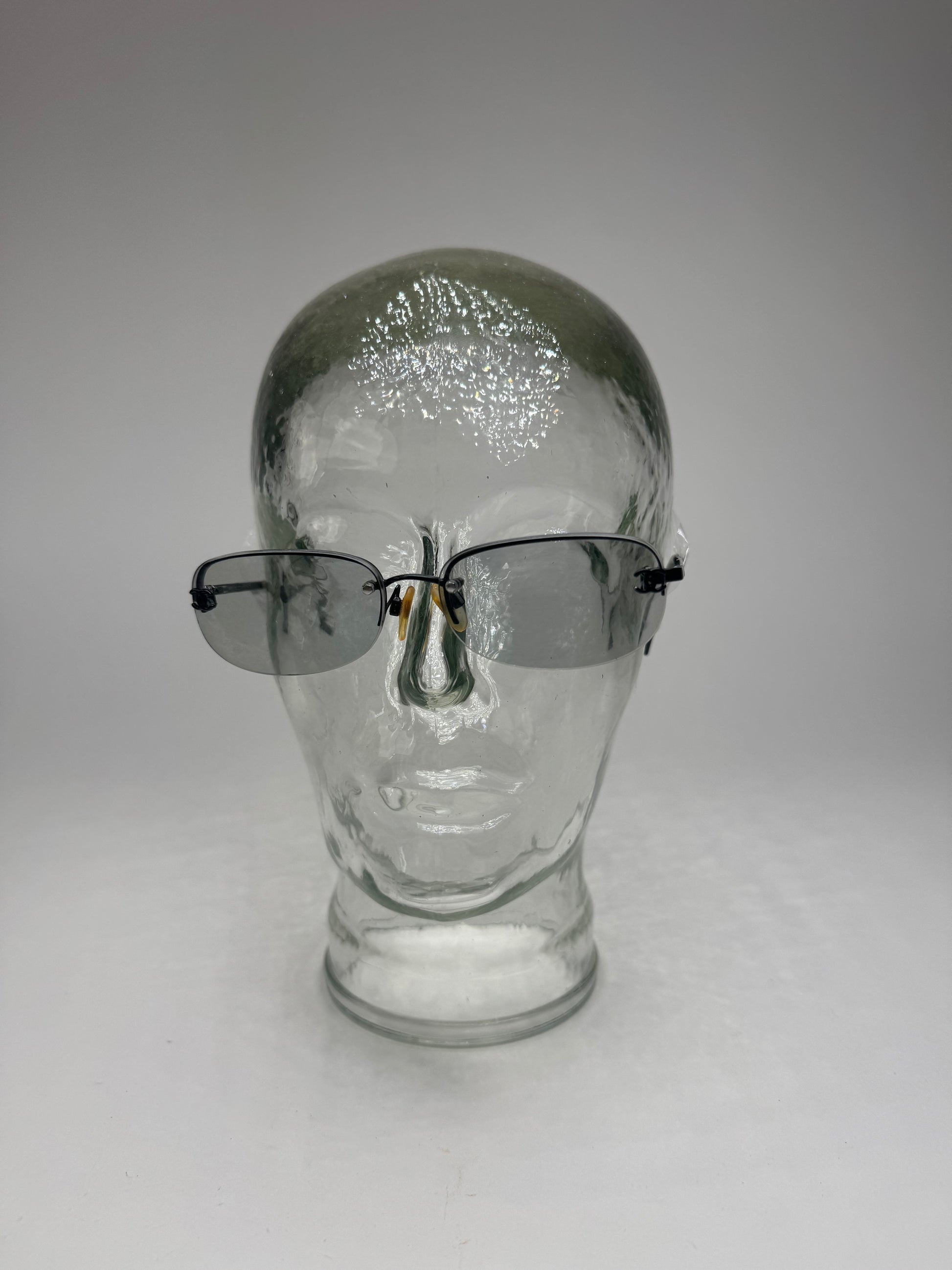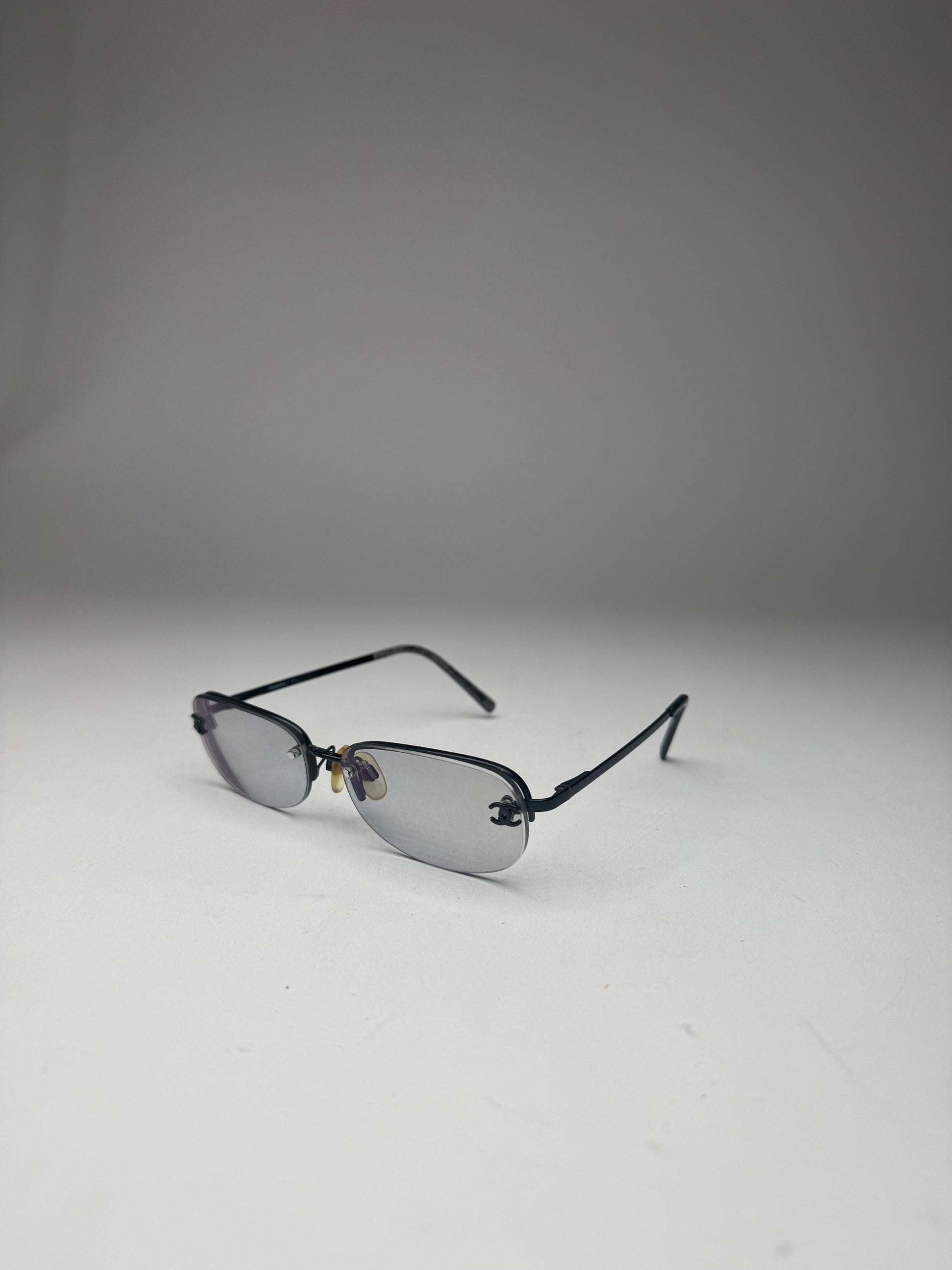 This elegant vintage rimless sunglasses are finely designed with slightly blue-tinted lenses. Adorning the lenses are iconic Chanel Double-C appliqués in anthracite-colored steel, adding a touch of luxury and brand recognition. The temples are crafted from black steel, combining durability with a sleek look. Proudly made in Italy, the sunglasses come with a grey glasses case.