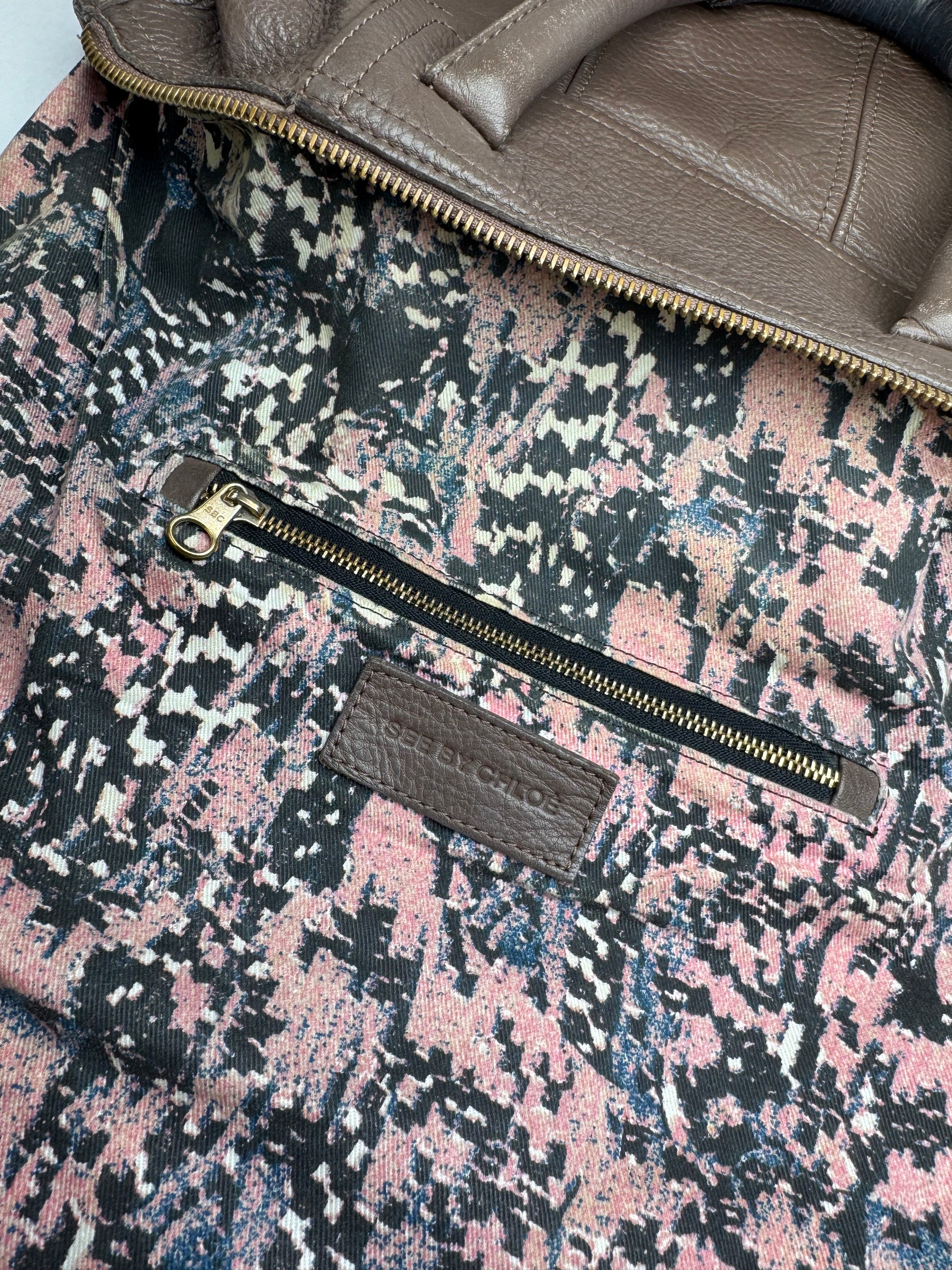 CHLOÉ Vintage 2-Way Handbag. This chic handbag is finely crafted of dark brown leather with gold-tone steel hardware. The bag features two mid-length handles, an optional shoulder strap with a snap-button closure, and two zippered compartments on the front. It opens to a pink-black-white-lilac patterned canvas interior. The sale includes a C by Chloé dustbag.