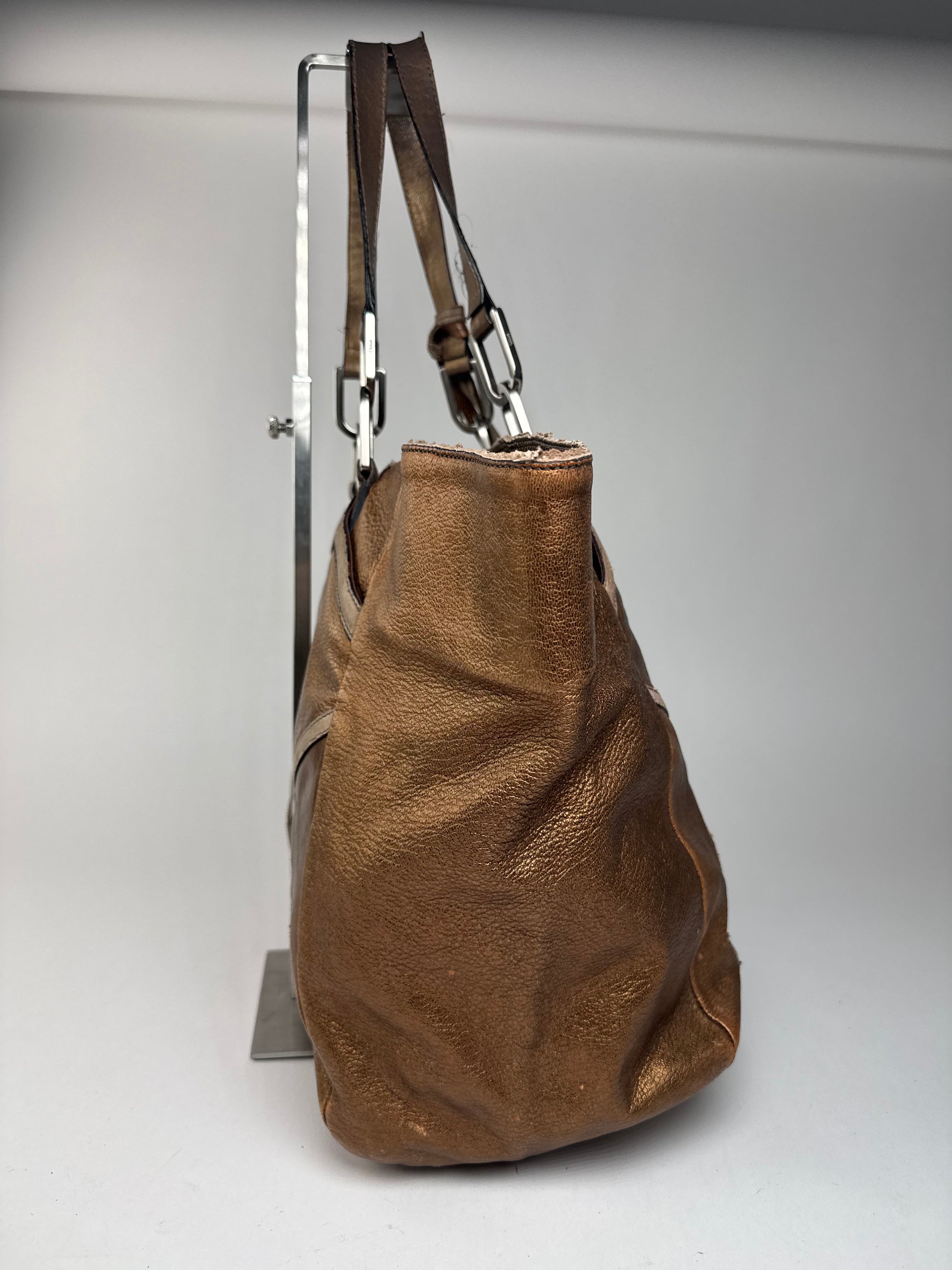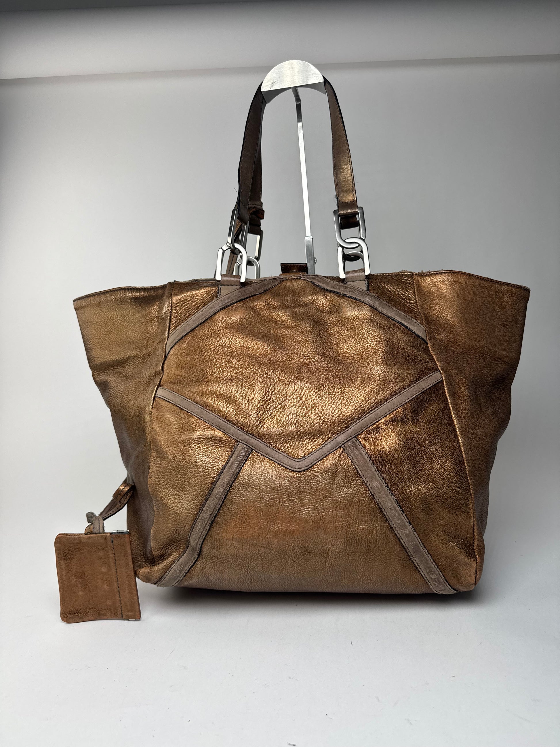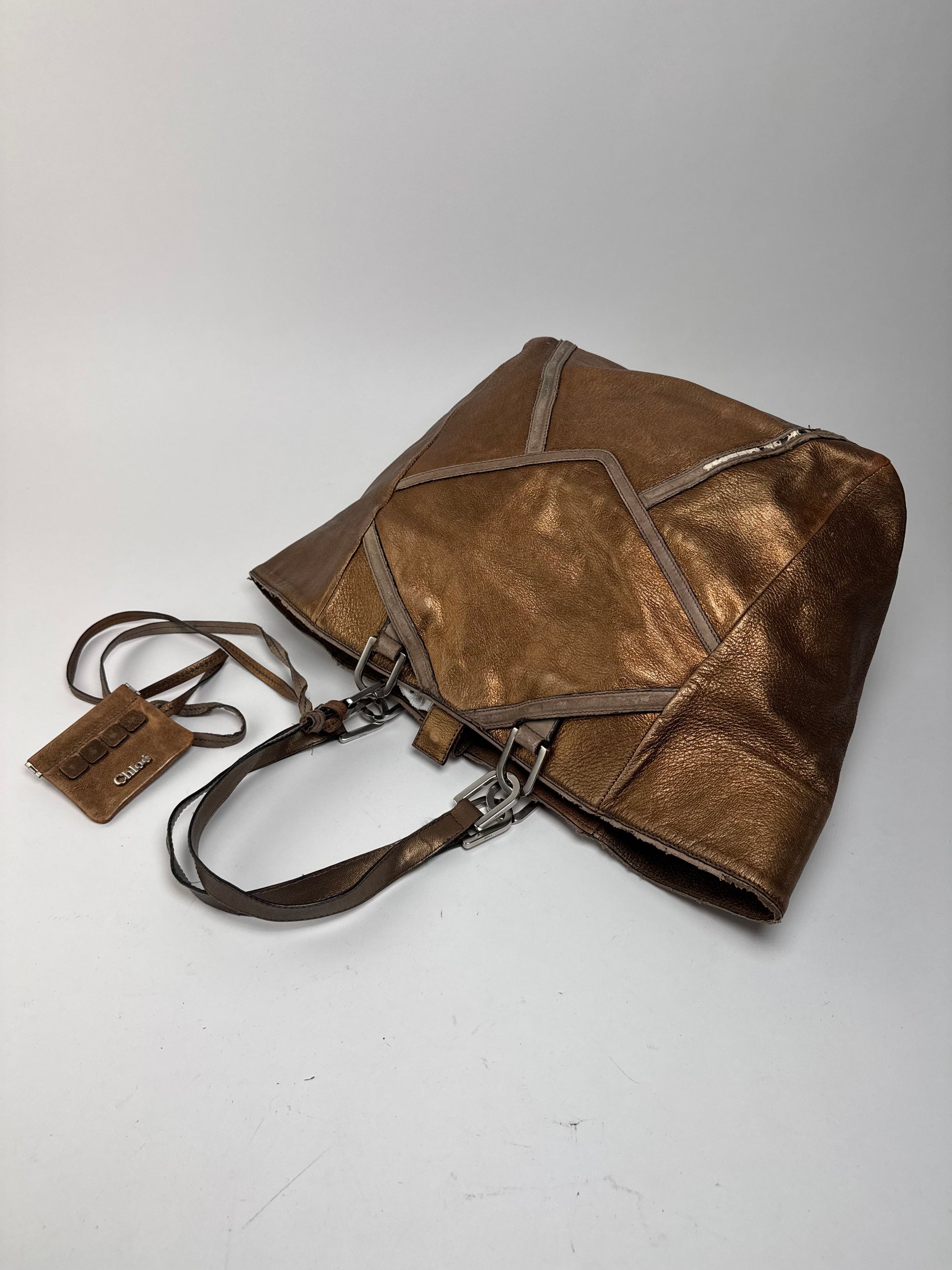 CHLOÉ Vintage Metallic Bronze Leather Shopper Bag. This striking vintage shopper is crafted from metallic bronze leather and features silver-tone steel hardware. It has two long handles for comfortable shoulder wear and includes a small detachable pouch attached to one of the straps. The interior is lined in brown canvas and closes with a magnetic snap. Made in Italy, this spacious design offers both style and practicality.