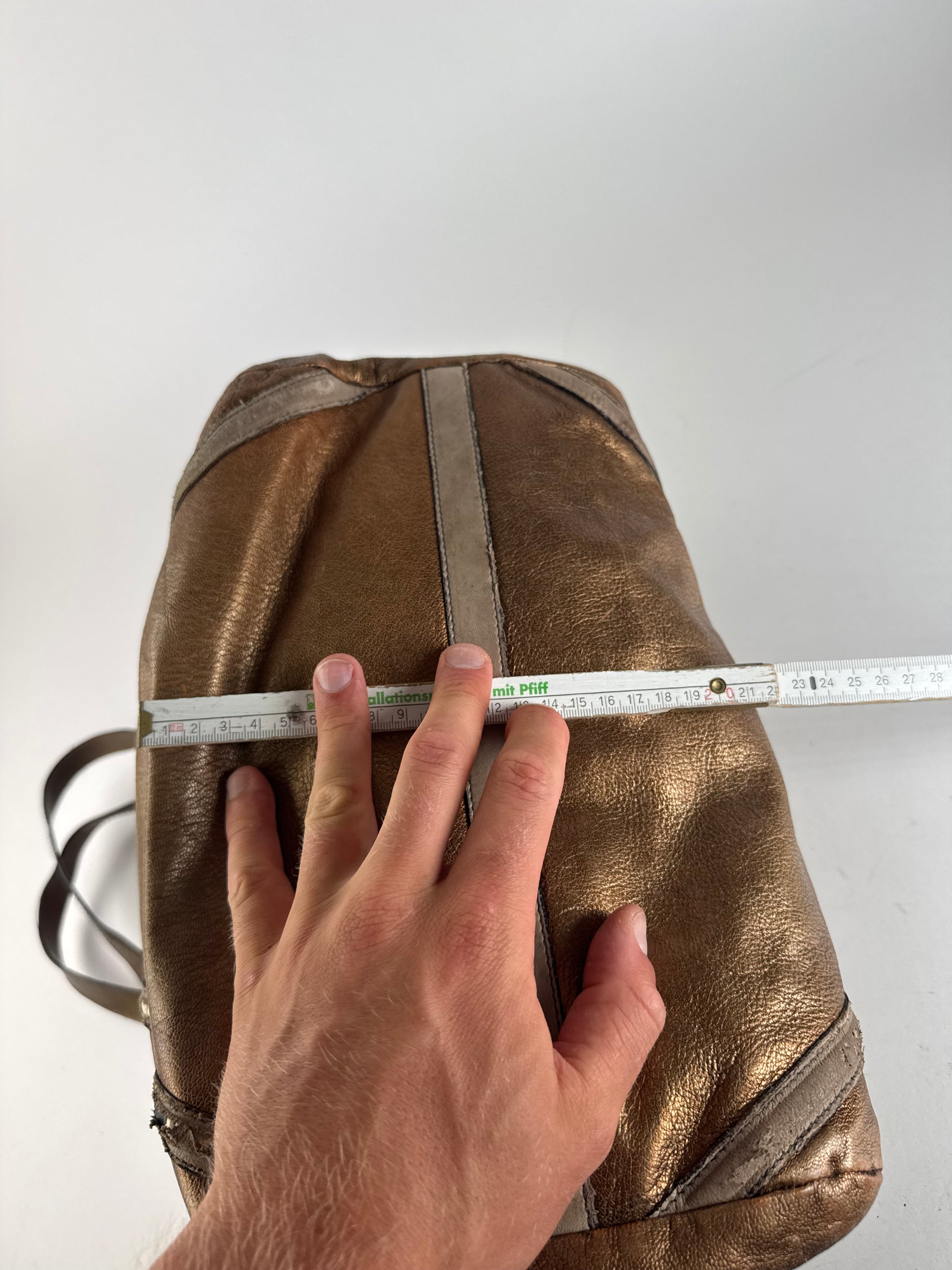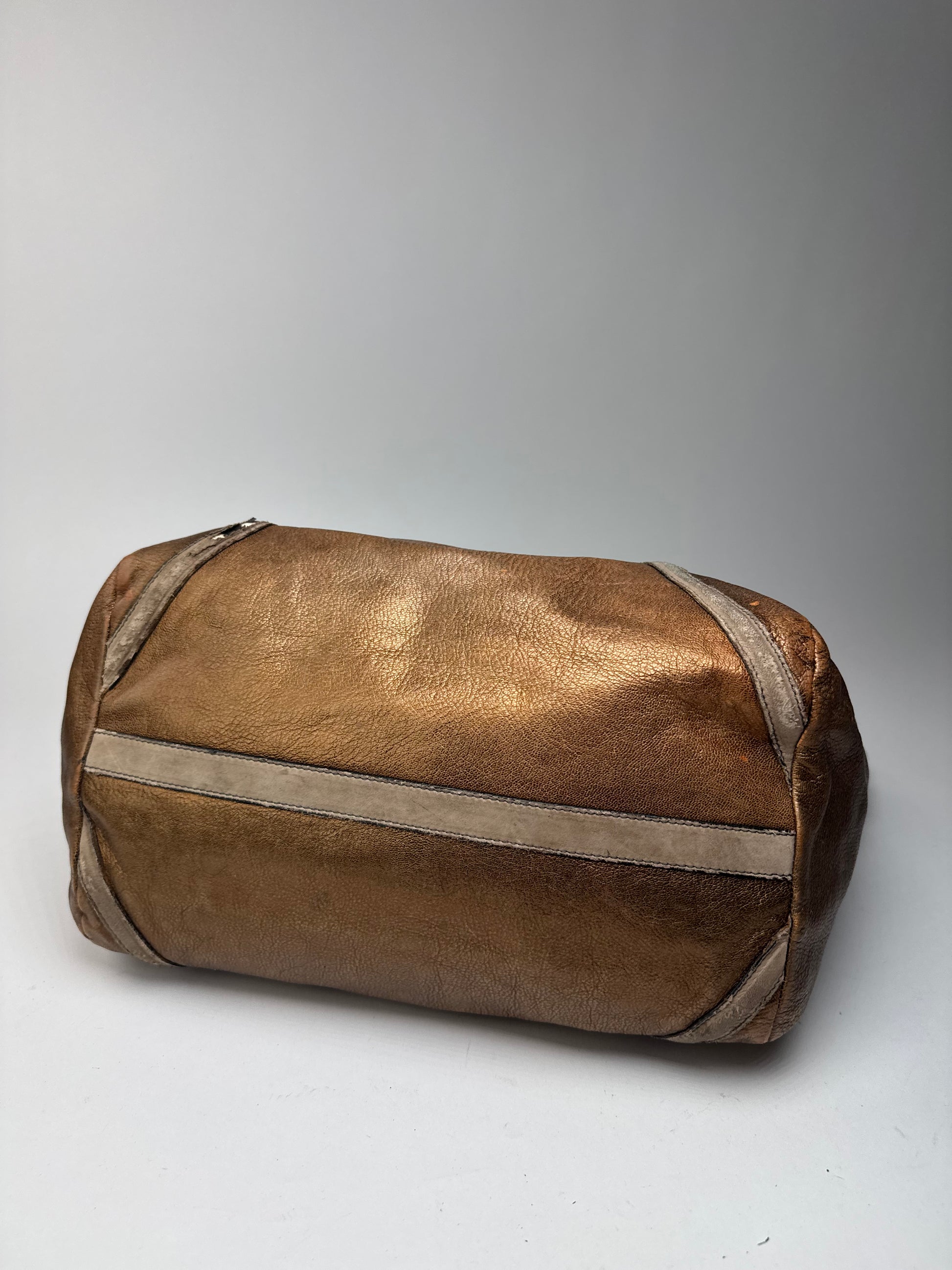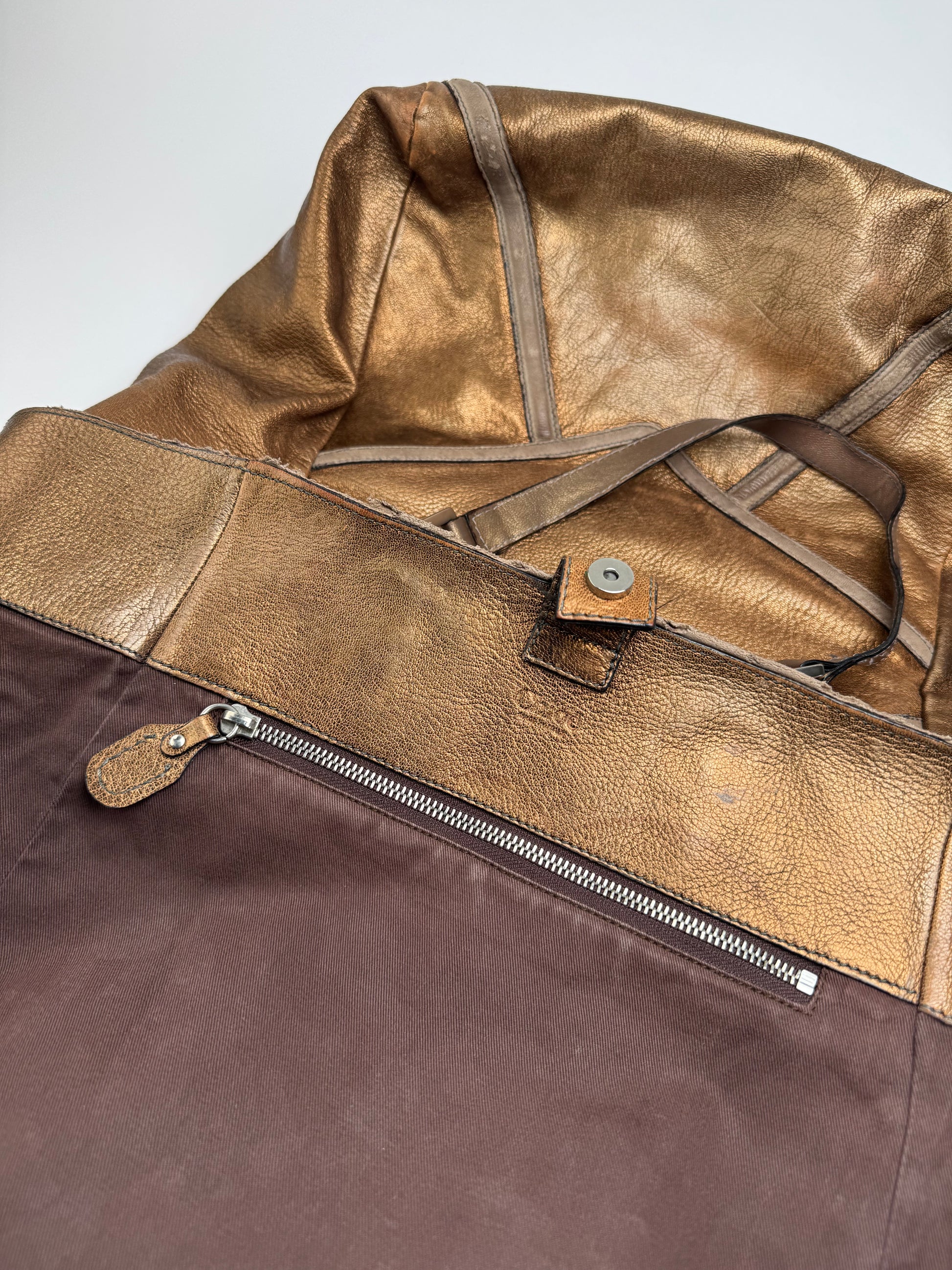 CHLOÉ Vintage Metallic Bronze Leather Shopper Bag. This striking vintage shopper is crafted from metallic bronze leather and features silver-tone steel hardware. It has two long handles for comfortable shoulder wear and includes a small detachable pouch attached to one of the straps. The interior is lined in brown canvas and closes with a magnetic snap. Made in Italy, this spacious design offers both style and practicality.
