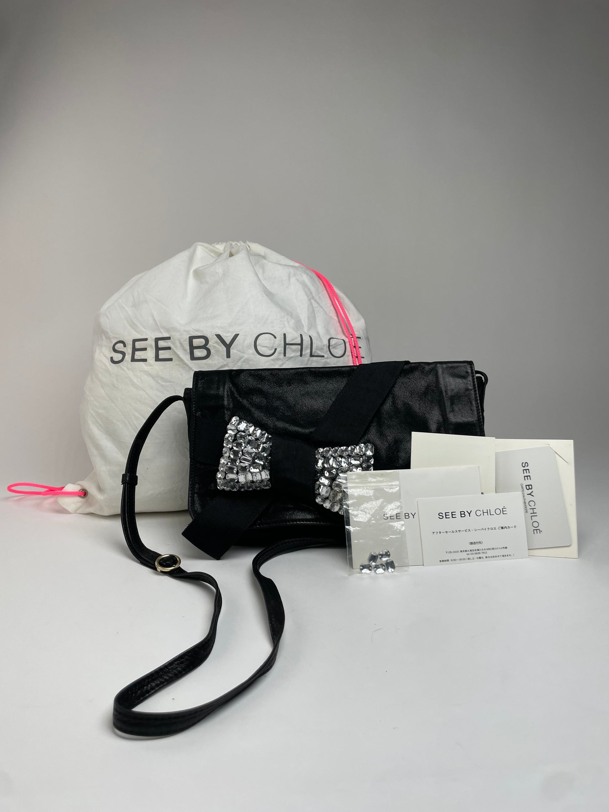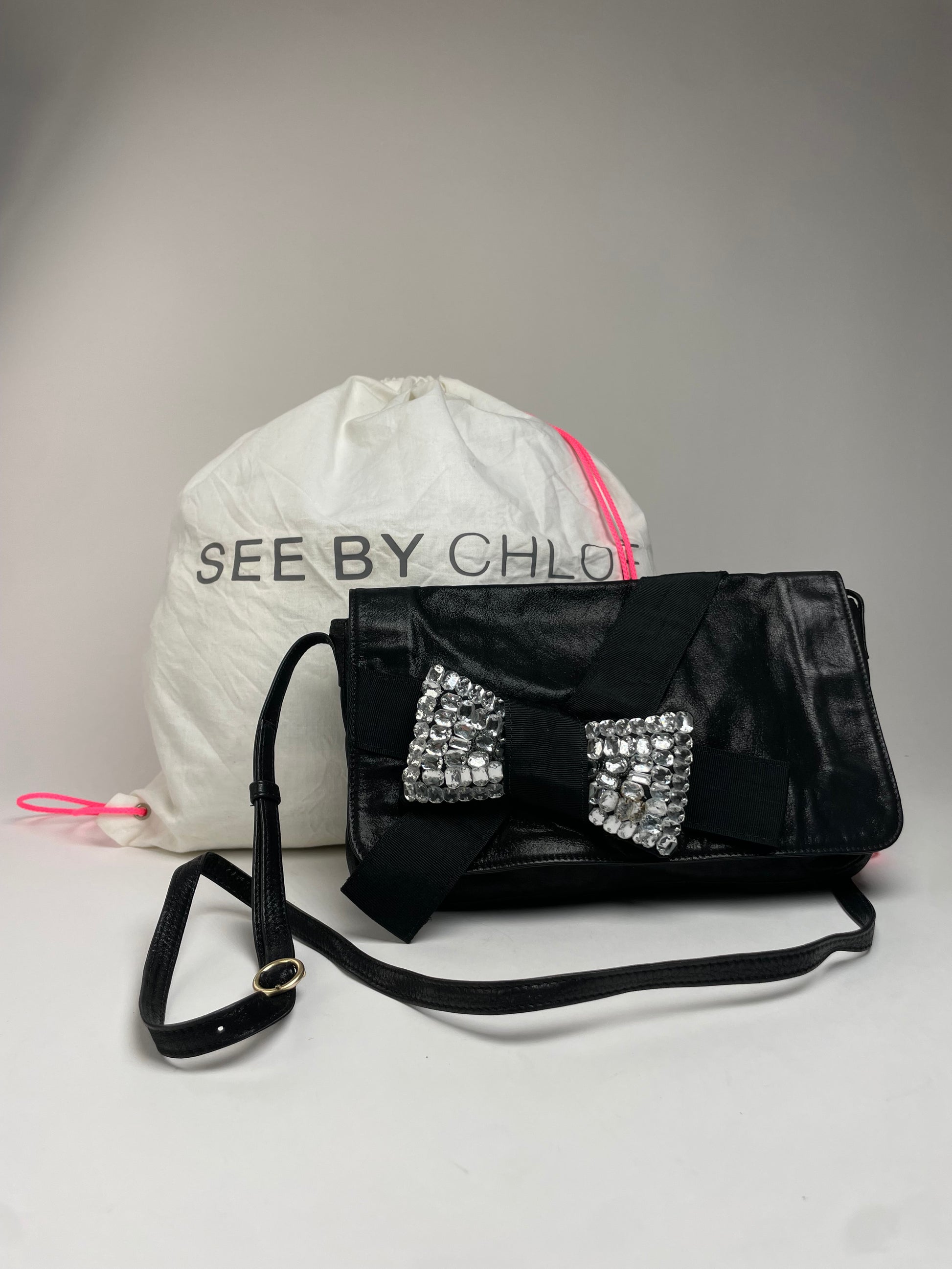 SEE BY CHLOÉ Vintage Shoulder Bag. This chic shoulder bag is crafted from black leather and features a decorative bow appliqué made from crystal-like plastic elements and black canvas. The adjustable strap allows for variable length, and the bag closes with a magnetic fastening.