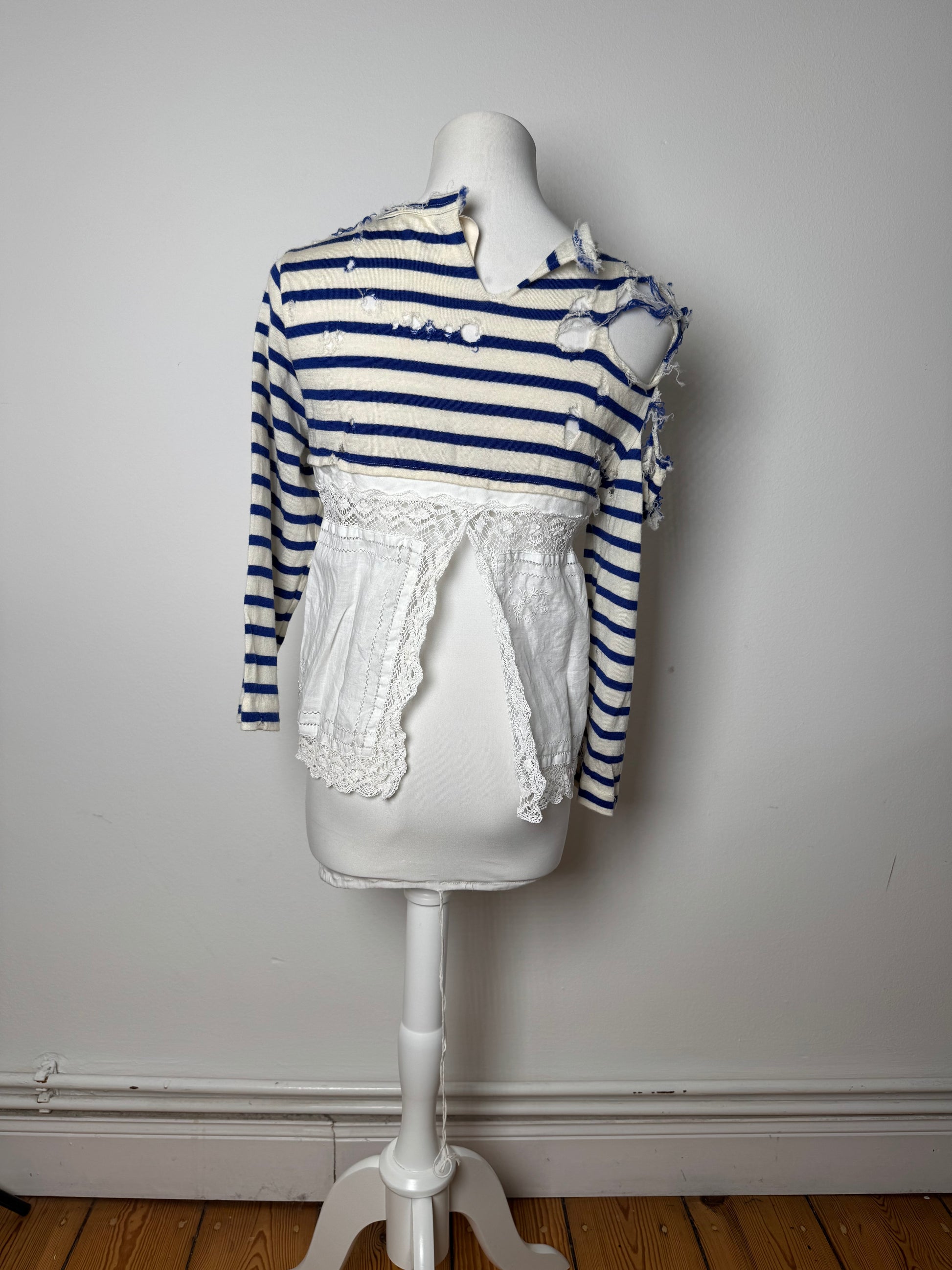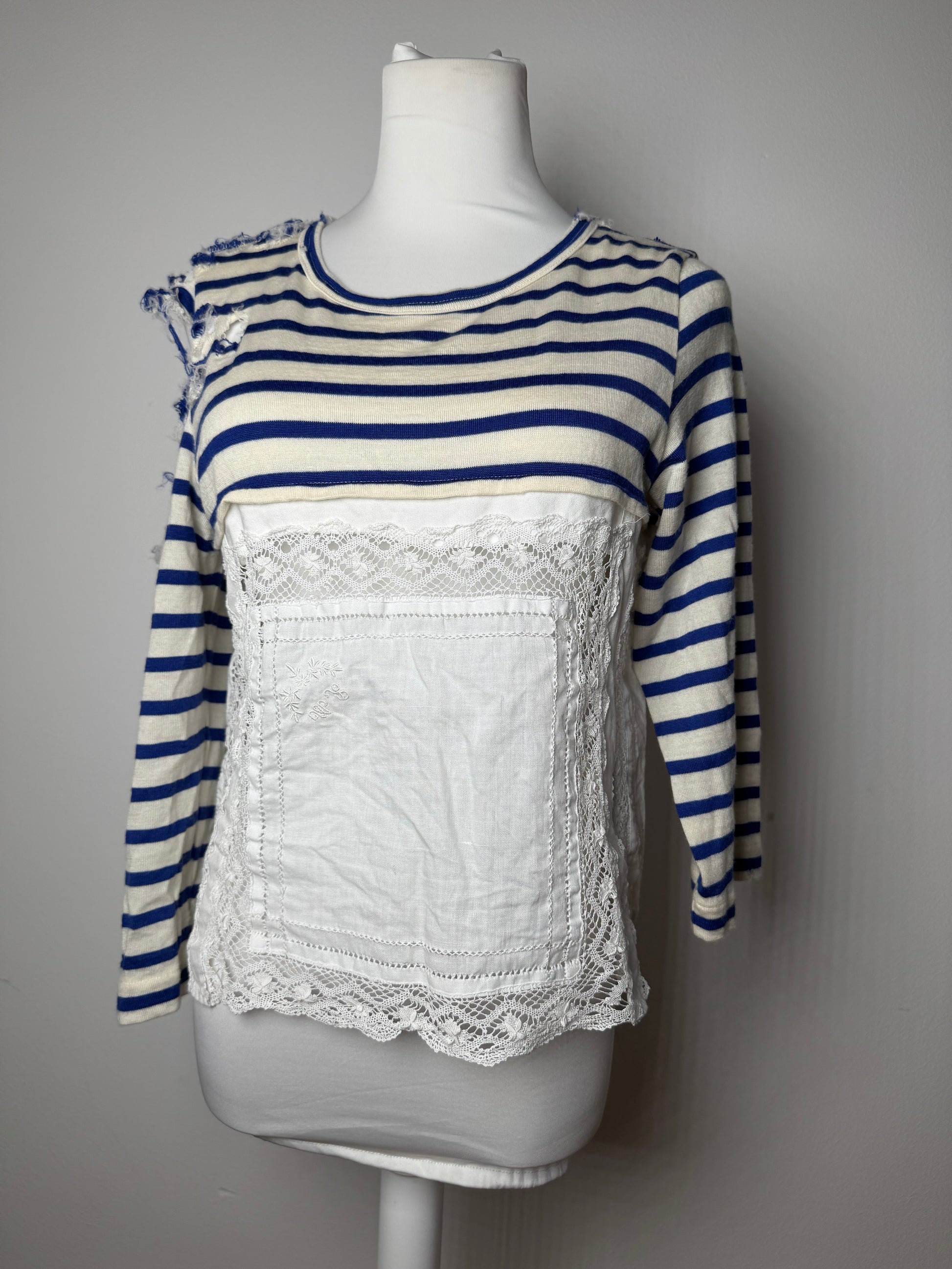 COMME DES GARÇONS TAO Vintage Sweater. This chic sweater is crafted in an avant-garde design characteristic of TAO , a Comme des Garçons sub-line known for its deconstructive, experimental approach within the brand’s Japanese fashion legacy. The mannequin in the photos is wearing size 38/M. The piece features intentional heavy distressing on the right shoulder and across parts of the body, forming a deliberately torn aesthetic. The main part is made from a navy-white striped cotton-polyester blend, while an additional patterned white linen panel is placed on both the front and the back.
