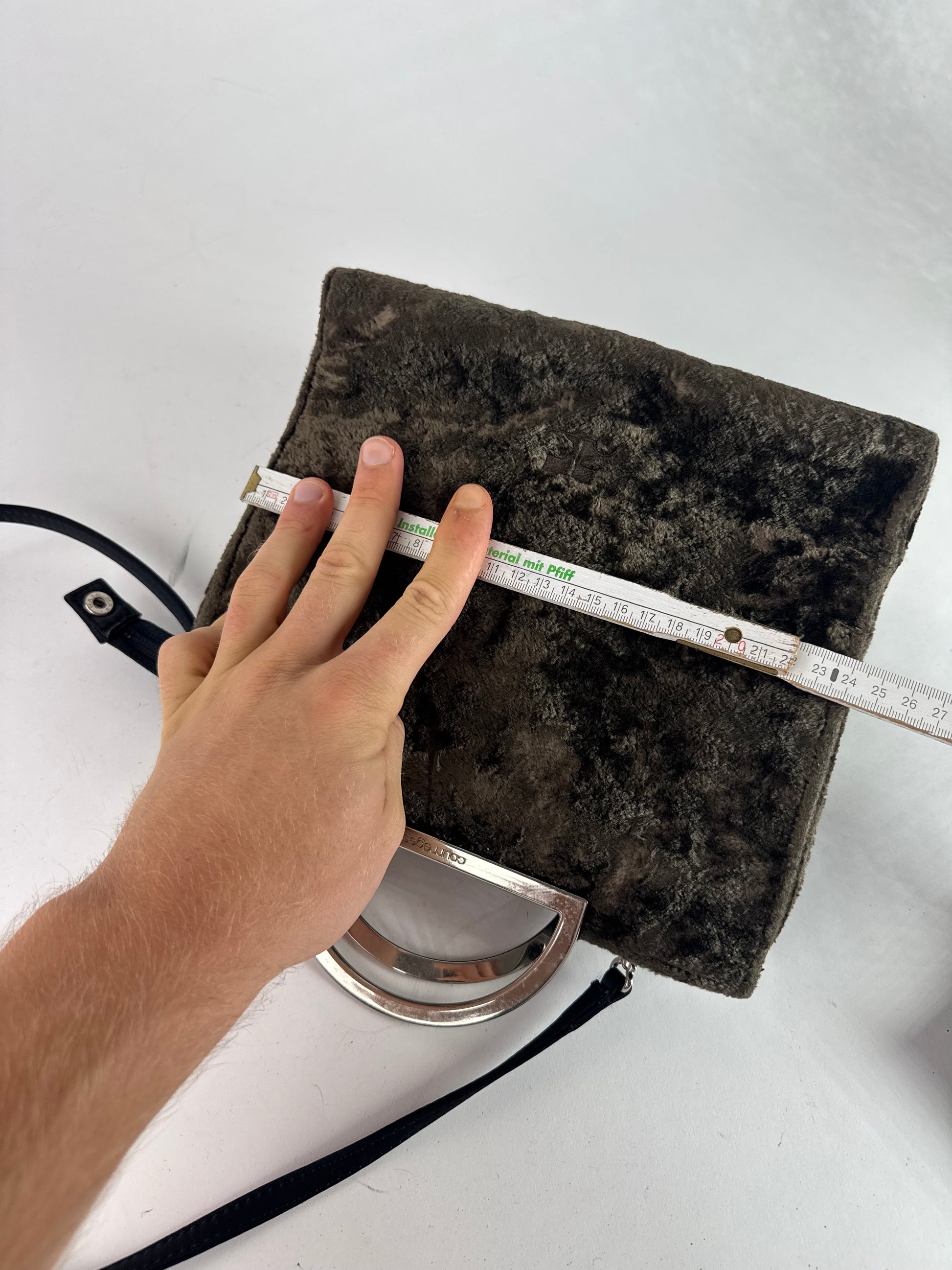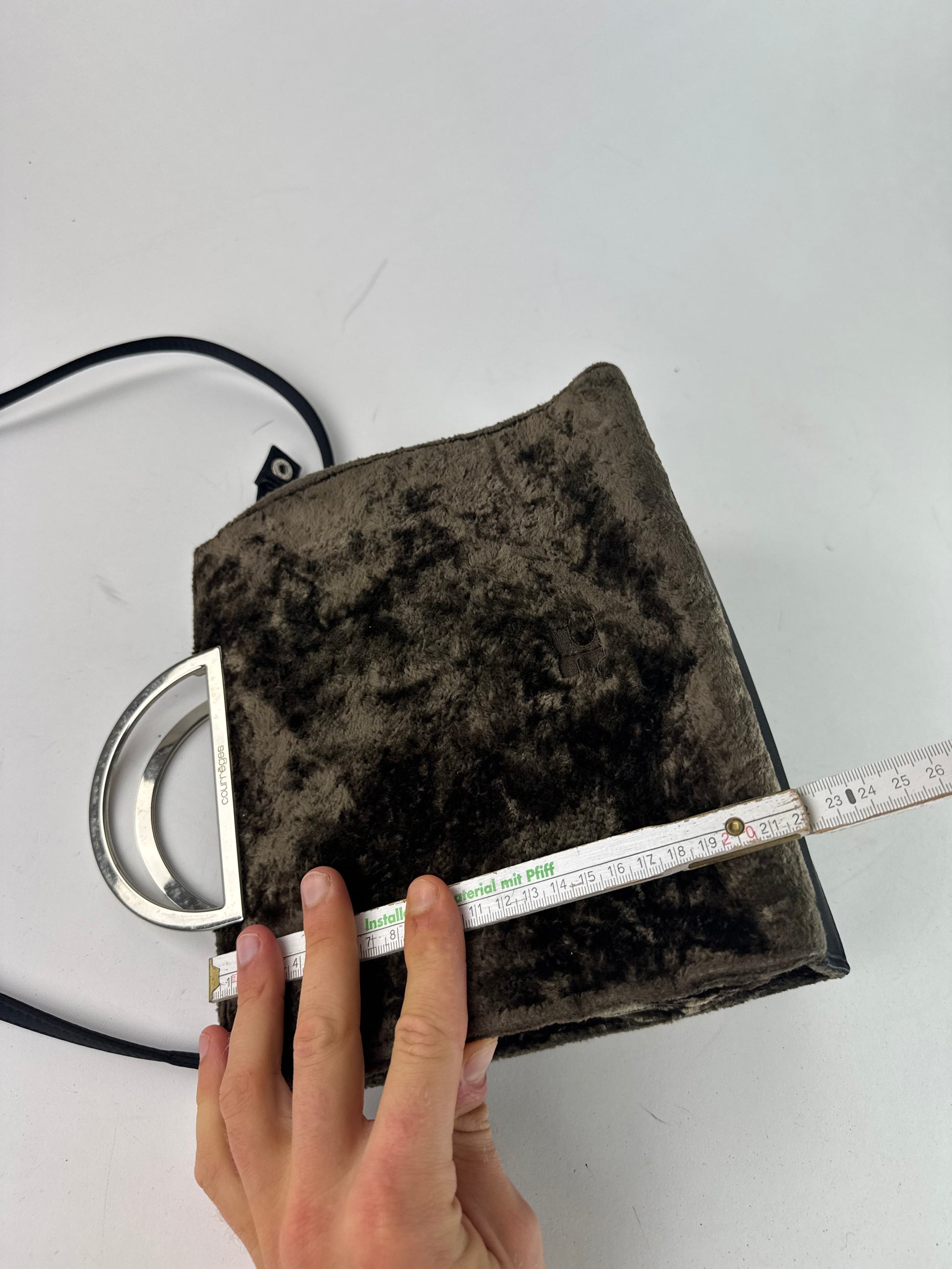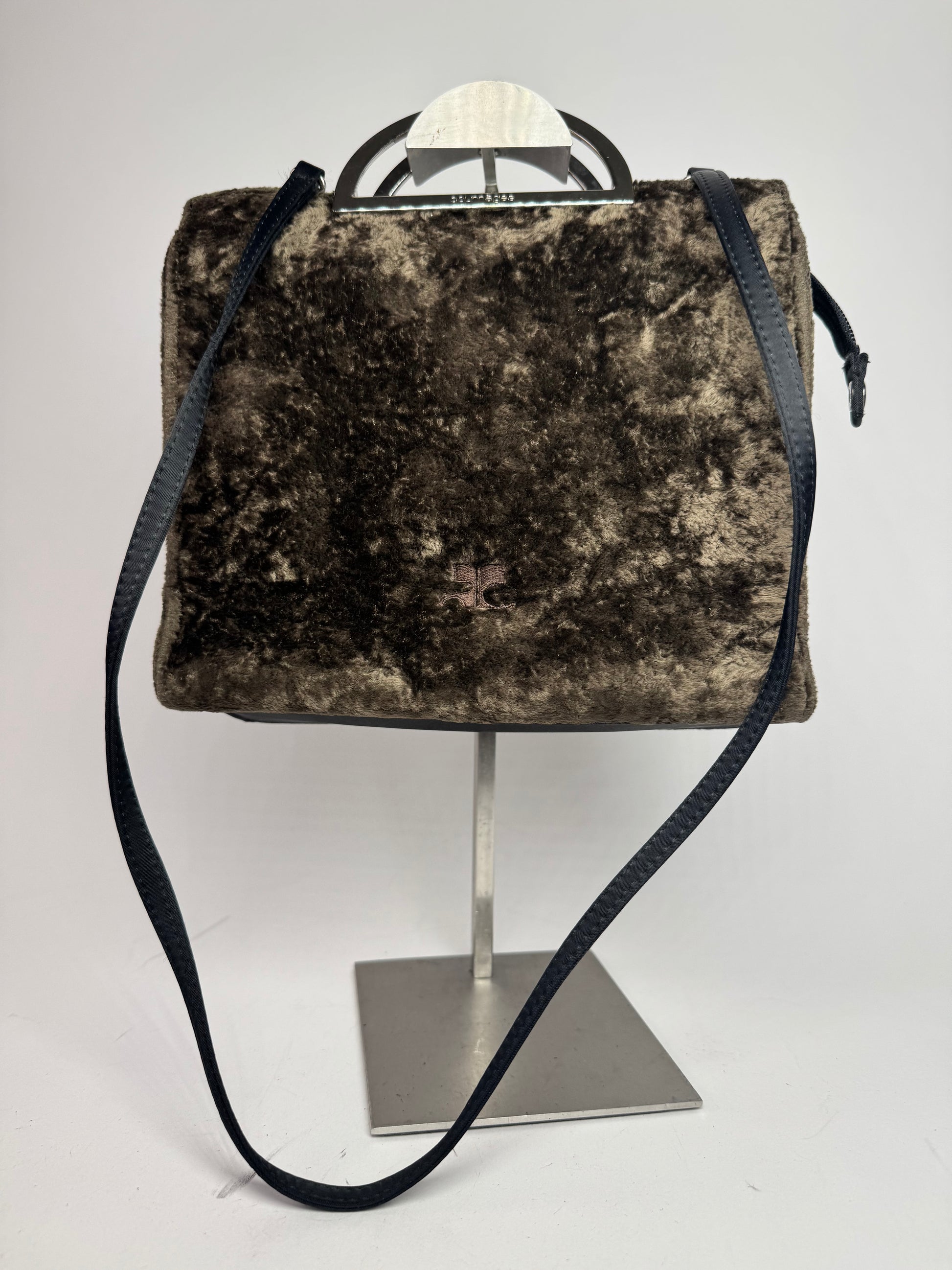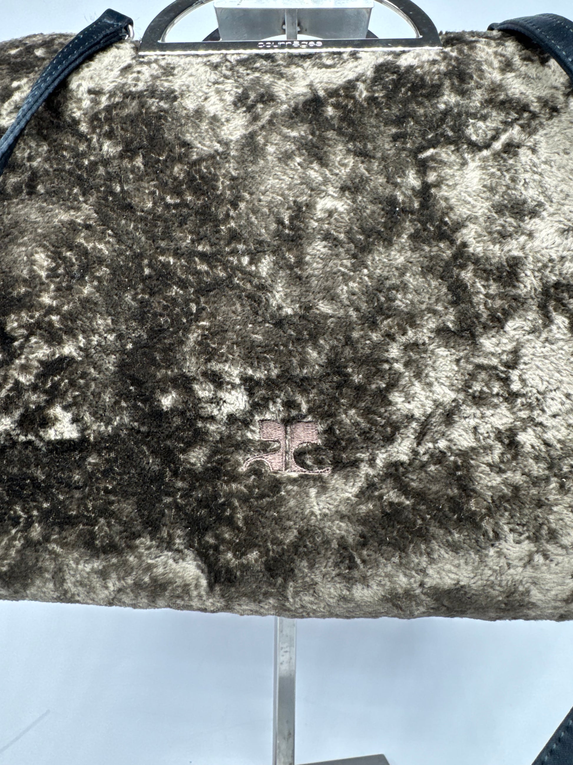 This rare vintage handbag is finely crafted of brown vegan fur with brown leather details. It features distinctive half-moon shaped silver steel handles and comes with an additional black leather shoulder strap, allowing it to be worn as a 2-way bag. The trimming is in black leather, and the Courrèges logo appears on the front in brown canvas. The interior is lined with light brown canvas. A true piece from Courrèges Paris, reflecting the brand’s innovative spirit and futuristic design heritage.