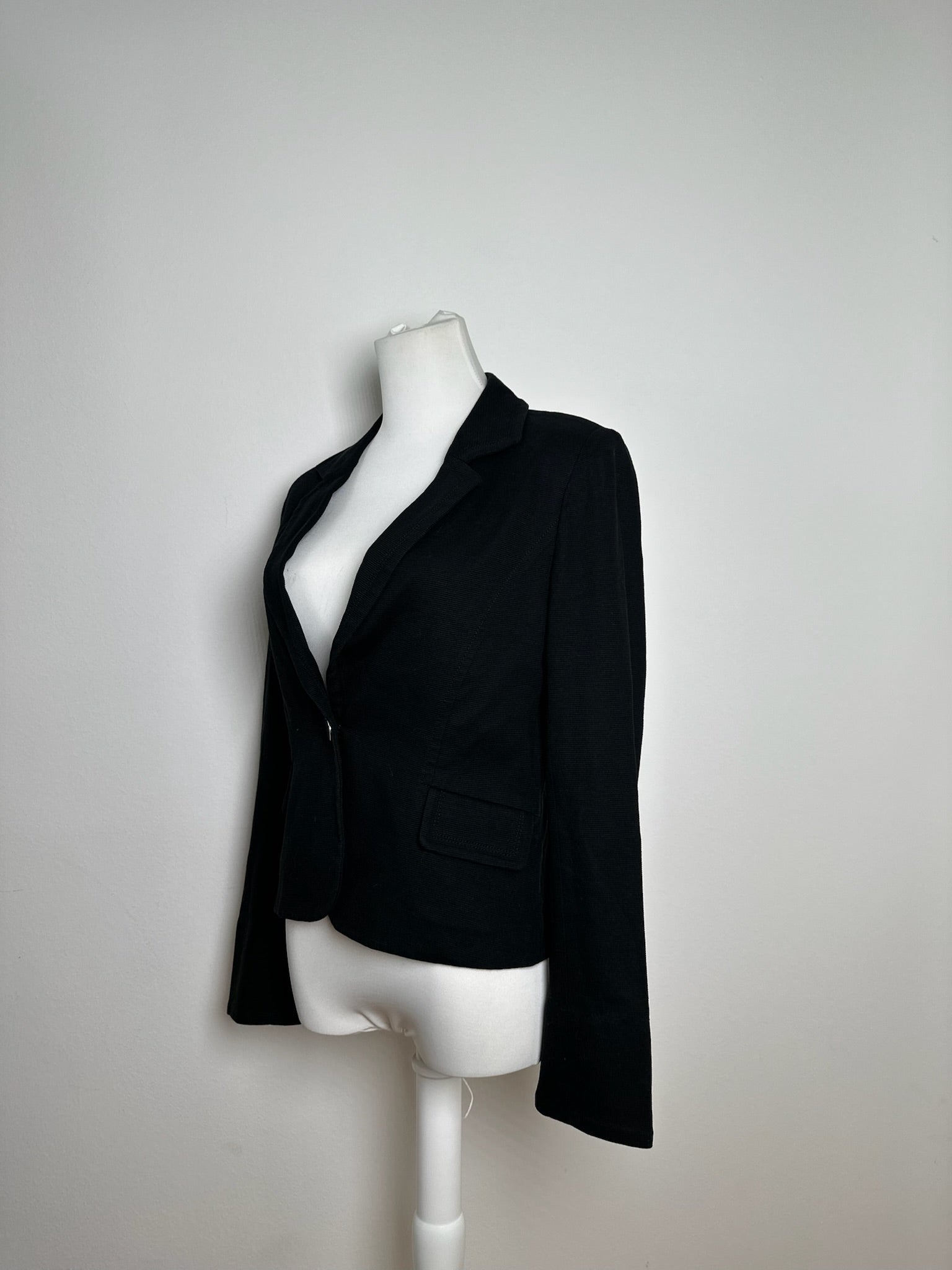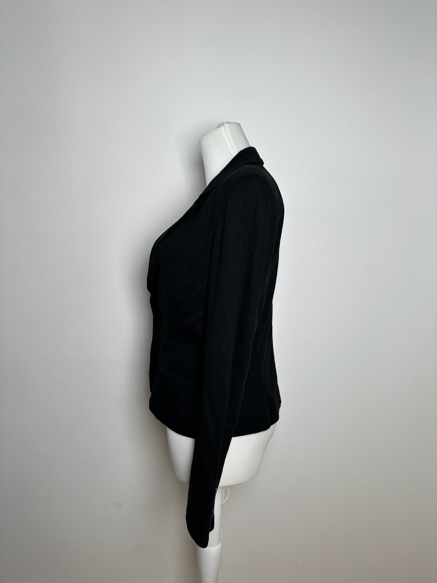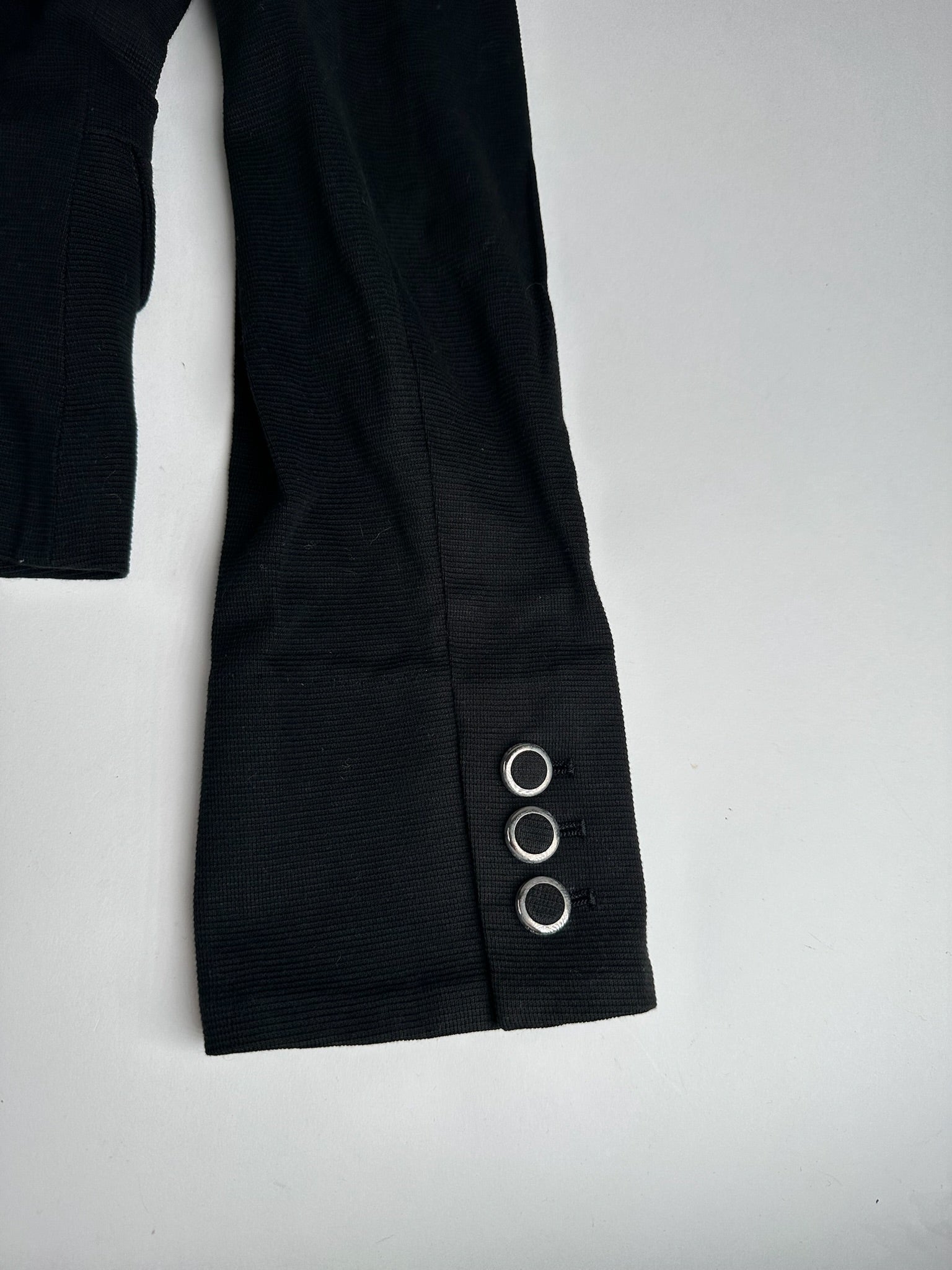 This chic trench-style coat is crafted from a refined linen and polyester blend, featuring a structured silhouette with a deep neckline. The design includes a front silver-toned steel button and three matching black and silver steel buttons at each cuff, adding a sleek, modern finish.