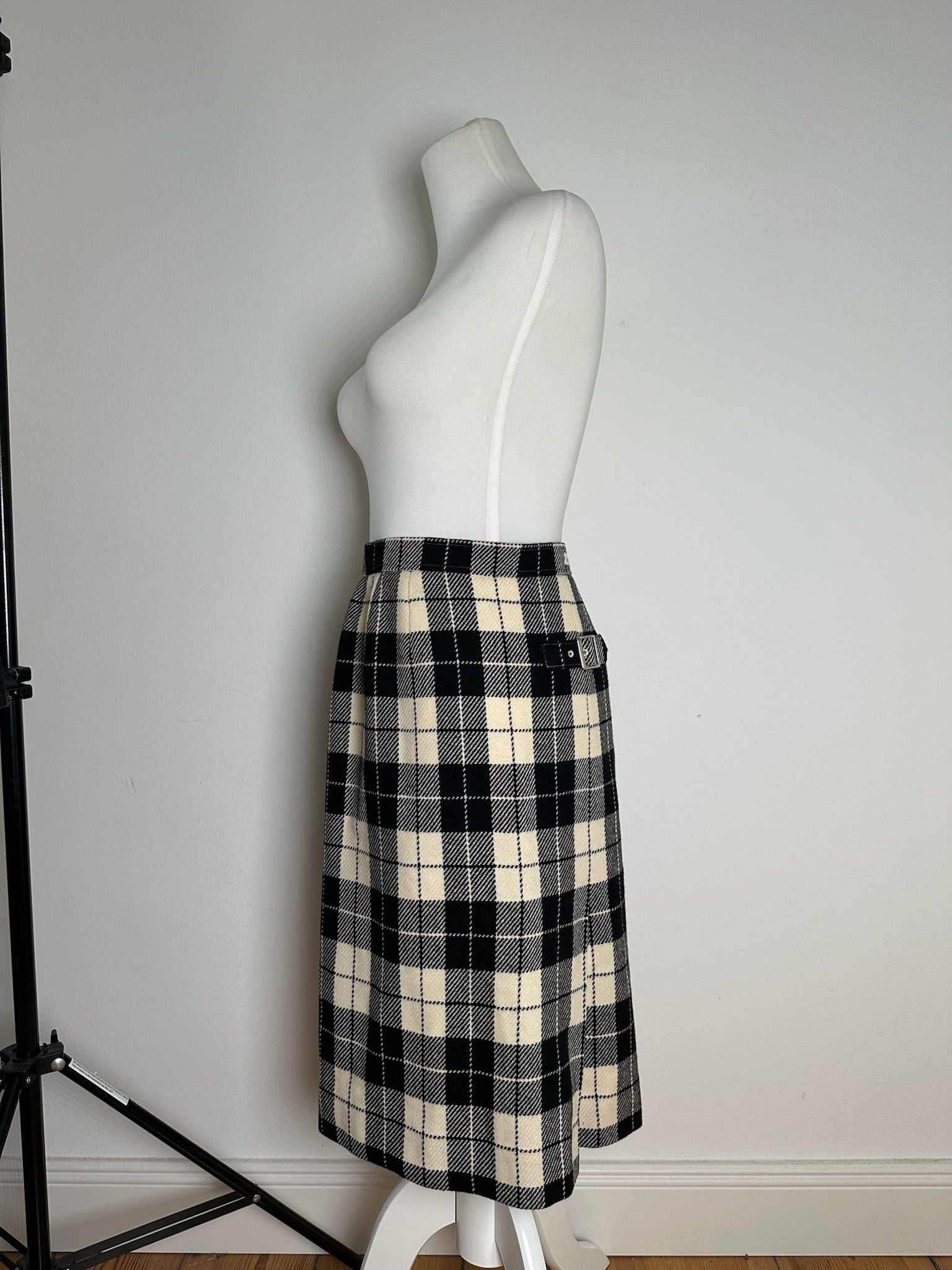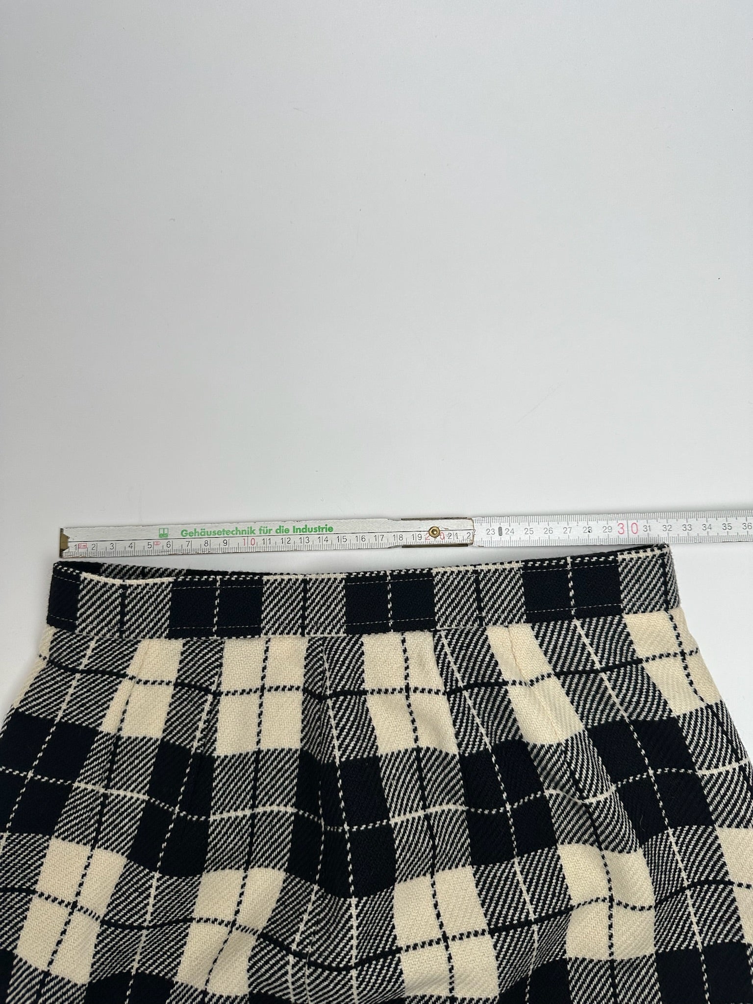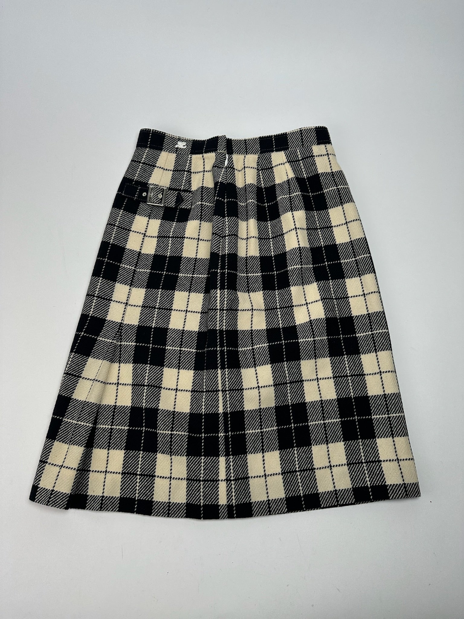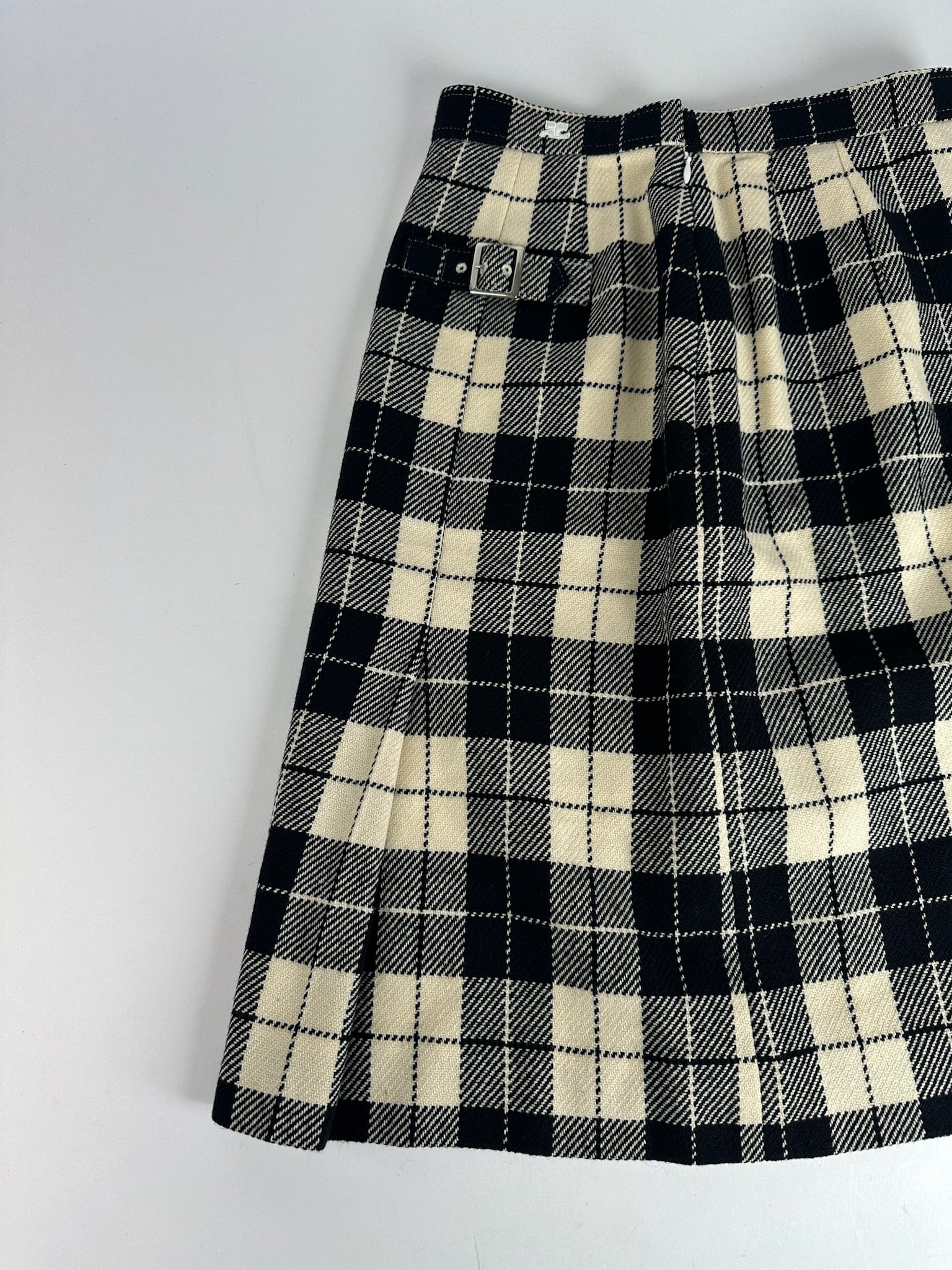 This chic skirt is crafted from soft wool and features a timeless checkered pattern in beige, white, grey, and black. The high waist design is complemented by belt-like side appliqués that allow for adjustable fit. Finished with silver-toned steel hardware for a refined look.