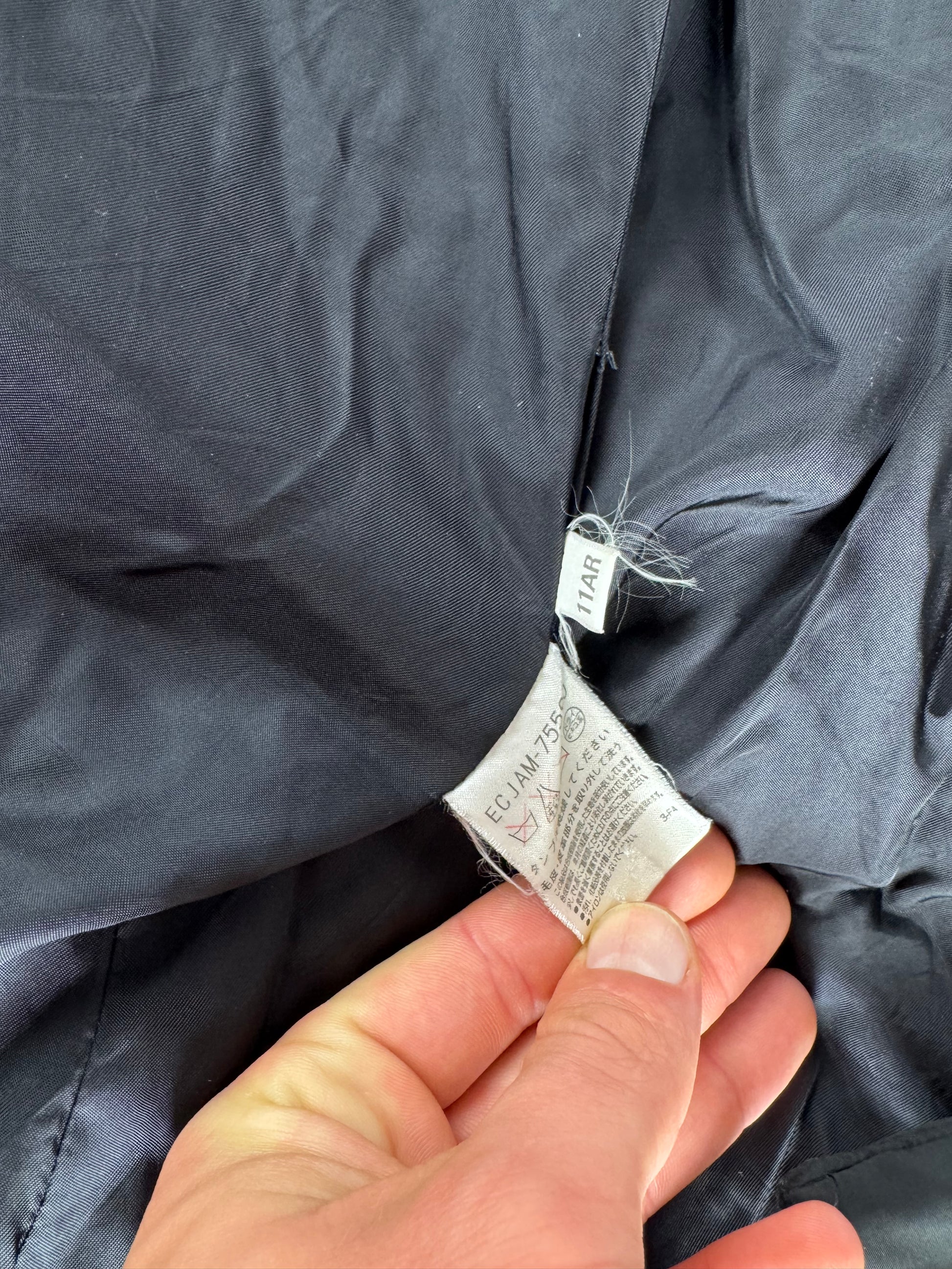 This chic vintage down parka is finely crafted in black with silver-tone steel hardware. The front features a zipper covered by silver-tone snap buttons. It includes a hood and is warmly padded, made from polyester and synthetic fibers. The size 11AR corresponds approximately to an international M. The mannequin on the photos is wearing size 38/M.