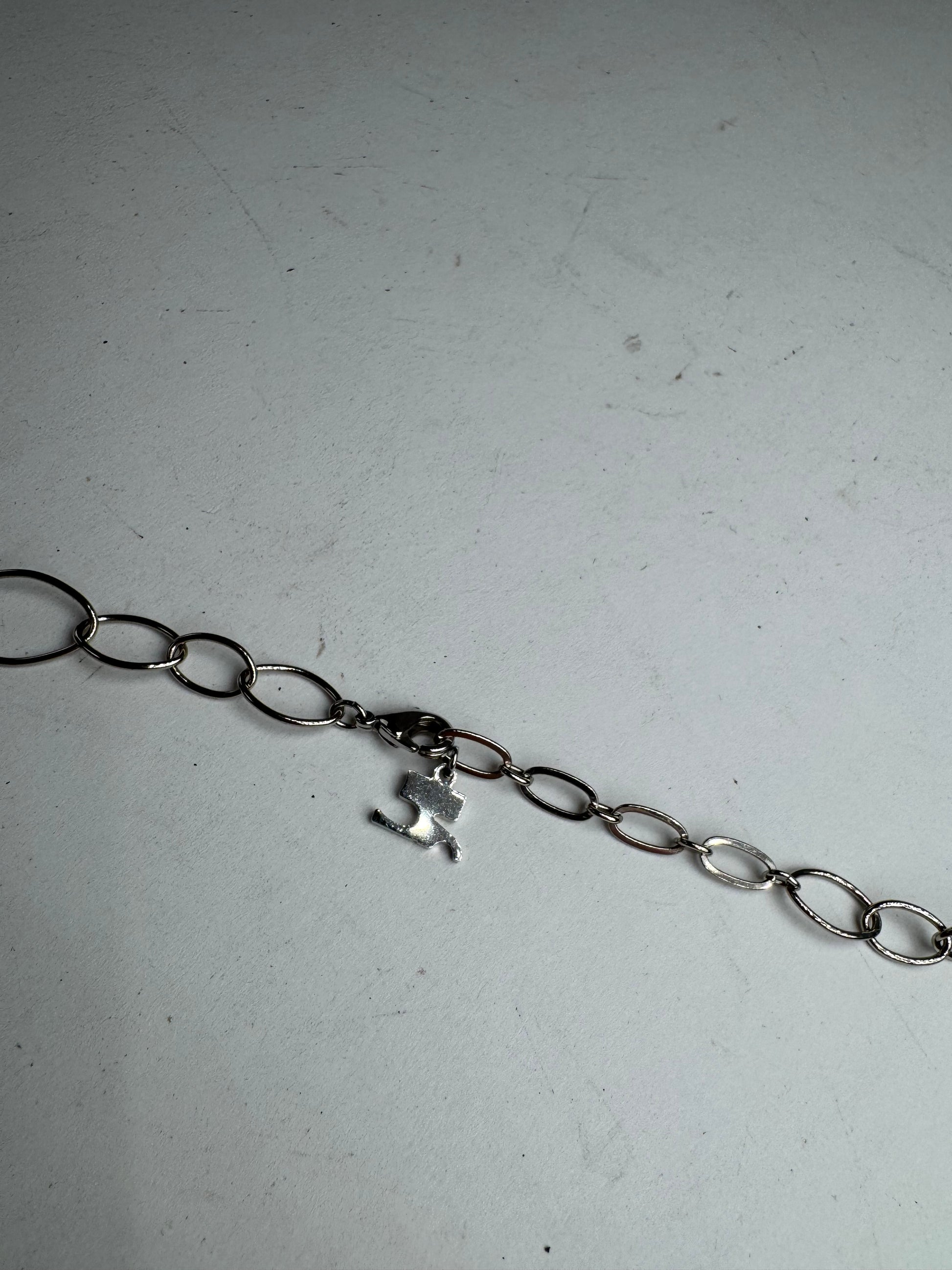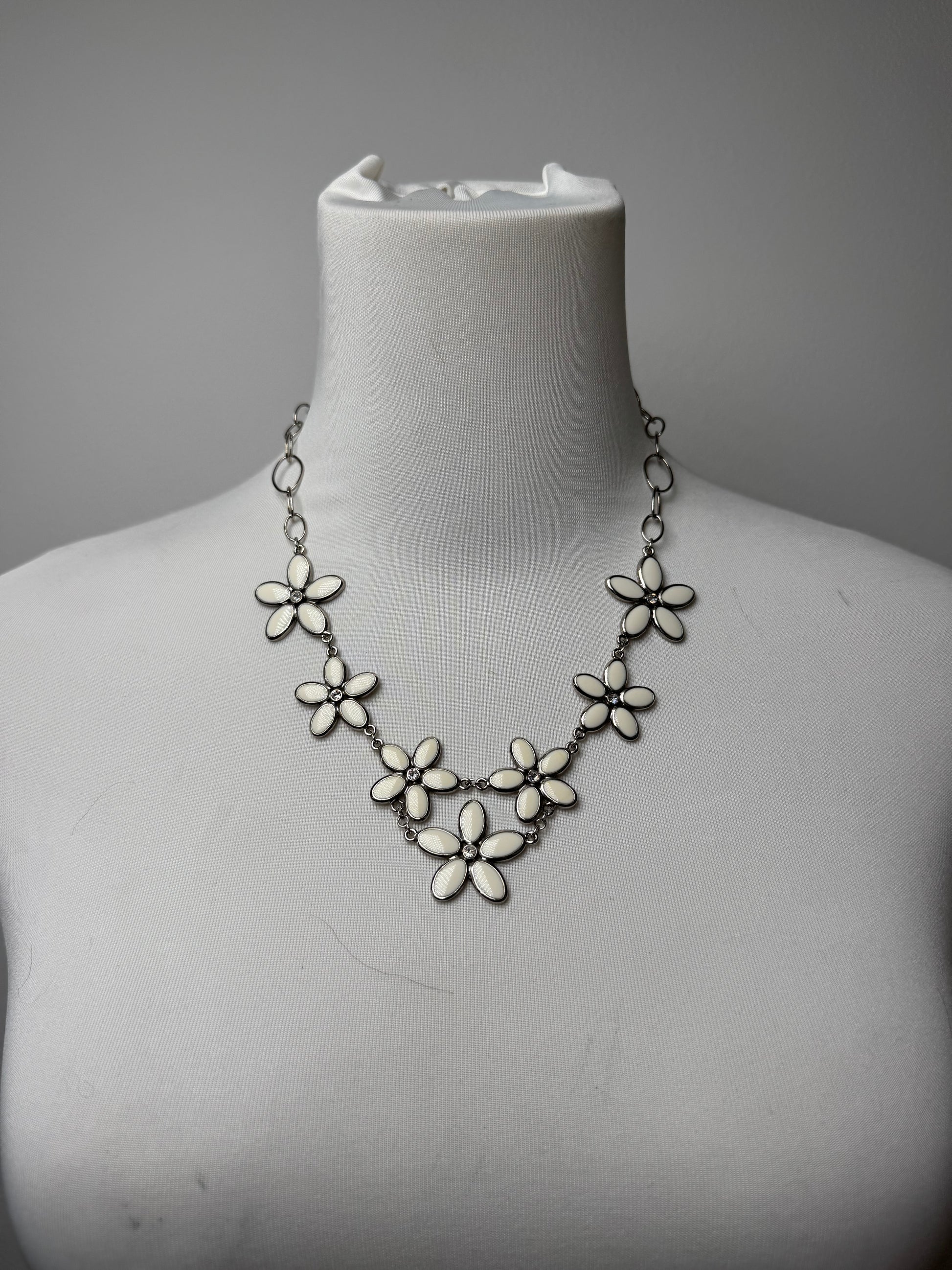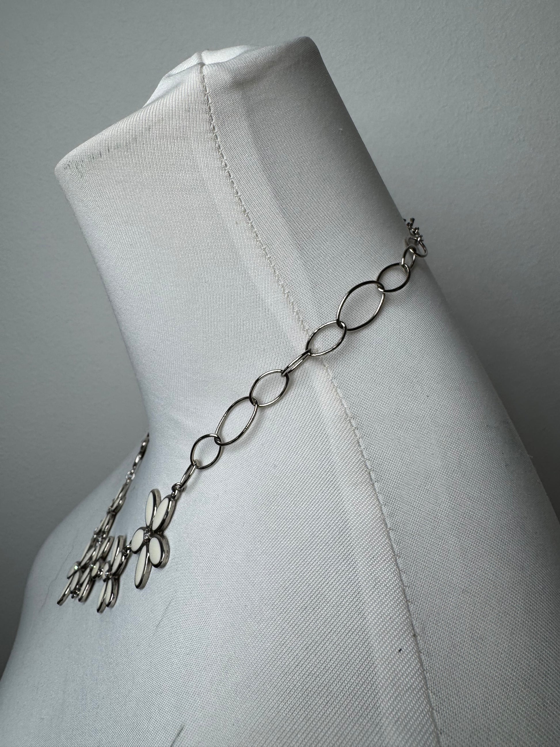COURRÈGES PARIS Silver Floral Vintage Necklace. This chic necklace is finely crafted of silver-tone steel and features white floral details. The elegant piece is unisex and designed with a clean, modern aesthetic.