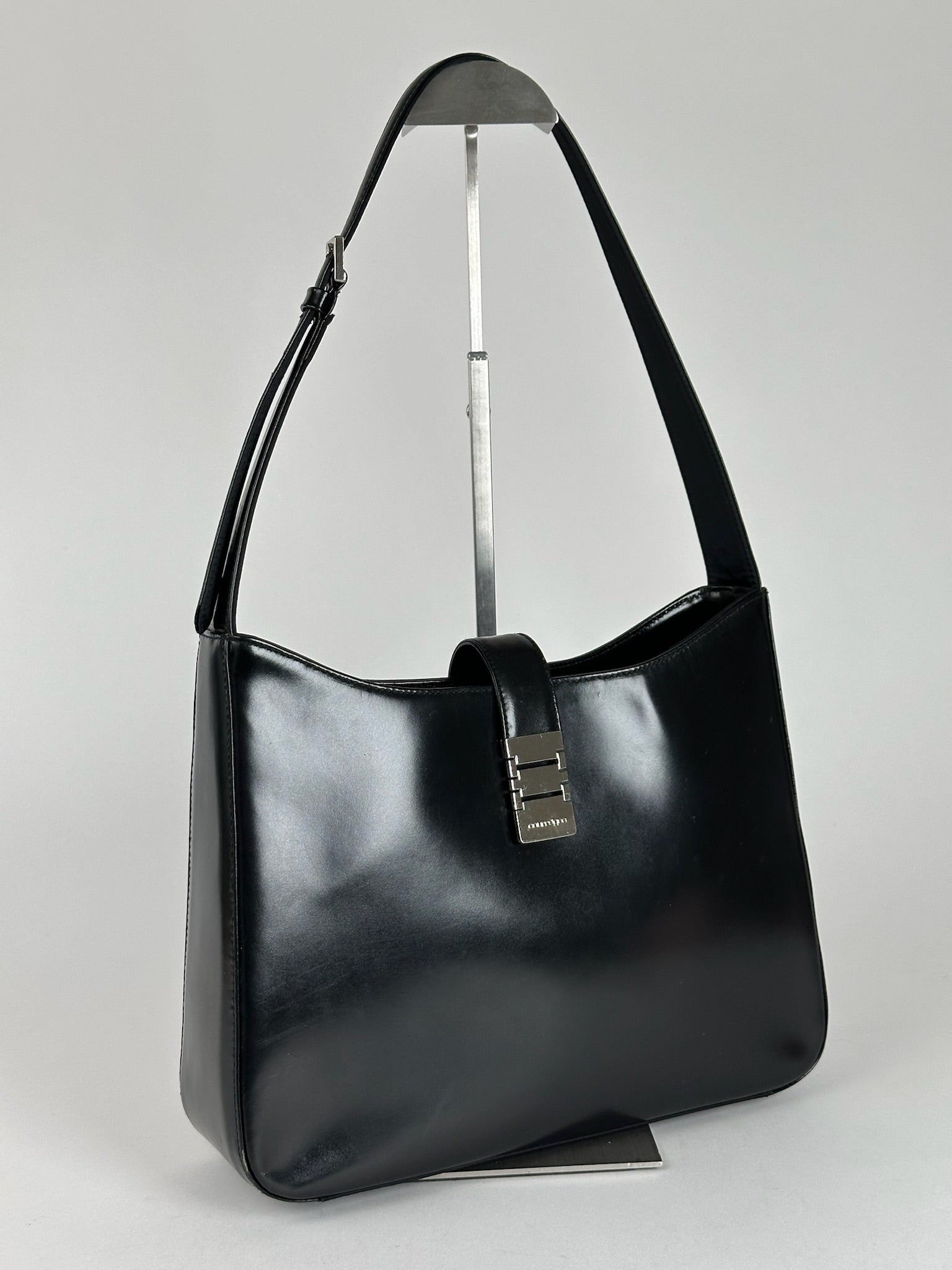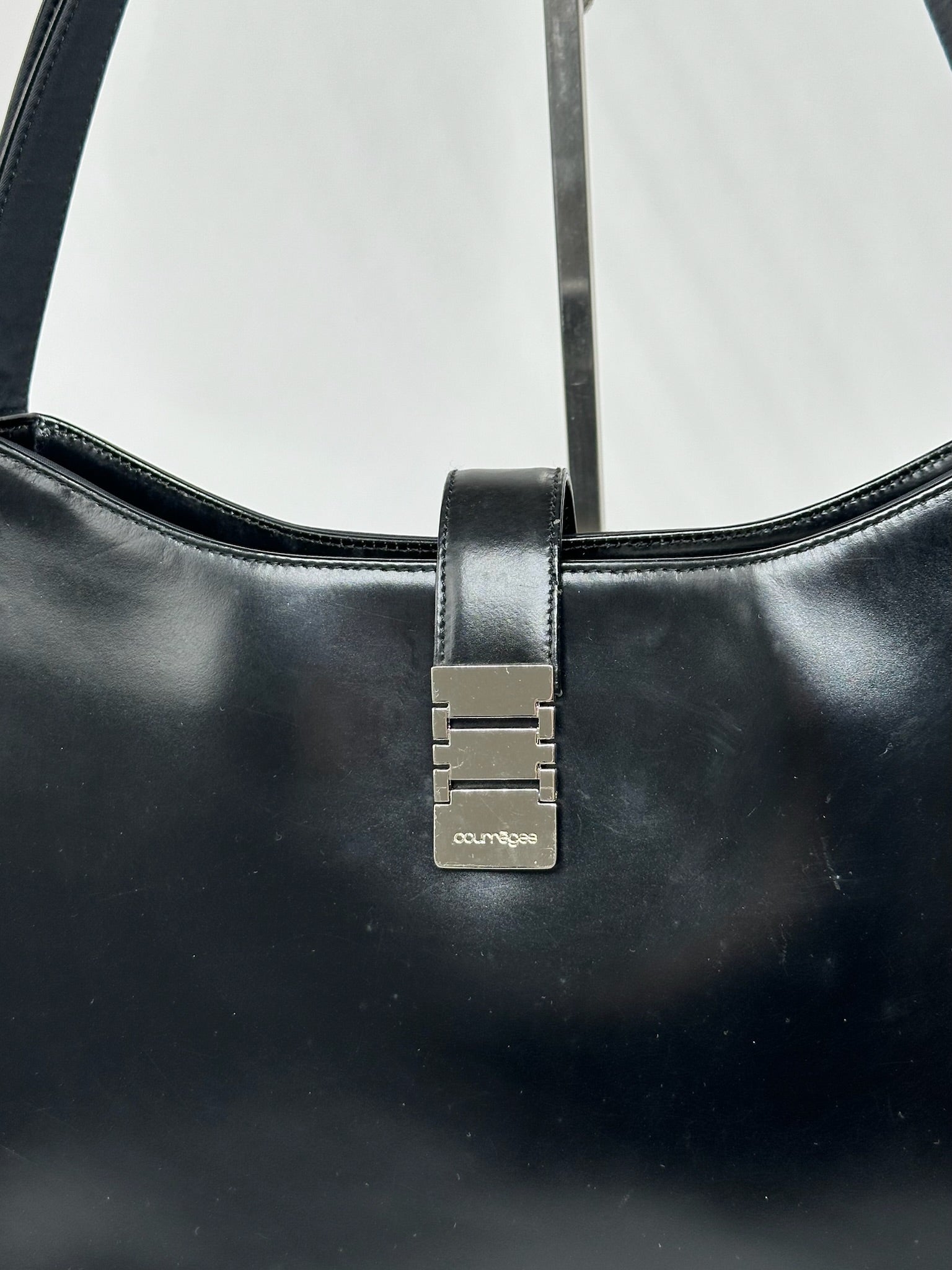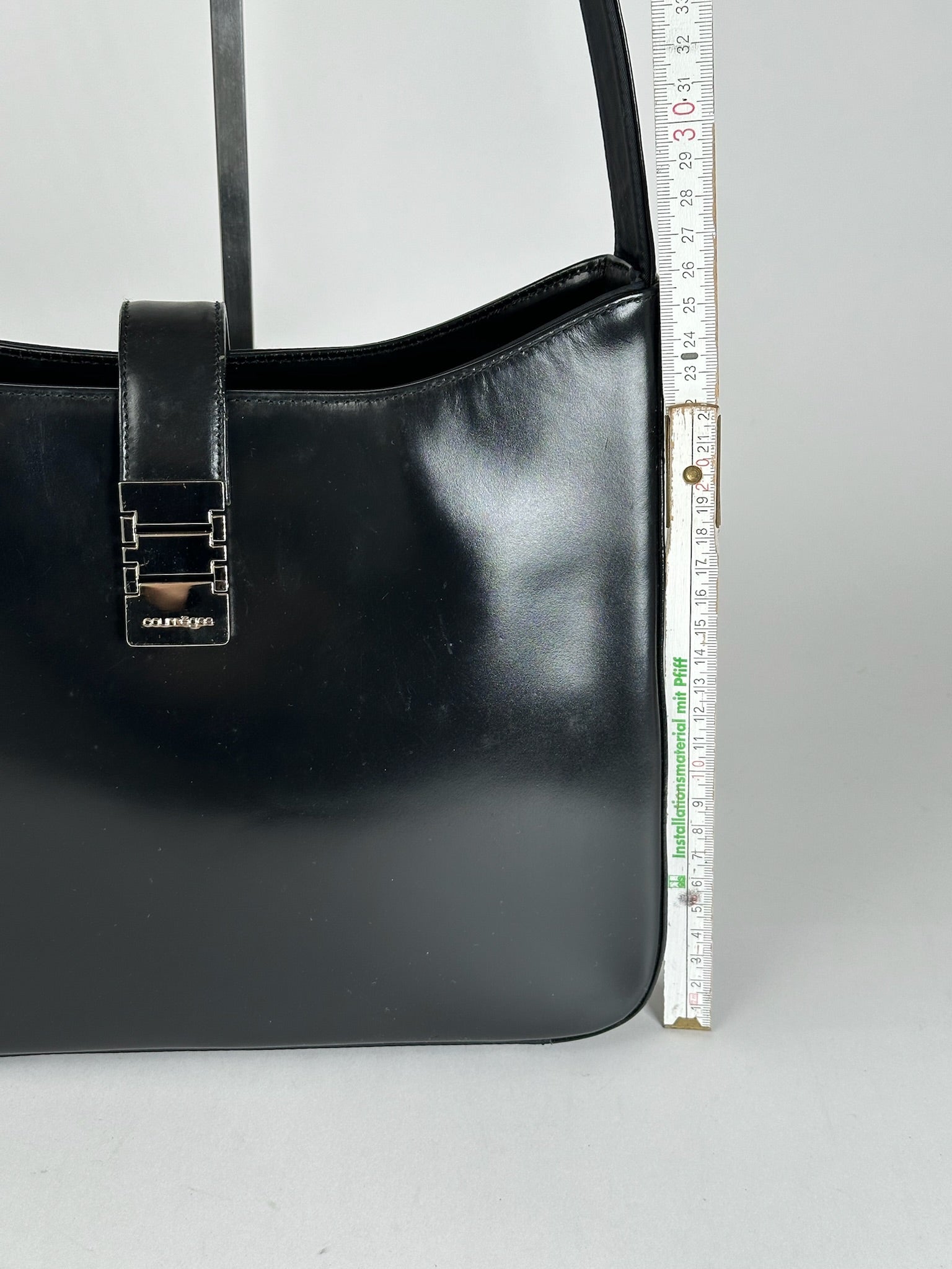 COURRÈGES Vintage Handbag. This chic handbag is finely crafted of black leather and features a medium-length handle with silver-tone steel hardware. The interior is lined with black canvas and offers a clean, structured design.
