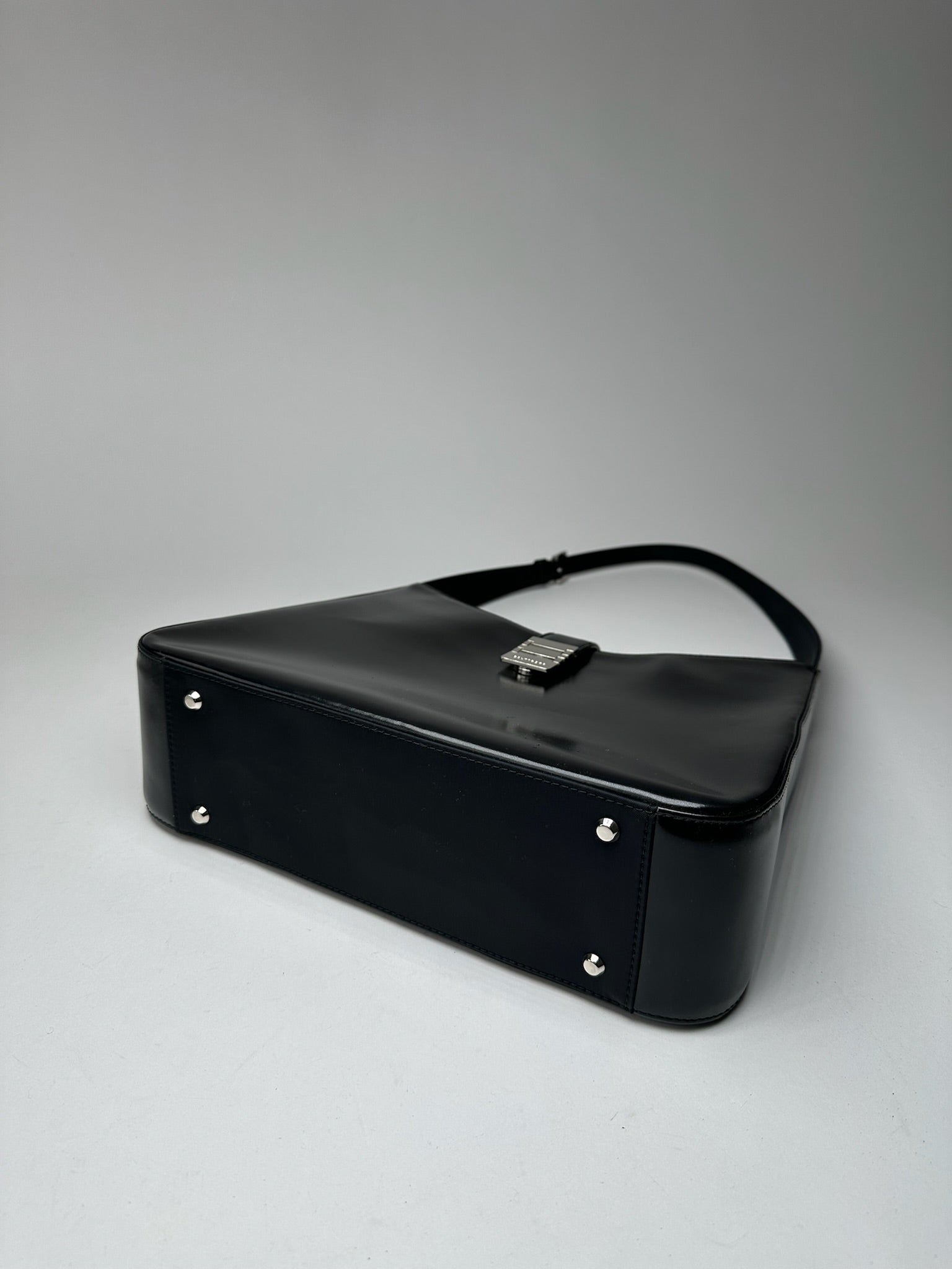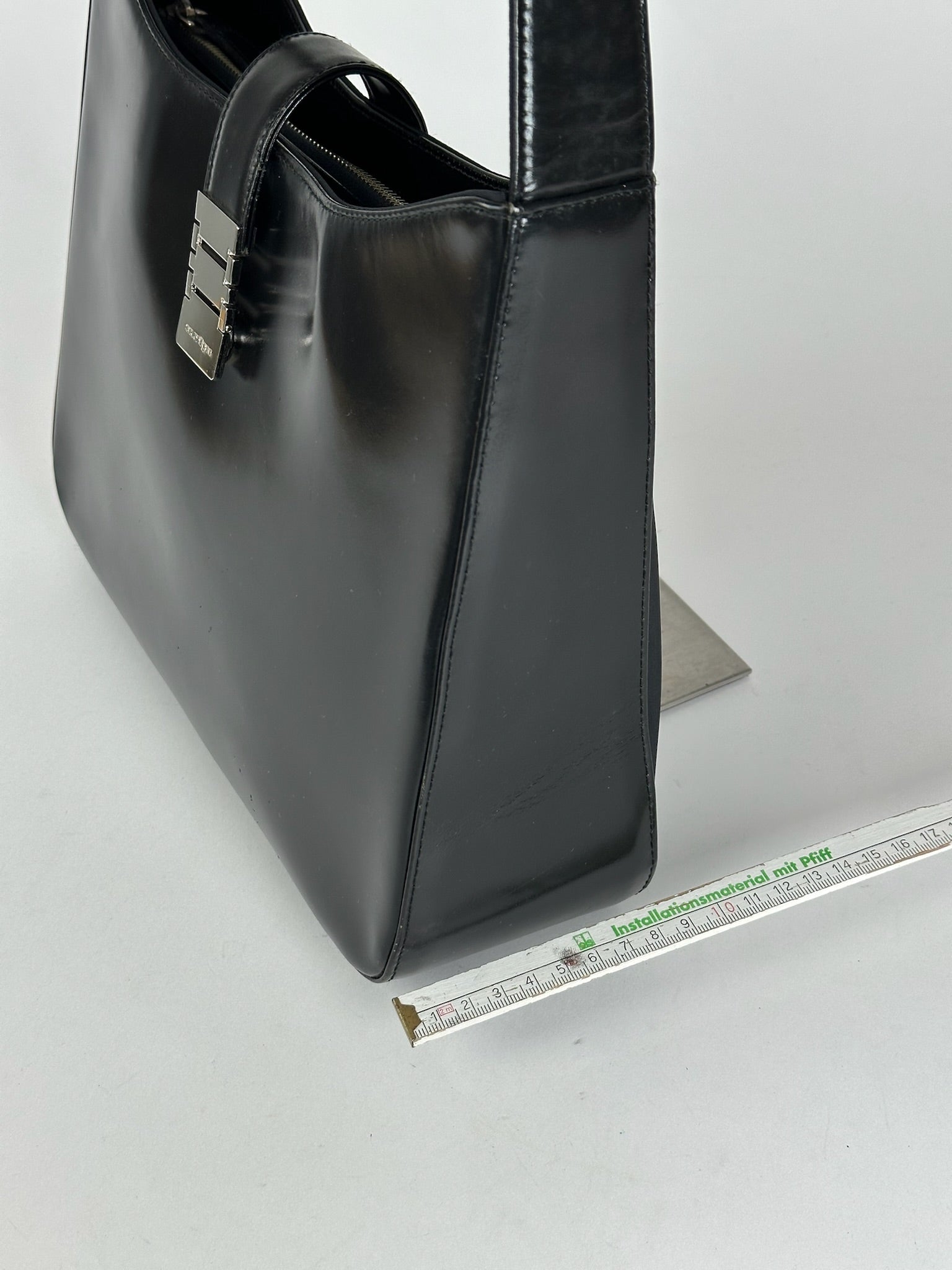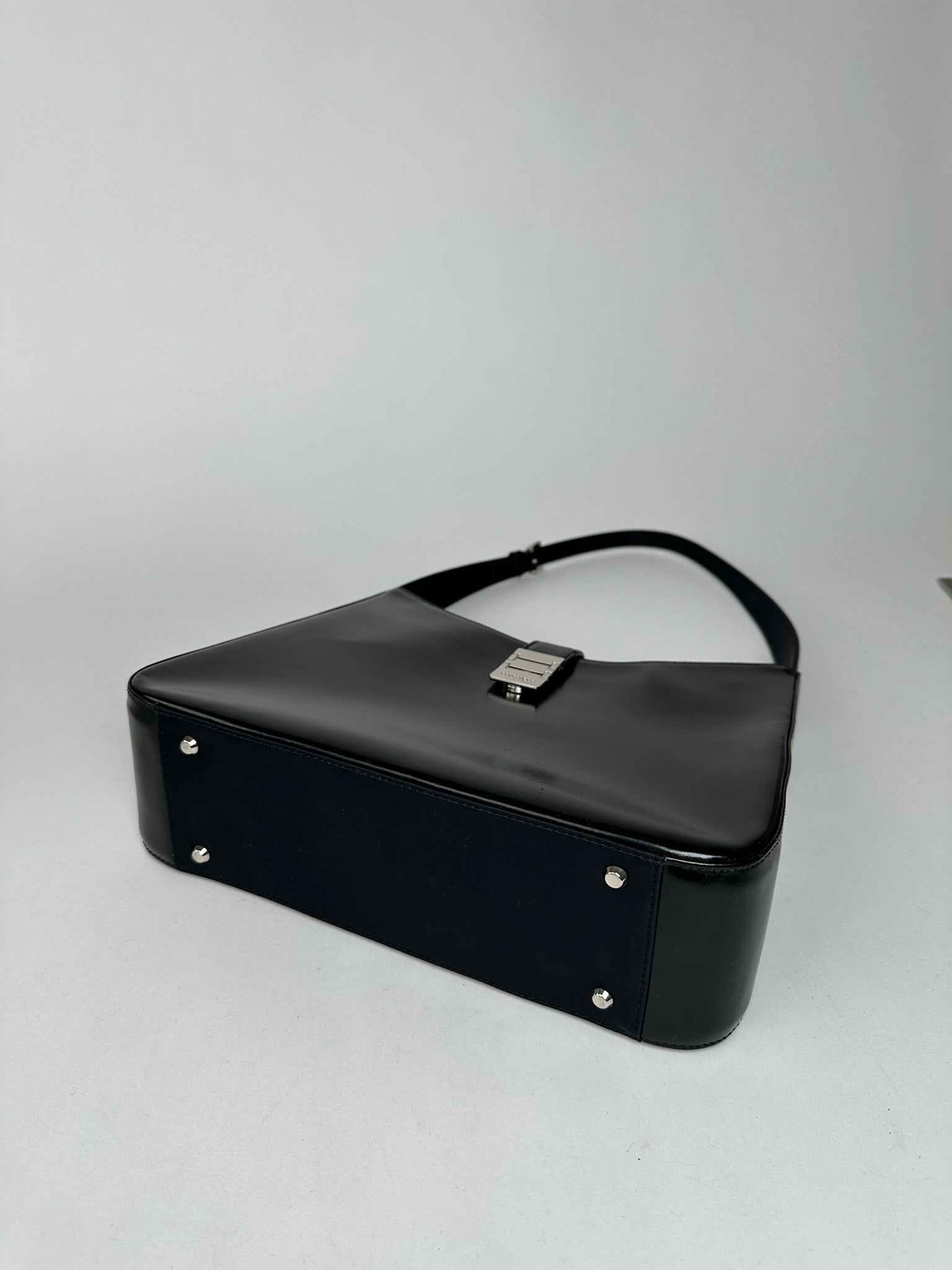 COURRÈGES Vintage Handbag. This chic handbag is finely crafted of black leather and features a medium-length handle with silver-tone steel hardware. The interior is lined with black canvas and offers a clean, structured design.