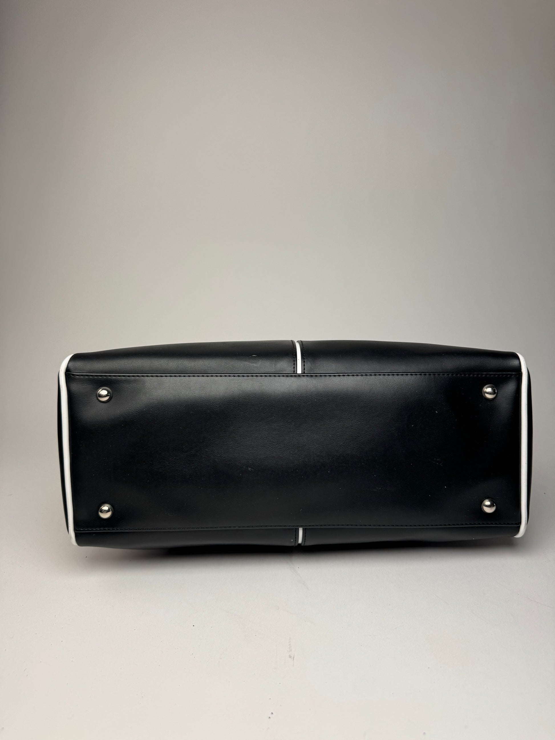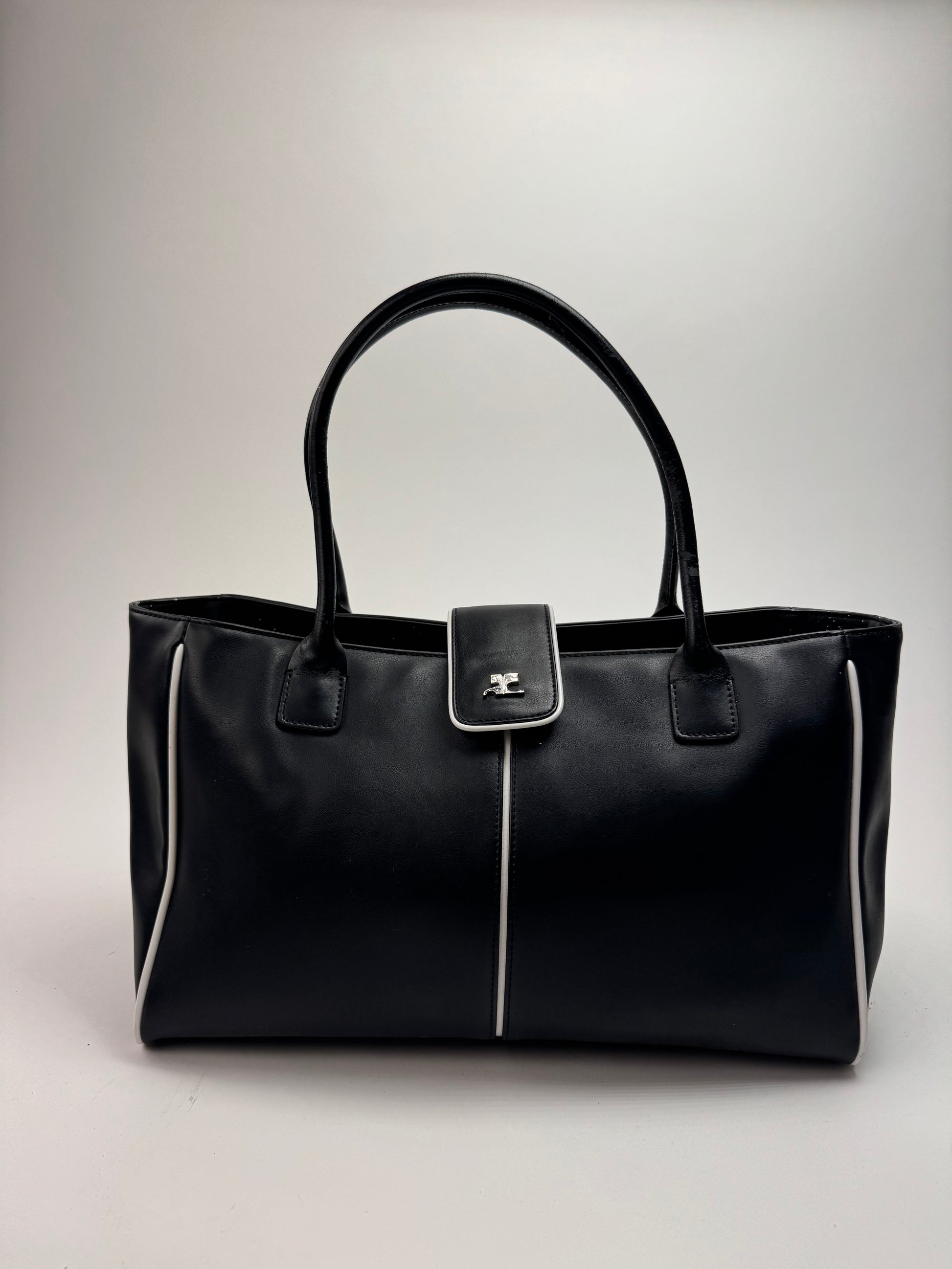 This sleek handbag is finely crafted of black leather with three horizontal white leather stripes across the front. The design features a magnetic closure topped with a silver-tone steel Courrèges logo plate, combining minimalism with the brand’s signature futuristic aesthetic. The interior is lined but heavily damaged with peeling and requires replacement.