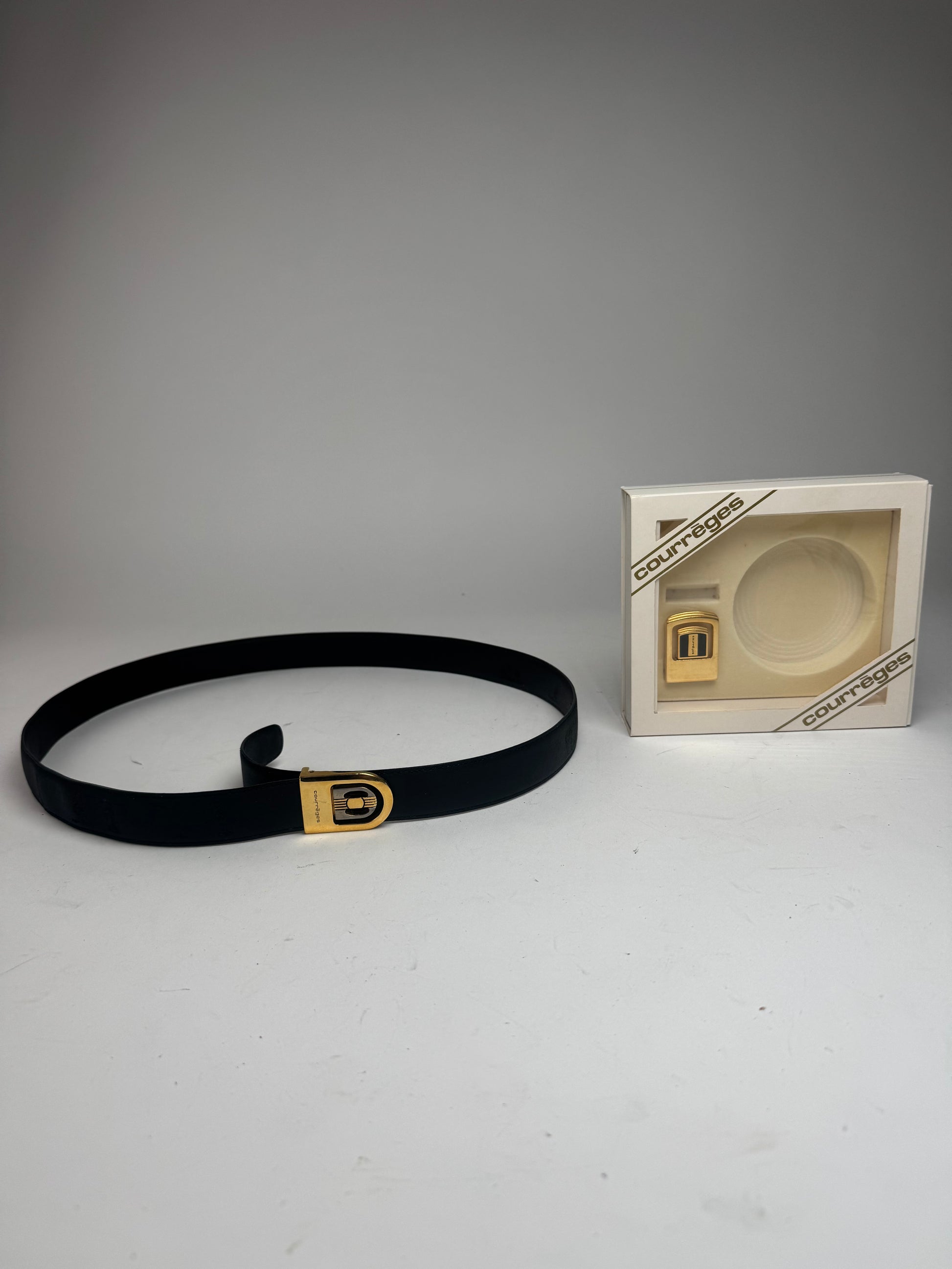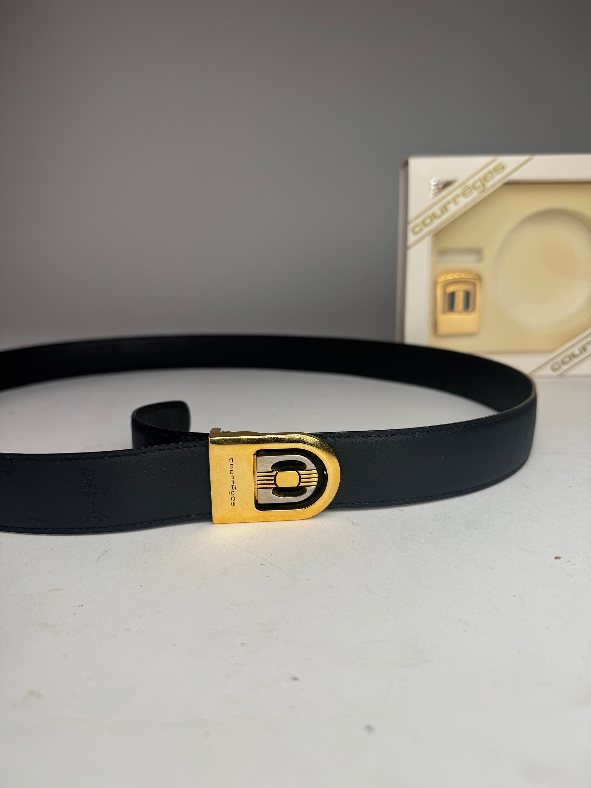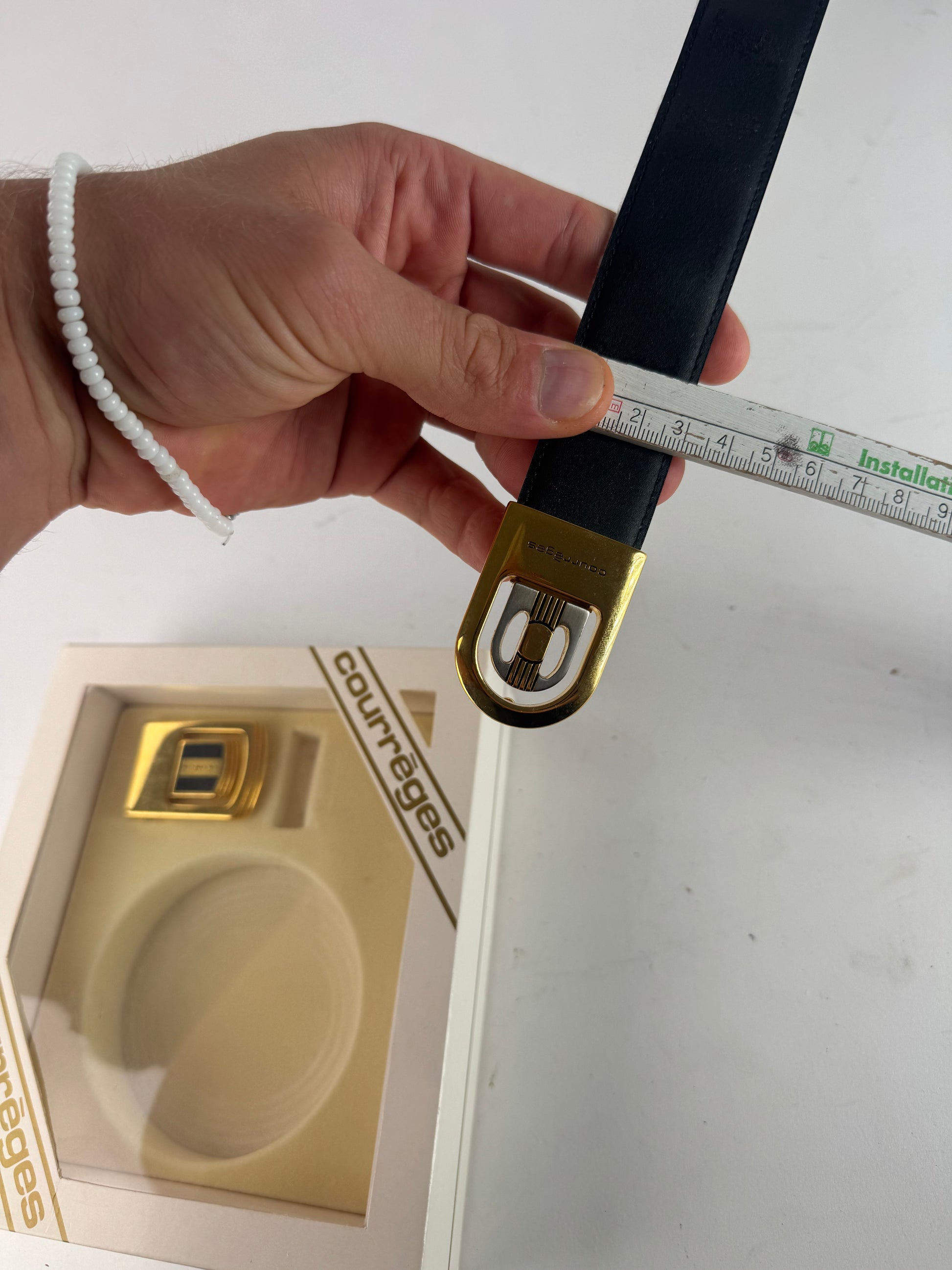 This chic vintage belt set comes in its original packaging and includes a black leather belt with two interchangeable buckles. One buckle is crafted of bi-color silver and gold-tone steel, while the other is in full gold-tone steel. Both buckles feature engraved script detailing and are made in Italy. The black leather belt, made in France, measures 110 cm in length and 3 cm in width.