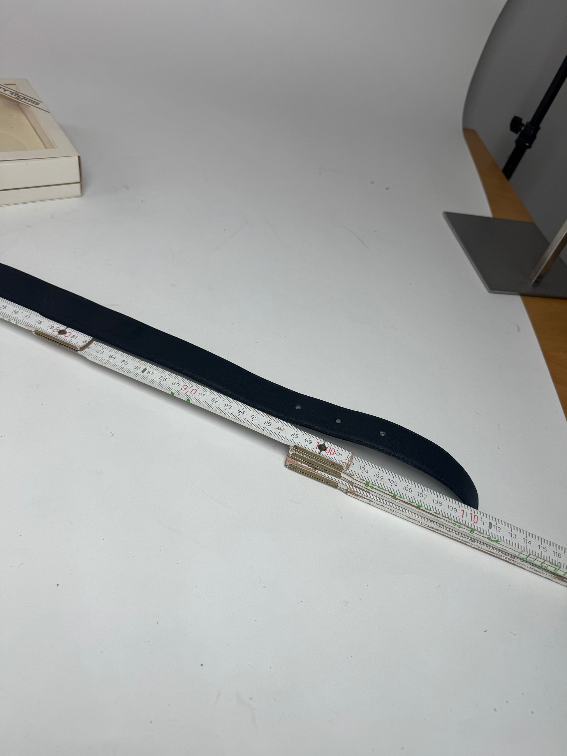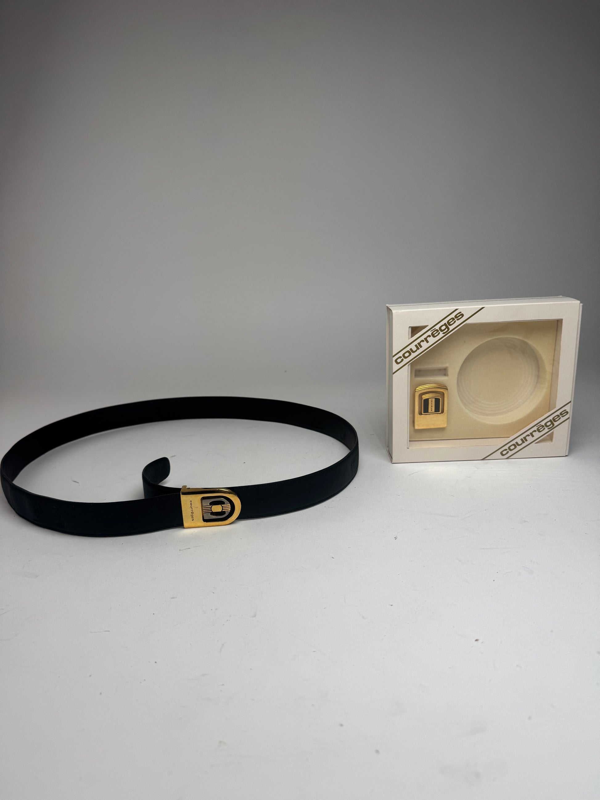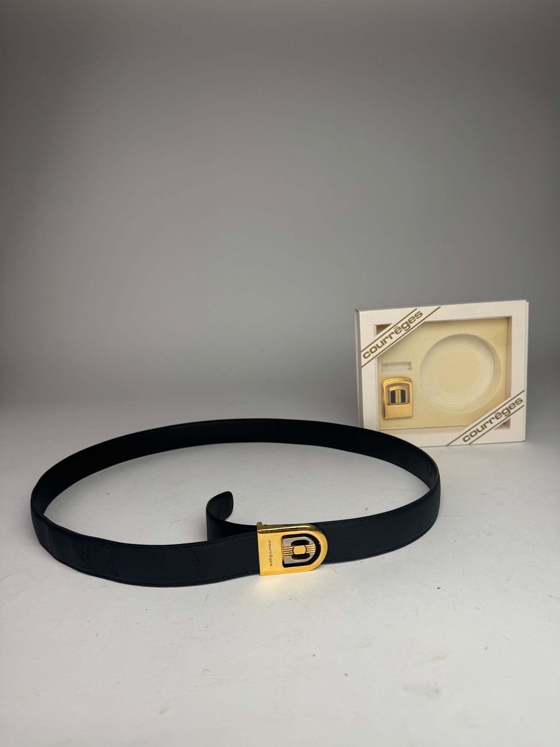 This chic vintage belt set comes in its original packaging and includes a black leather belt with two interchangeable buckles. One buckle is crafted of bi-color silver and gold-tone steel, while the other is in full gold-tone steel. Both buckles feature engraved script detailing and are made in Italy. The black leather belt, made in France, measures 110 cm in length and 3 cm in width.