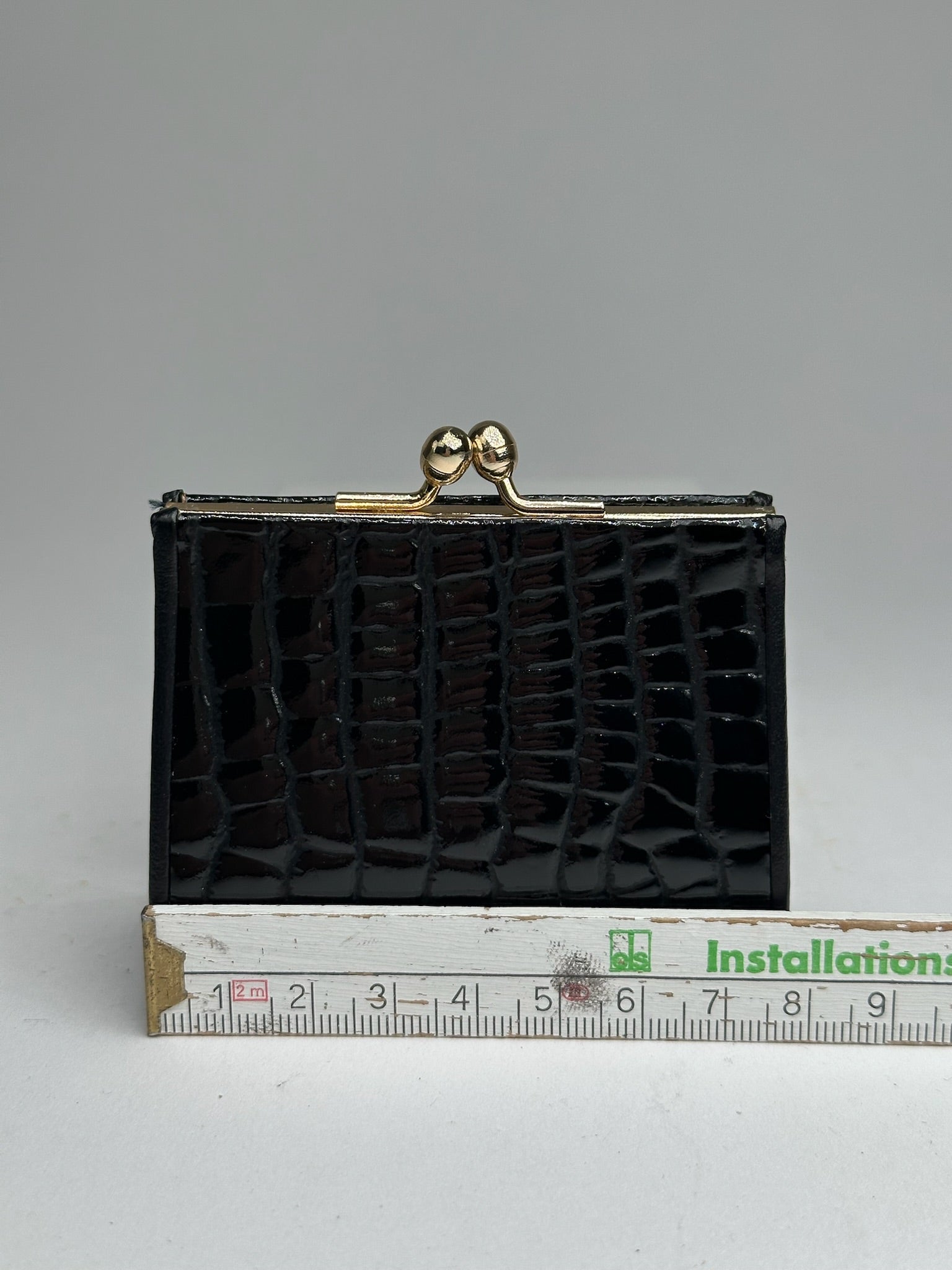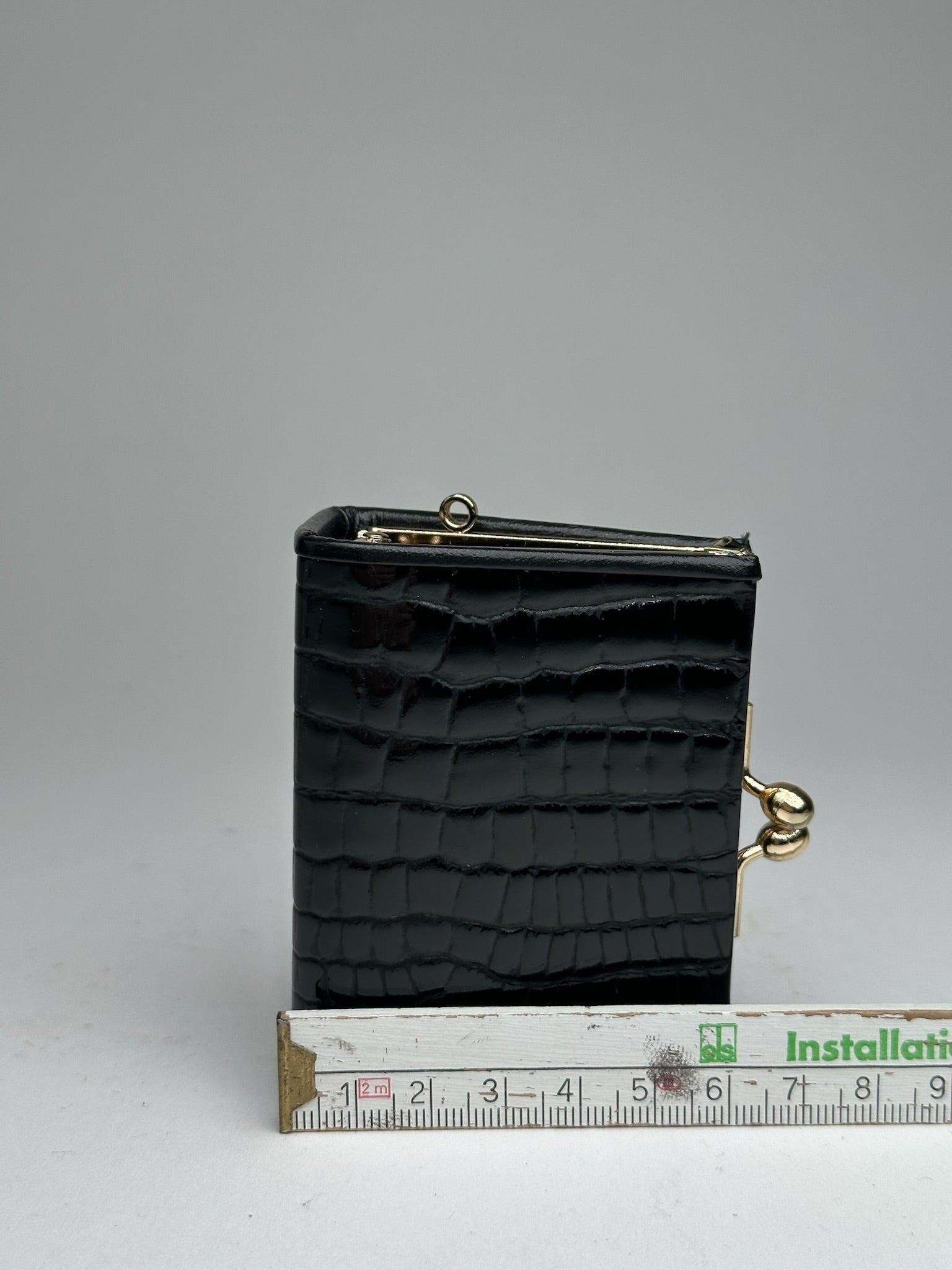 This elegant vintage card holder is finely crafted from black croc-embossed leather. It features gold-toned steel hardware and a flap closure for secure access. The interior is lined with smooth black leather. This unisex accessory comes in its original Courrèges box.