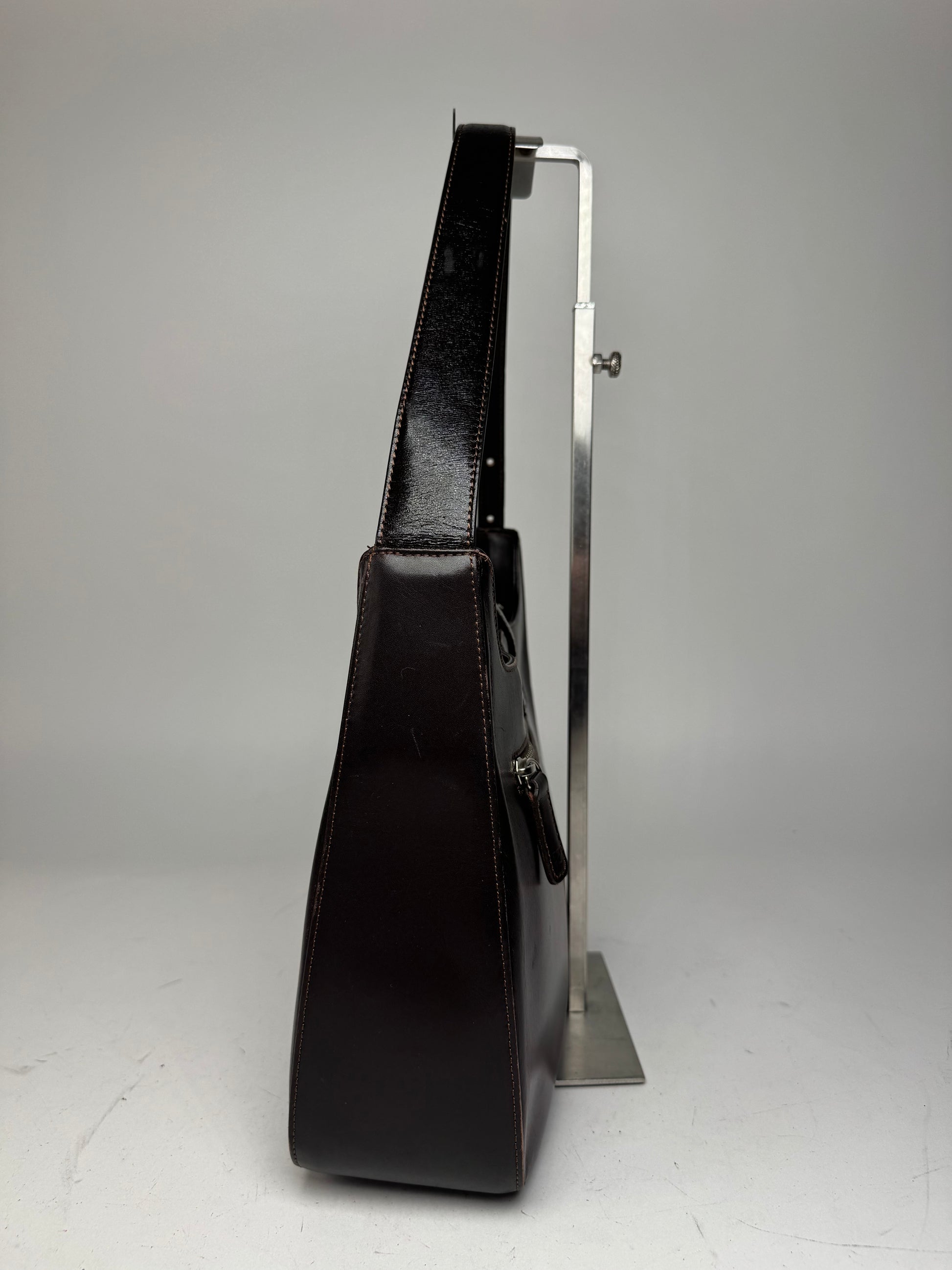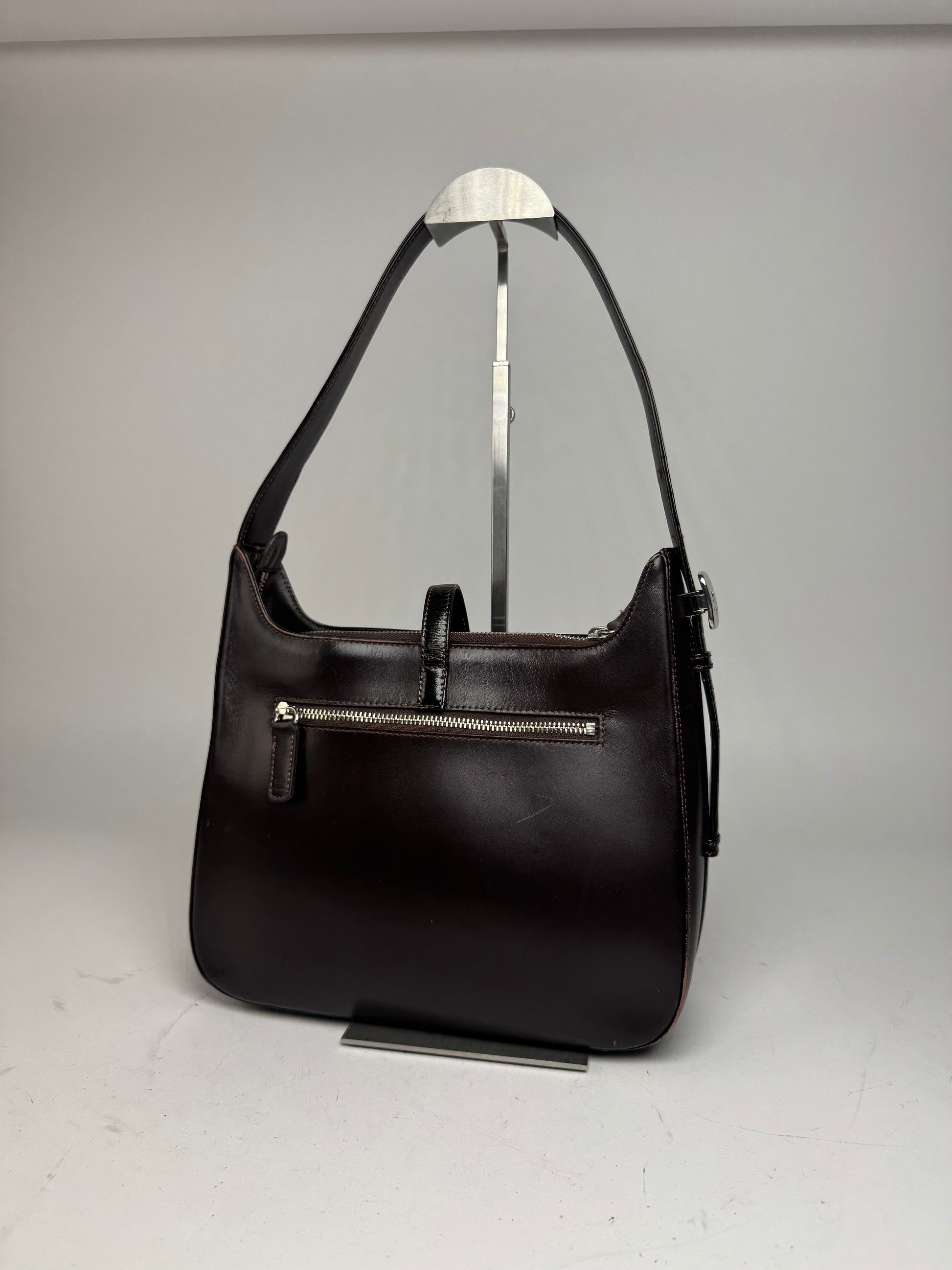 This sophisticated vintage handbag is finely crafted of smooth brown leather with silver-tone steel hardware. Courrèges, founded in Paris in 1961 by André Courrèges, is celebrated for its futuristic design vision and minimalist aesthetic that redefined modern elegance. The bag features a mid-length adjustable strap, a front magnetic closure embossed with the Courrèges logo, and a rear exterior zipper pocket. The interior is lined in reddish-brown canvas and includes three compartments for organized storage.