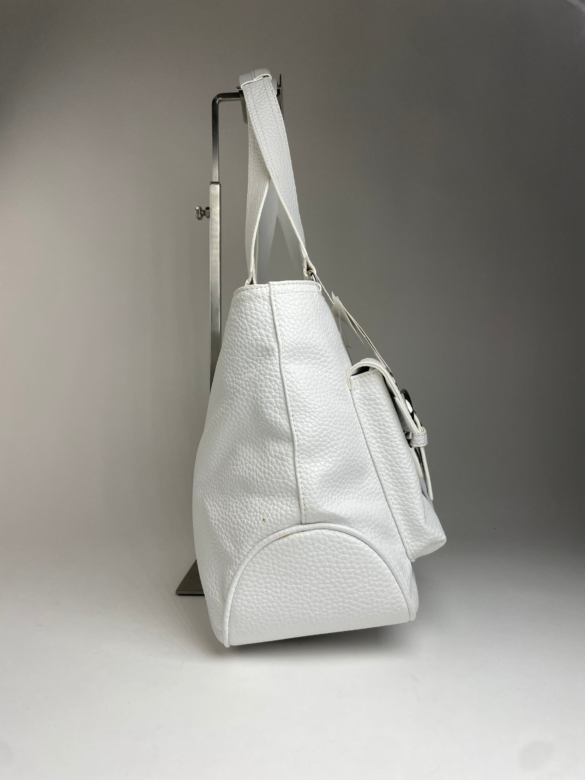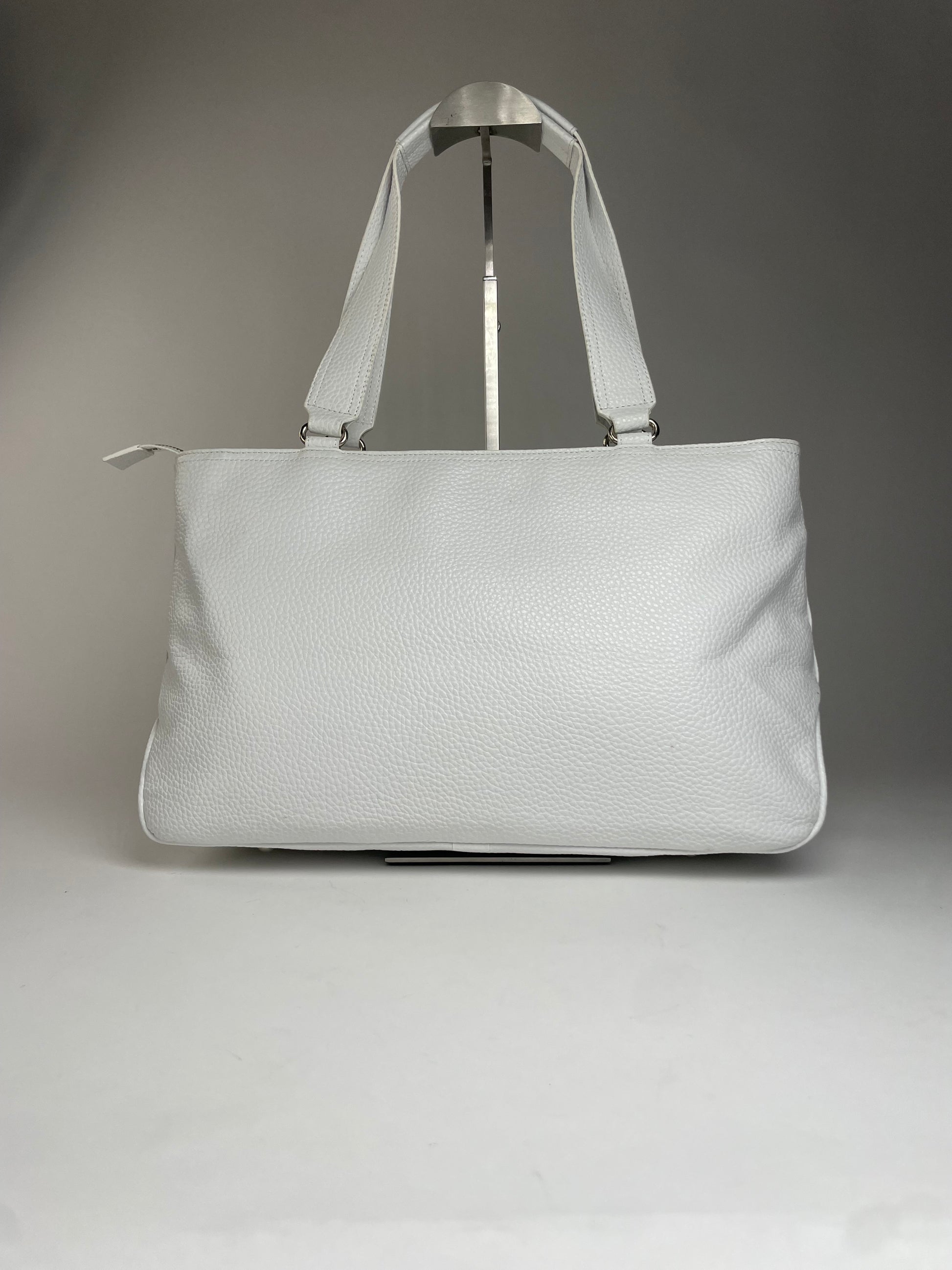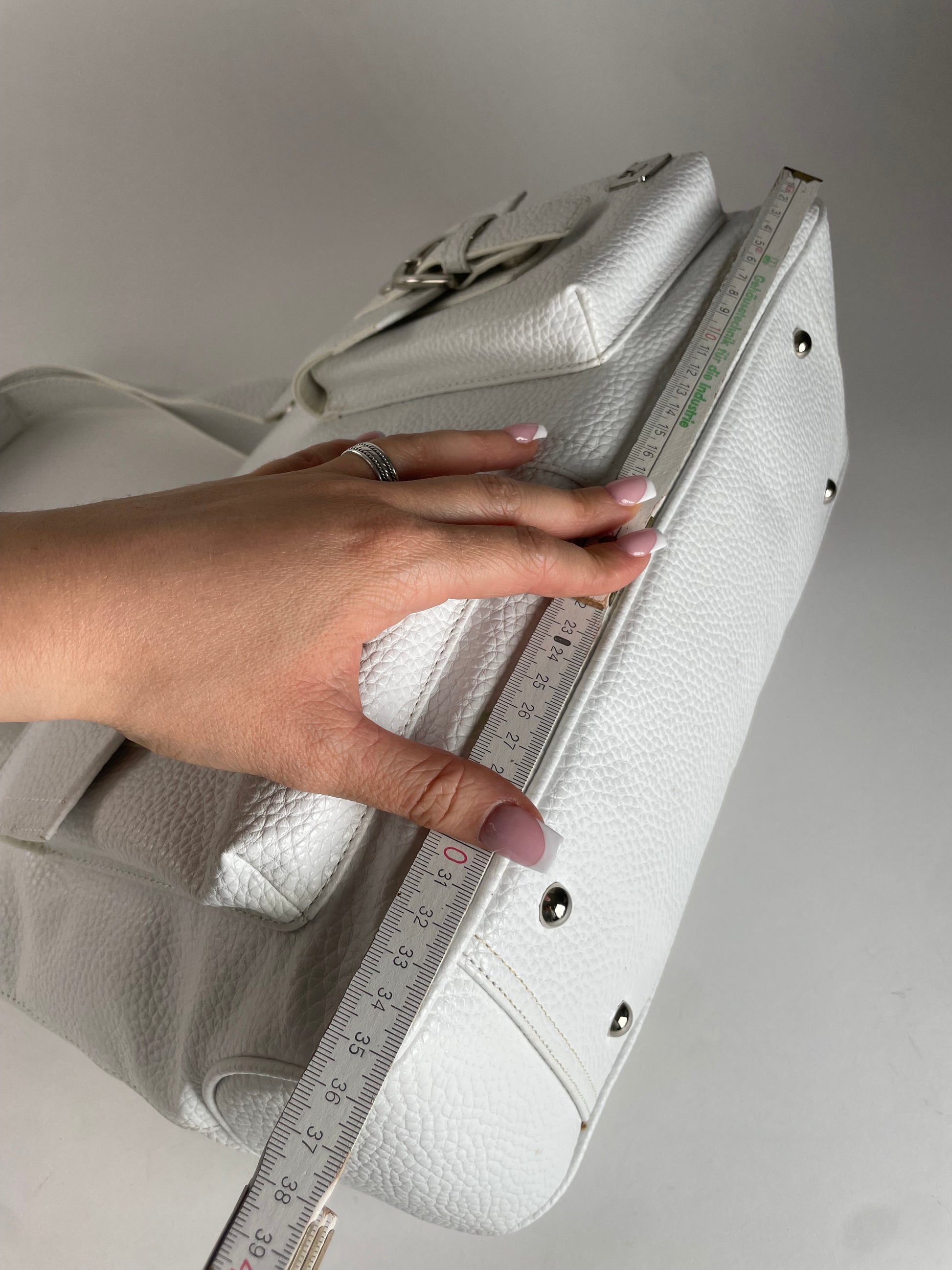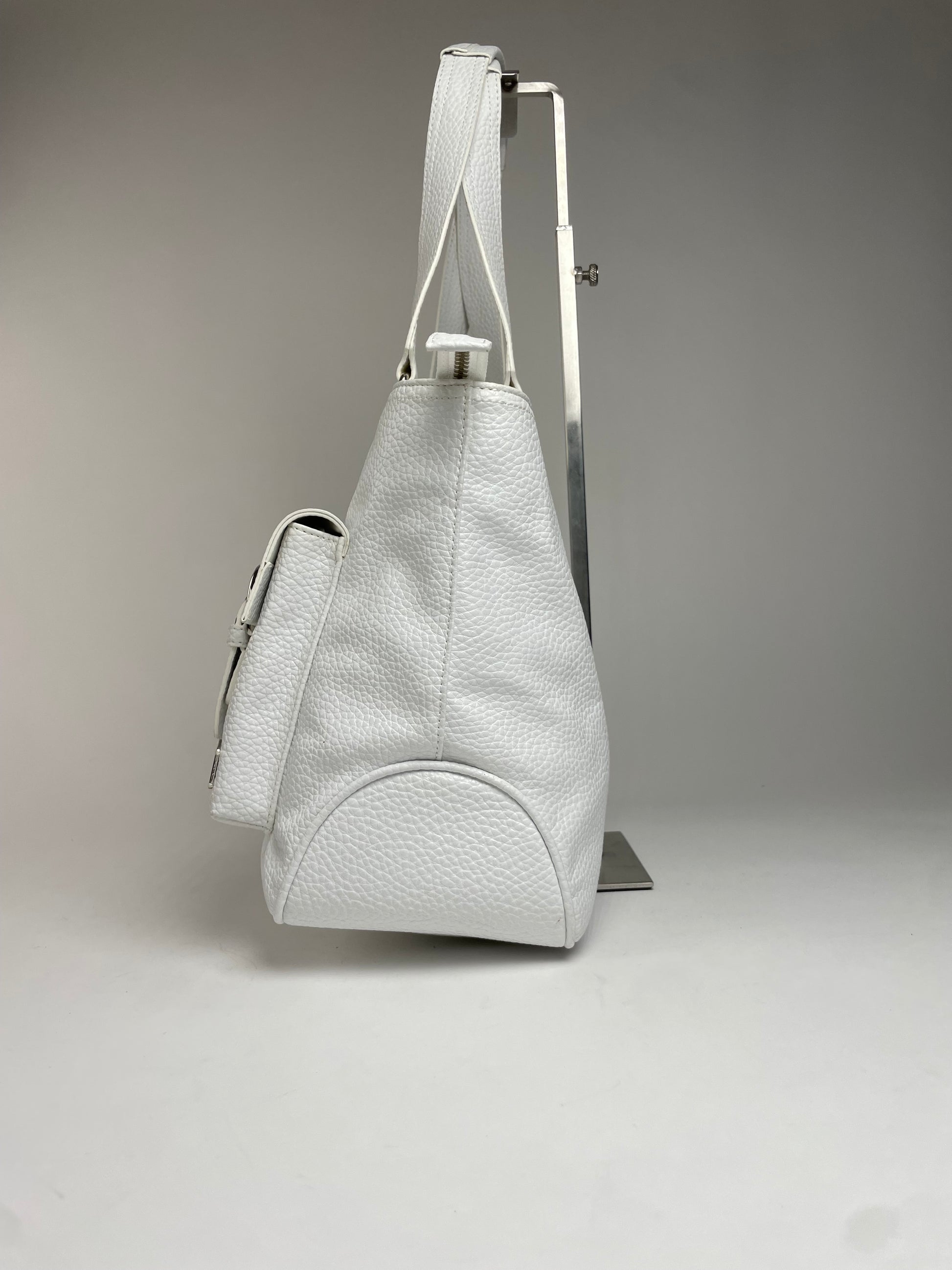 COURRÈGES PARIS Vintage Handbag. This chic handbag is crafted from white leather and features two medium-length handles, a top zipper closure, and a silver steel Courrèges logo on the front. The design includes two small front pockets with strap closures and likely dates from the 1990s.