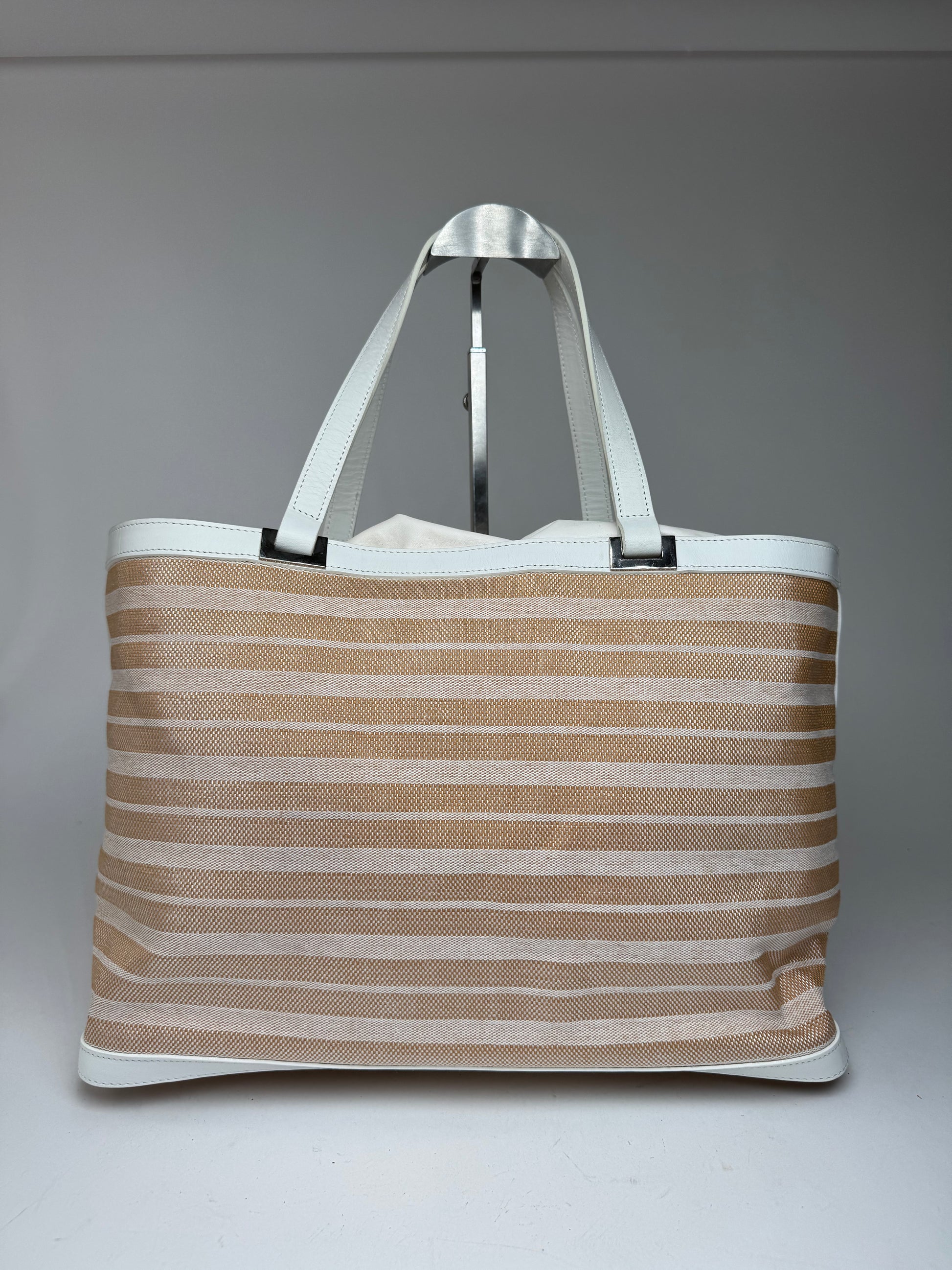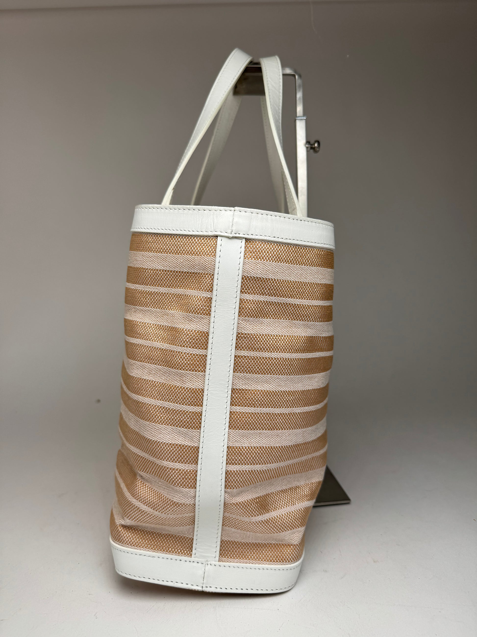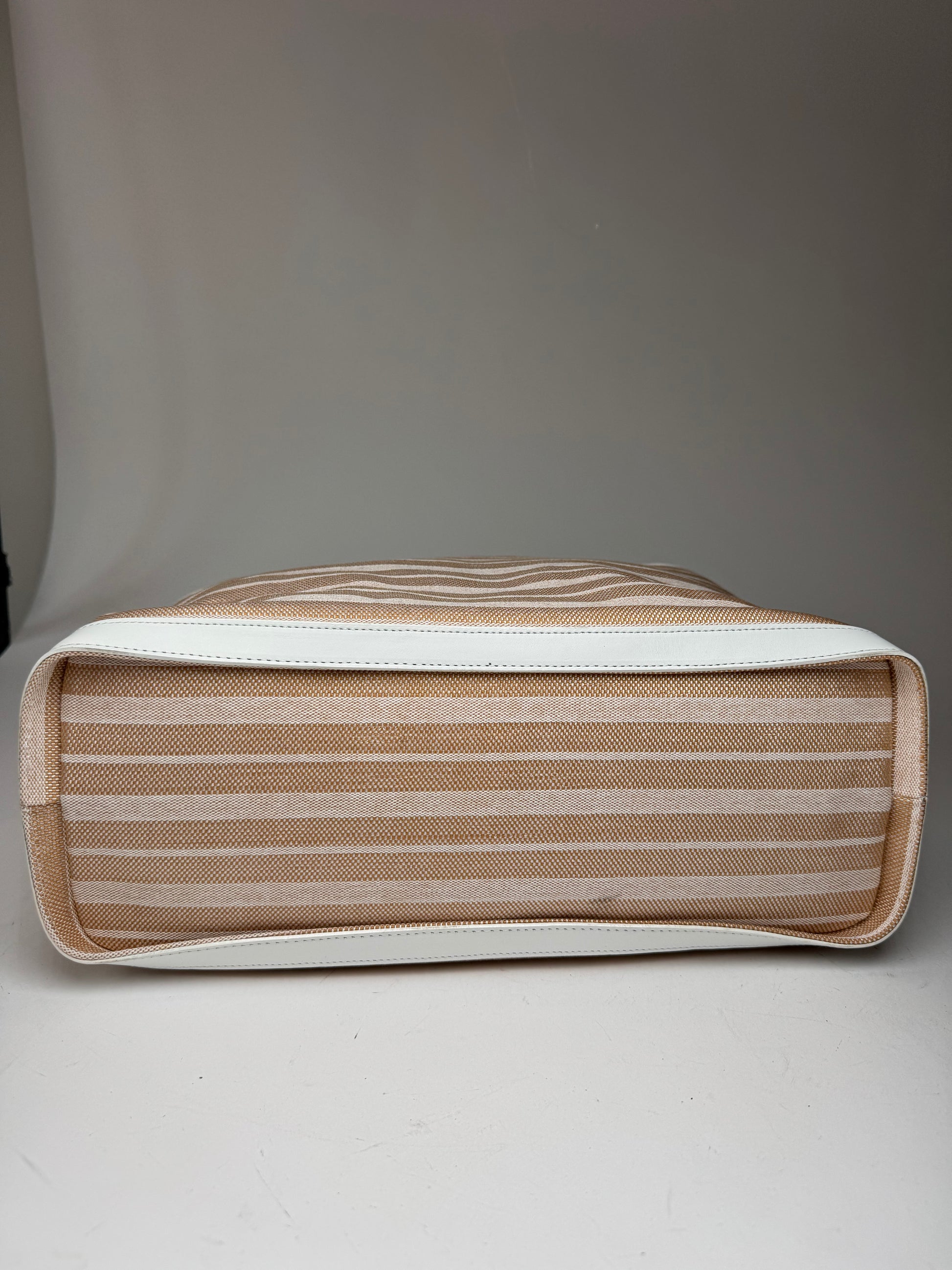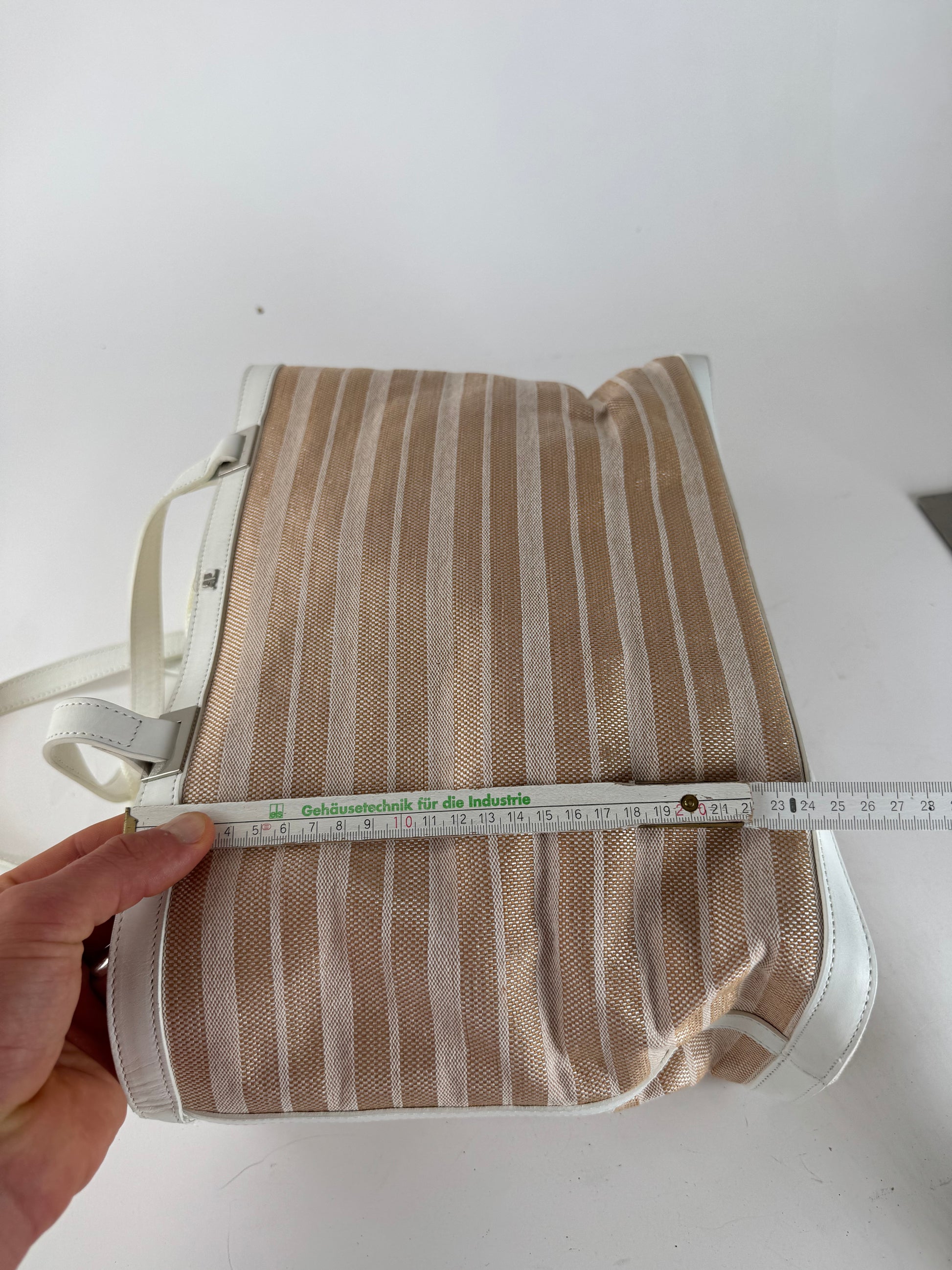 COURRÈGES PARIS Vintage Shopper Bag. This vintage Courrèges Paris shopper bag features a brown and white striped design with a white leather-lined interior. It includes two leather handles and can be worn comfortably over the shoulder. The silver-tone steel hardware adds a modern touch, and the interior can be drawn closed for added security. Please note that the interior material is sticky, but the bag remains structurally sound.