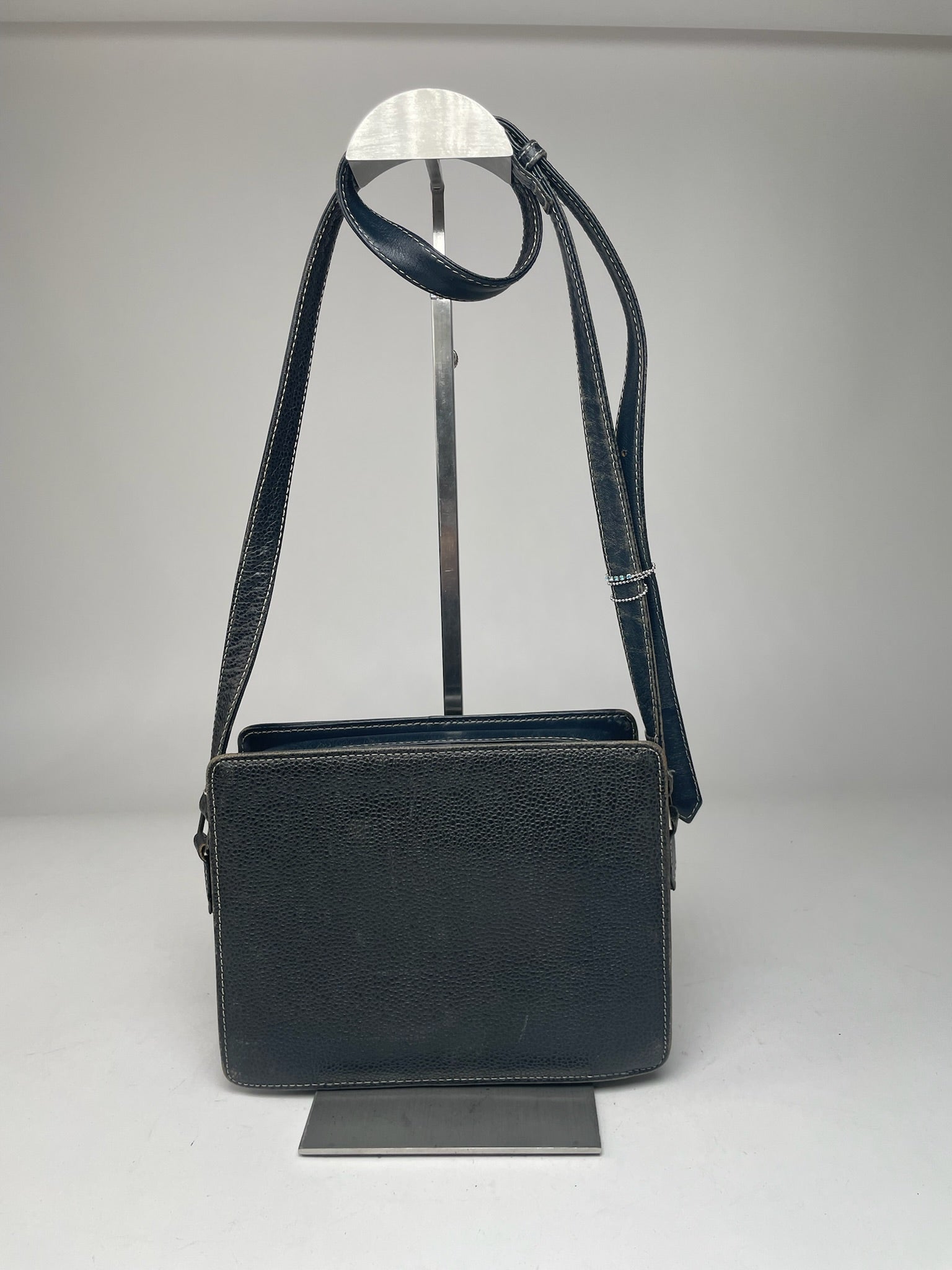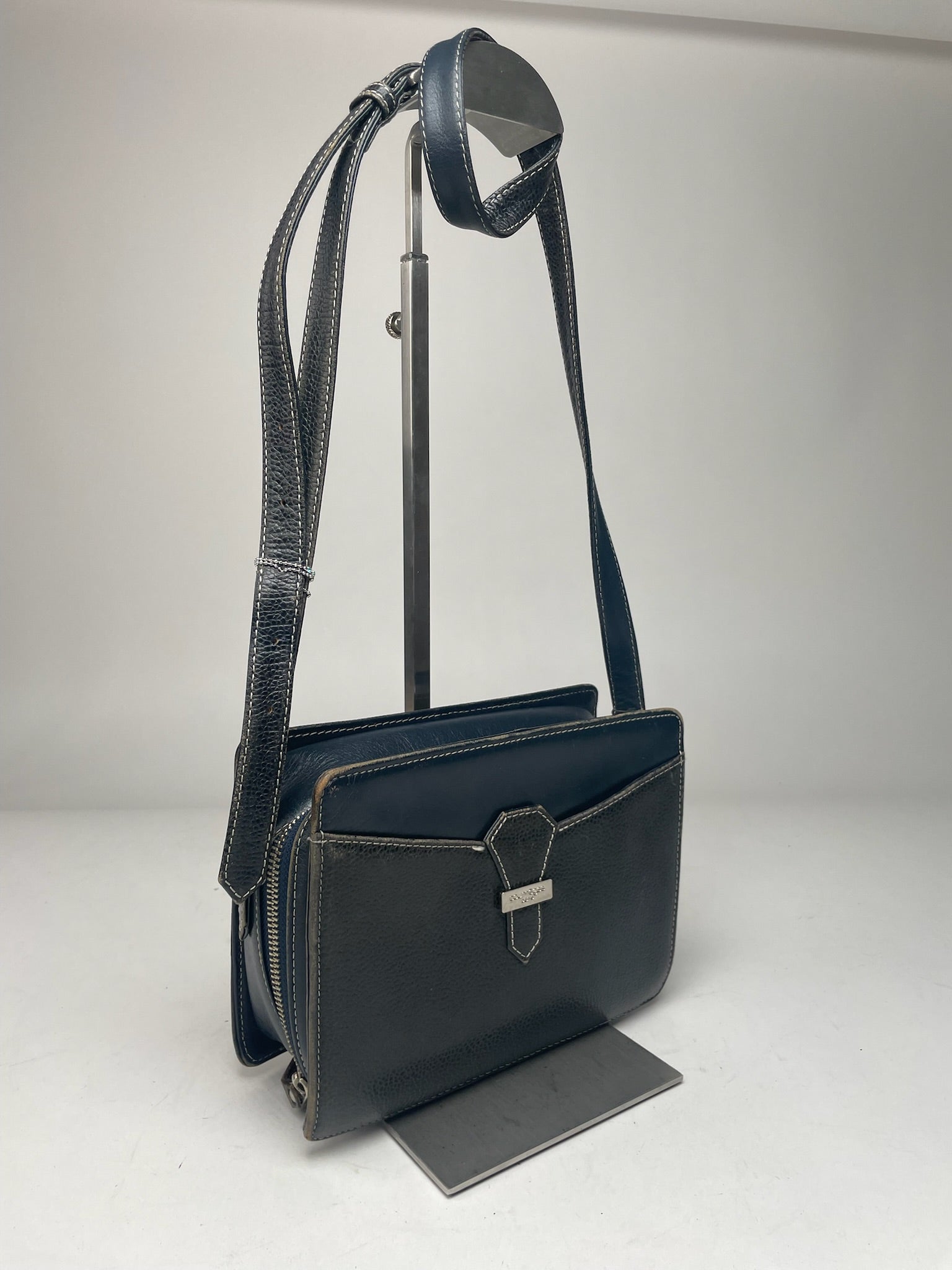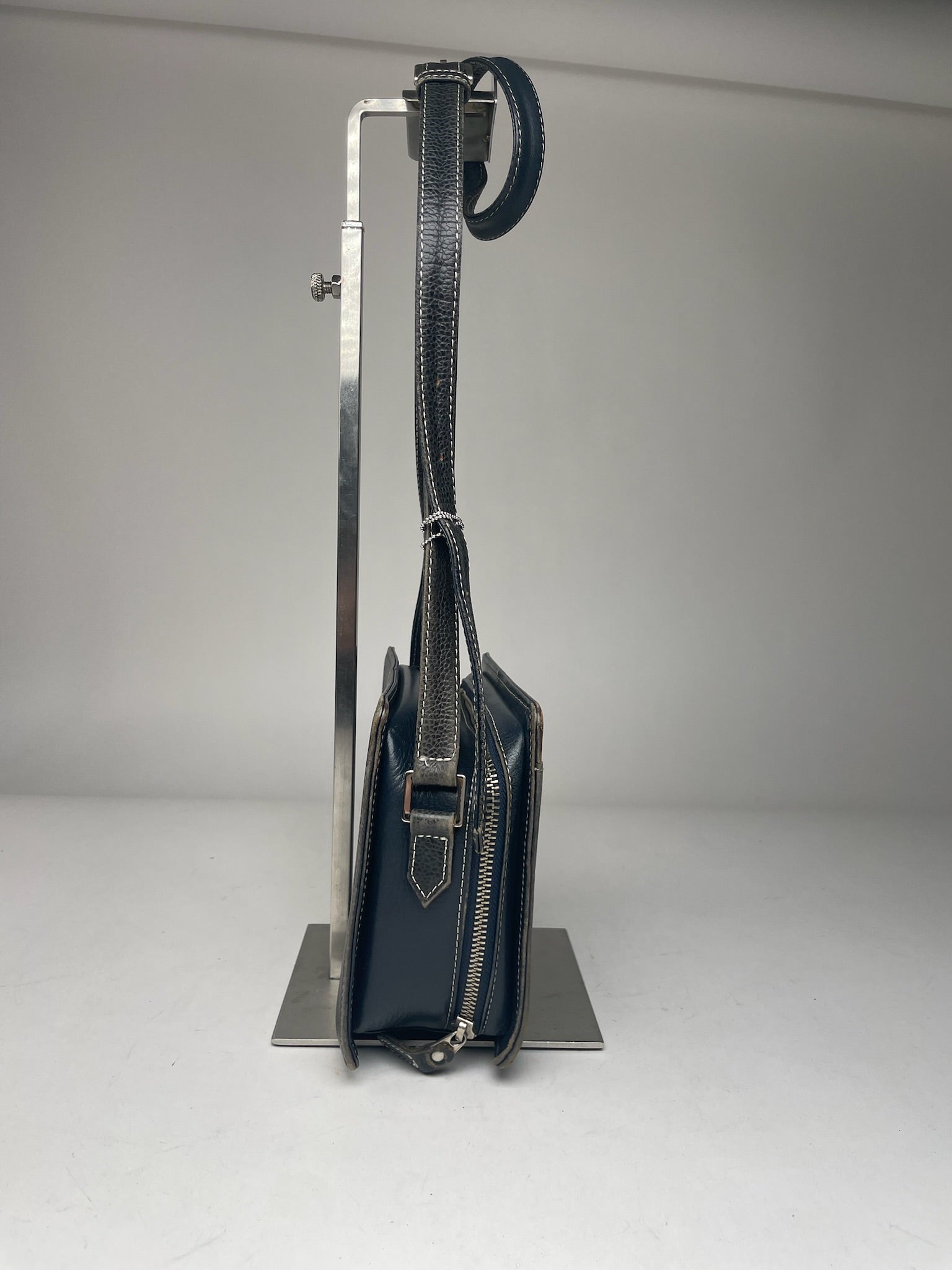 This stylish vintage bag by Courrèges Paris is crafted from navy and black leather, offering a sleek and timeless design. The hardware is made of silver steel. The bag features multiple compartments for organization and is unisex. The adjustable strap allows for a customizable fit, making it versatile for different styles and preferences.