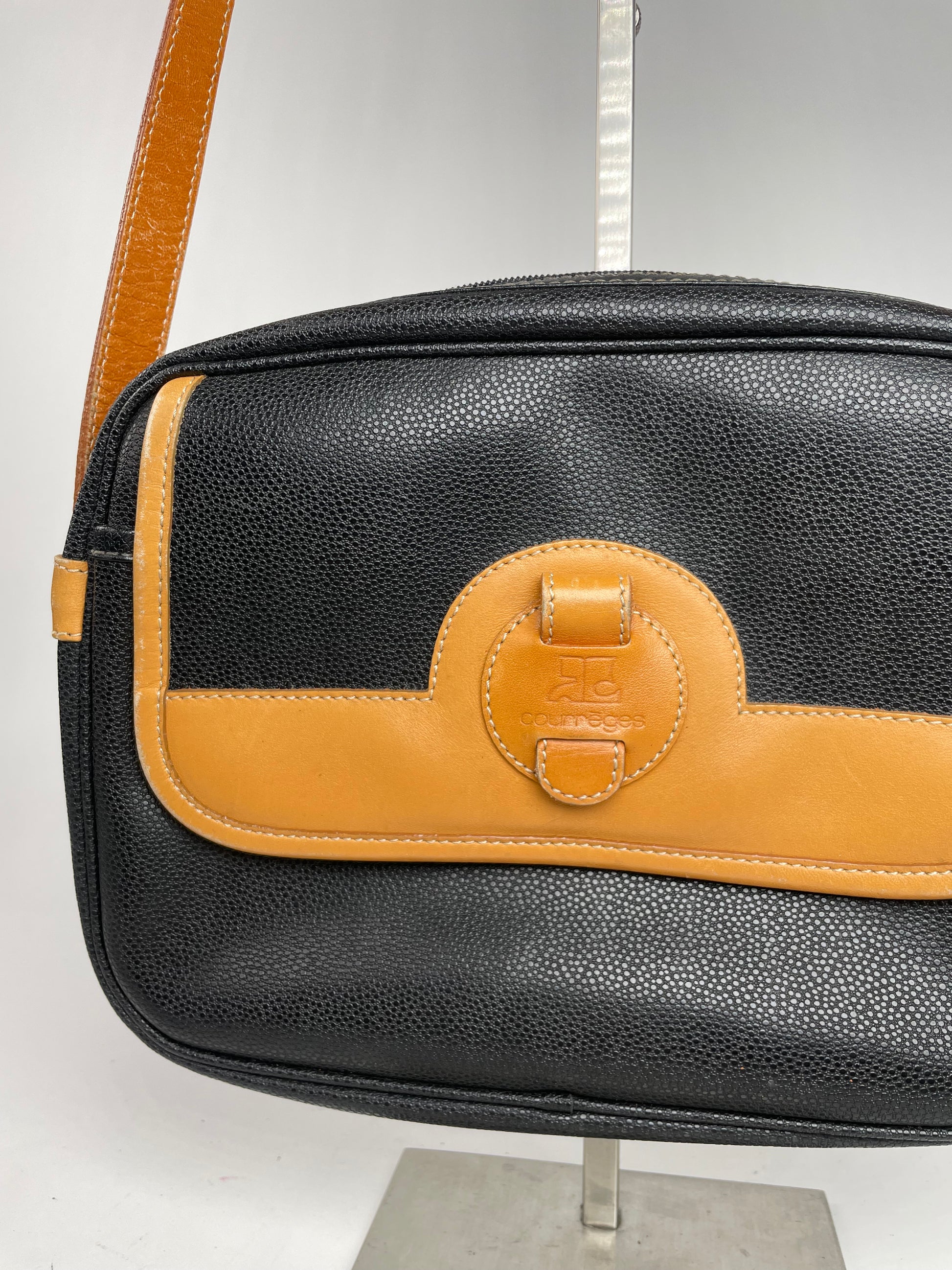 COURRÈGES PARIS Vintage Shoulder Bag. This stylish vintage shoulder bag is crafted from black and orange-brown leather, offering a bold and timeless design.