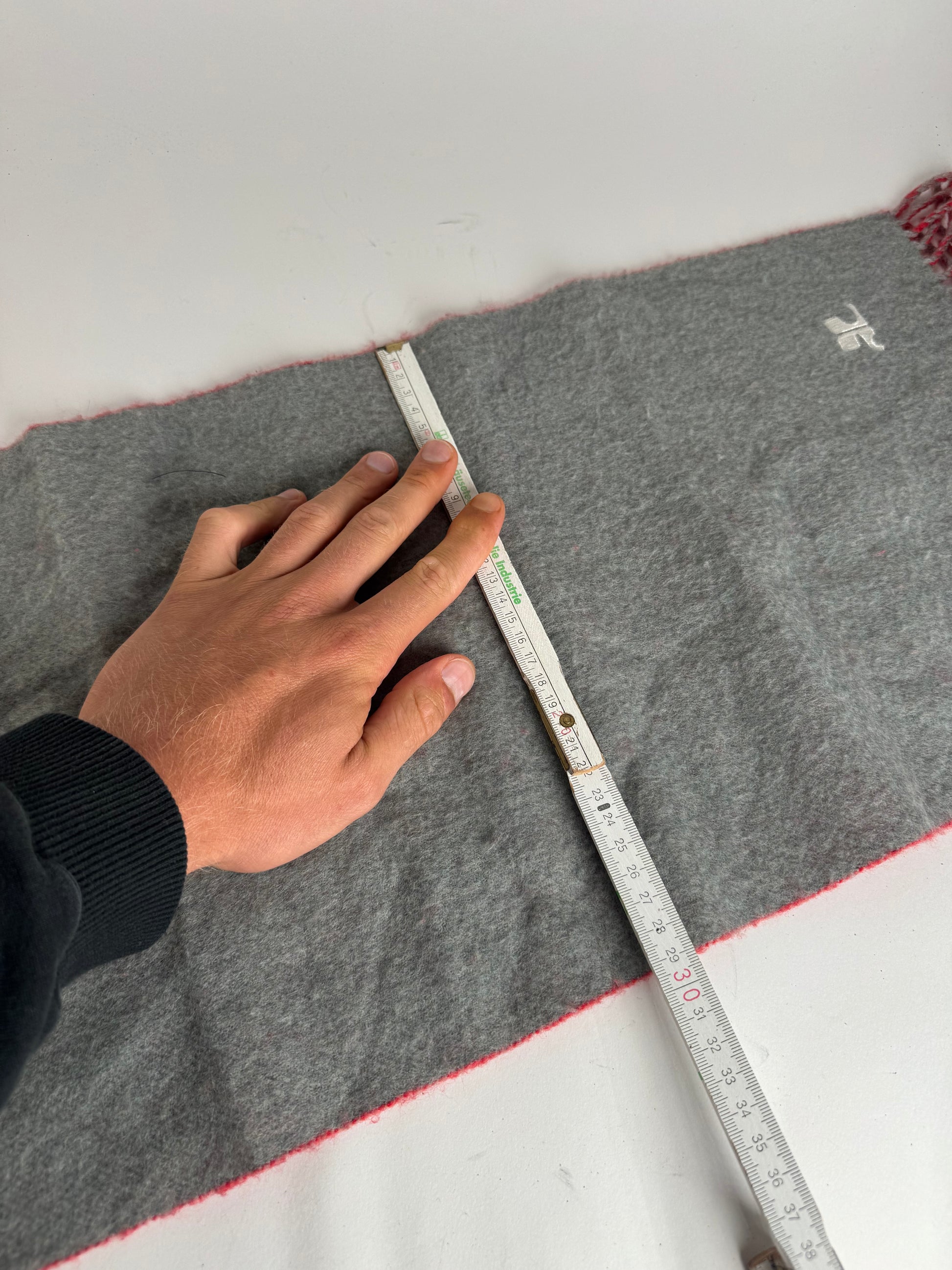 COURRÈGES PARIS Vintage Wool Scarf. This stylish scarf is finely crafted of soft wool, featuring a reversible design with one side in grey and the other in red. The white Courrèges logo is embossed on the red side.