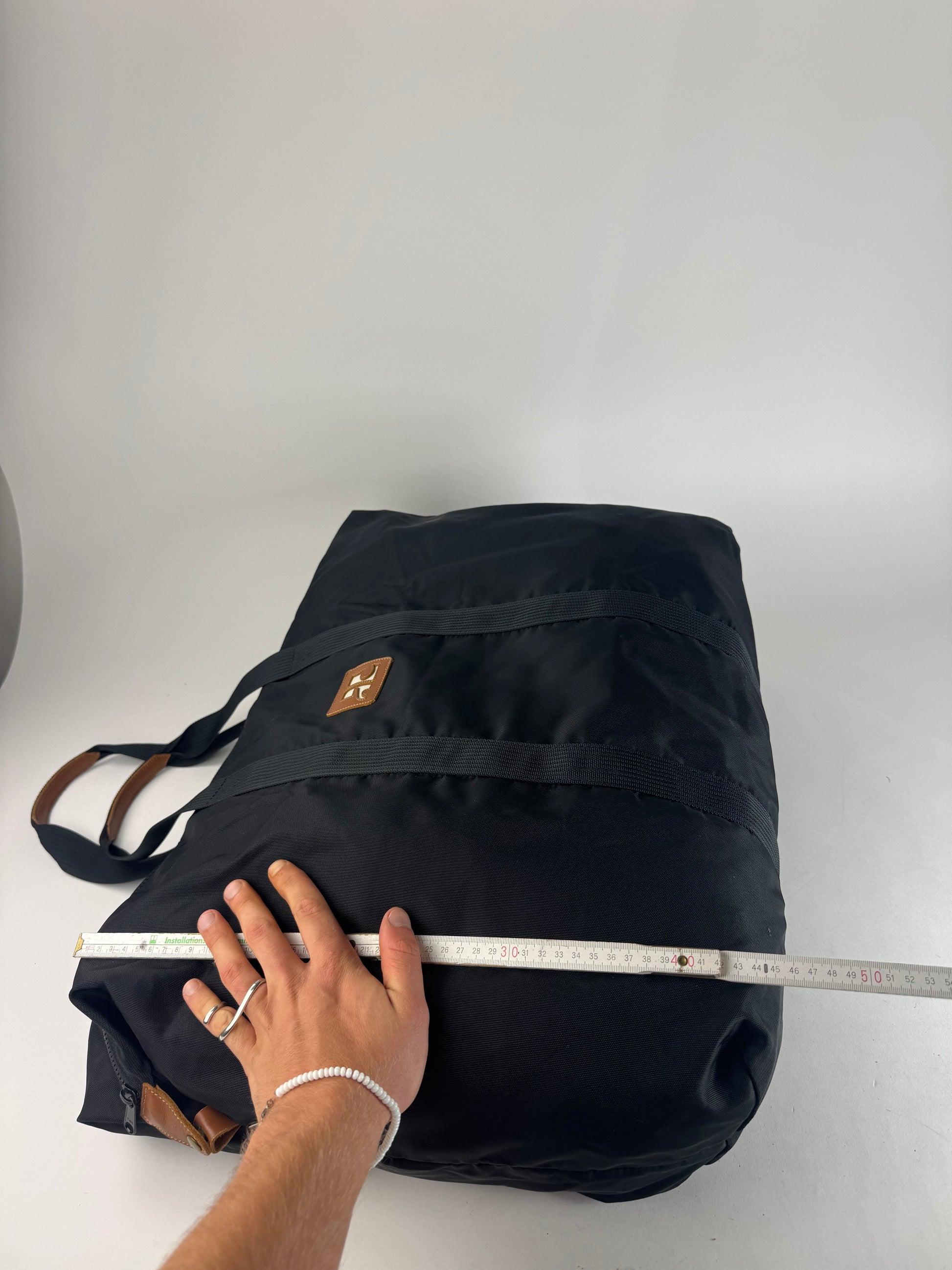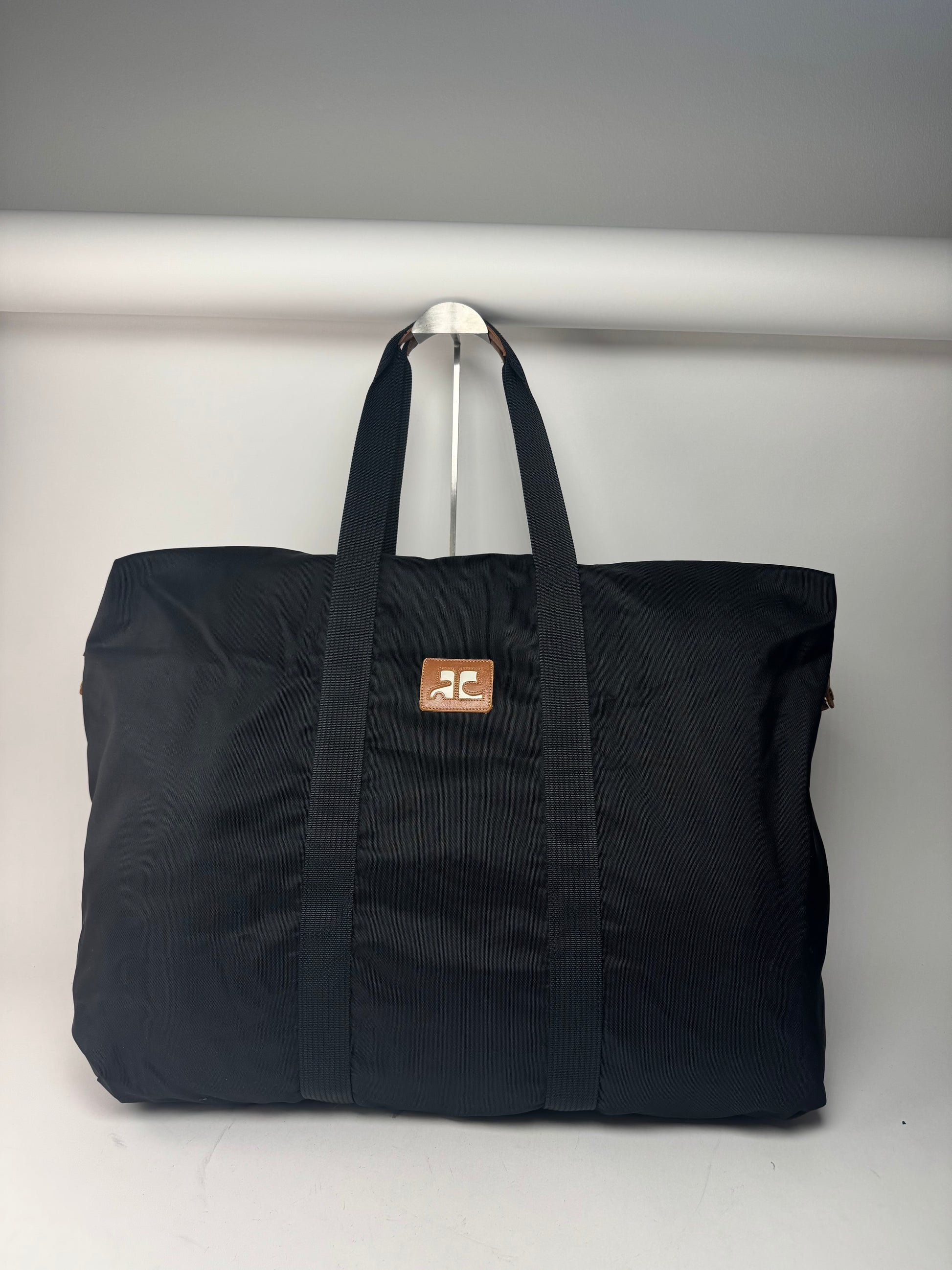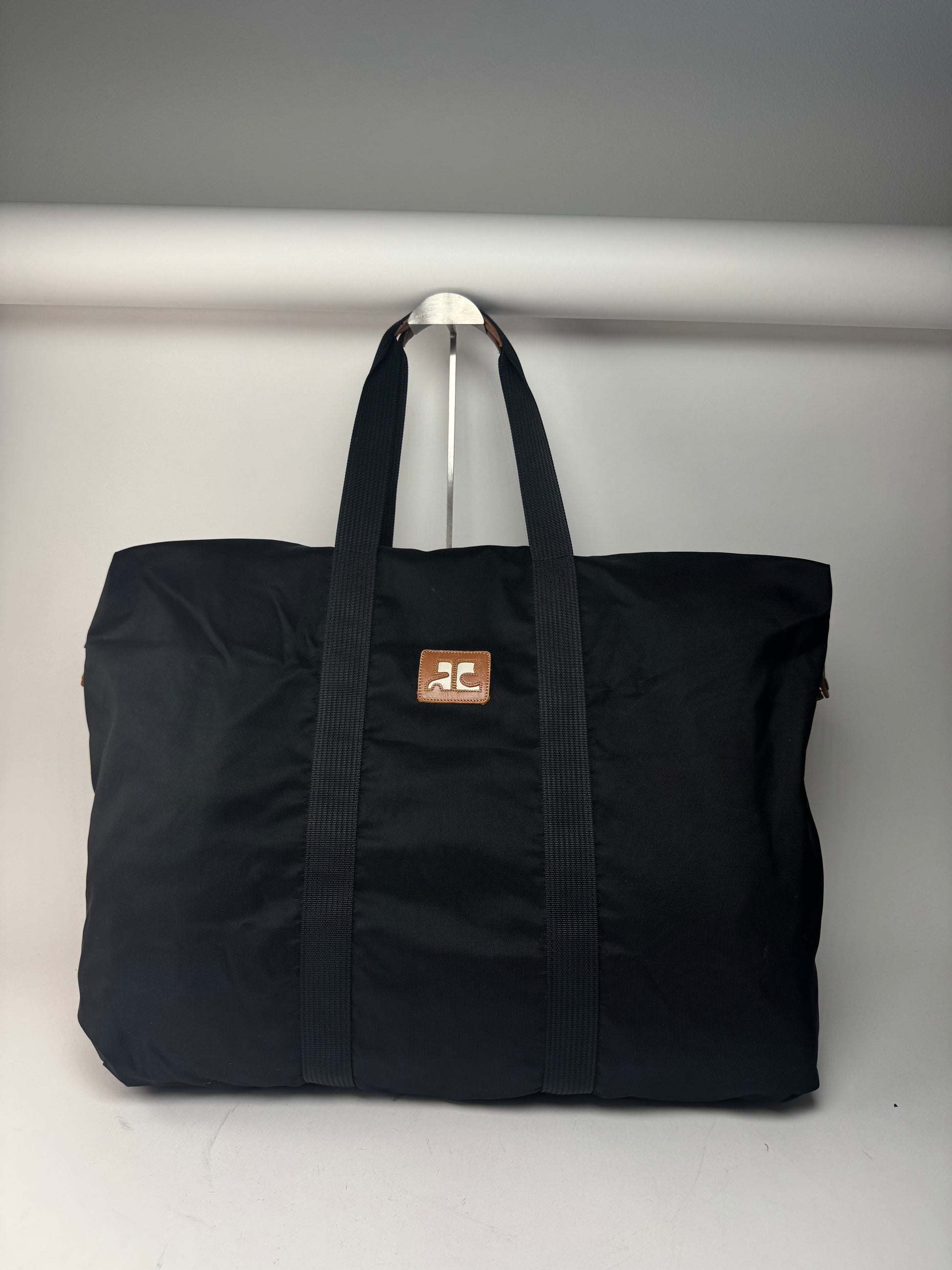 This stylish vintage travel bag is finely crafted of black canvas and features the signature Courrèges logo in brown and white leather on the front — a nod to the brand’s 1960s legacy, when André Courrèges redefined modern fashion with futuristic shapes and bold contrasts. The bag embodies that same innovative spirit in a practical, timeless design. It features a top zipper closure and snap-button fastenings on the sides. The interior is lined in matching black canvas.