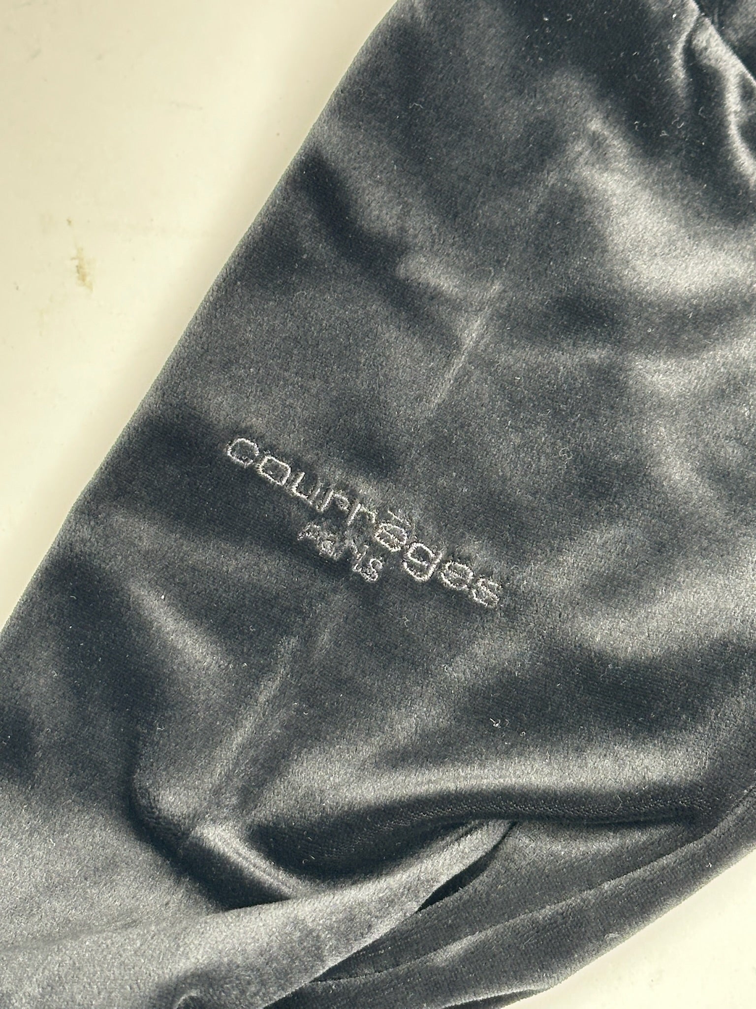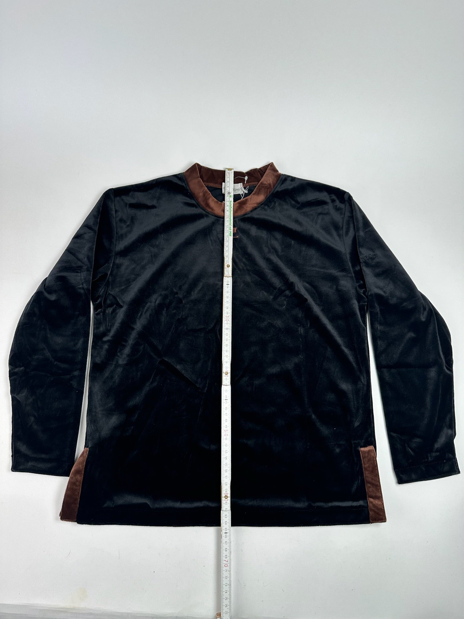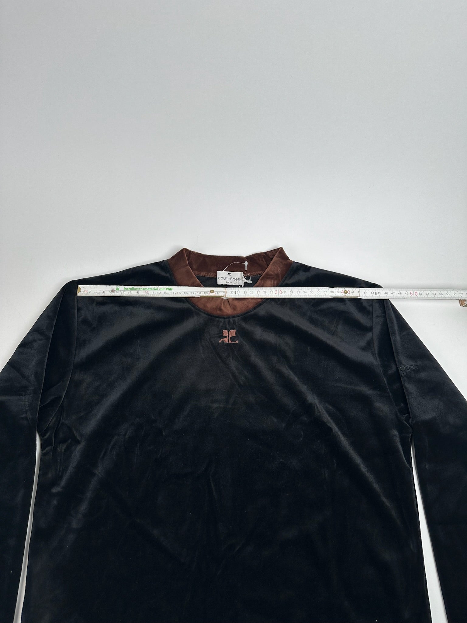 COURRÈGES Vintage Velvet Sweater. This chic sweater is finely crafted of black velvet with brown velvet accents and features a classic crew neckline.