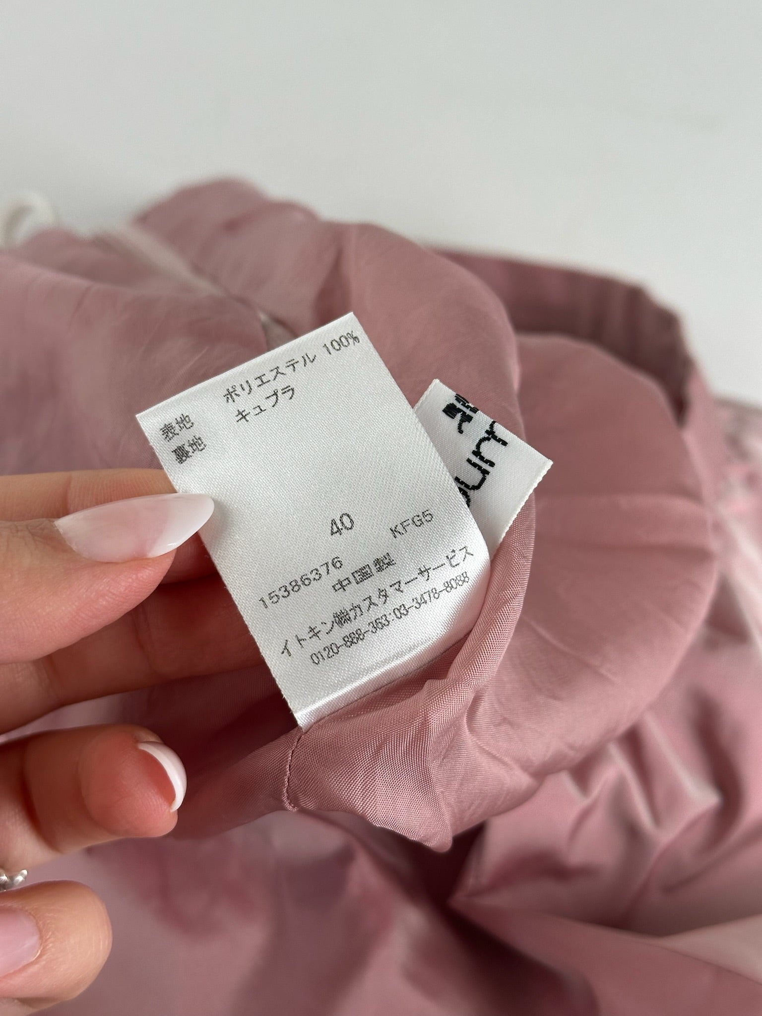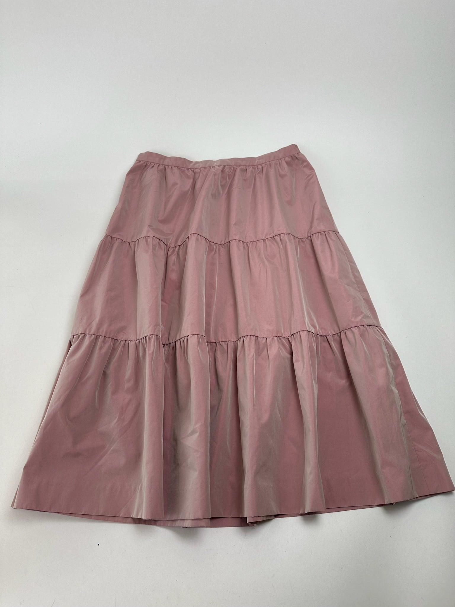 COURRÈGES PARIS Vintage Skirt. This chic skirt is finely crafted of pink, silk-like polyester with a slightly reflective finish.
