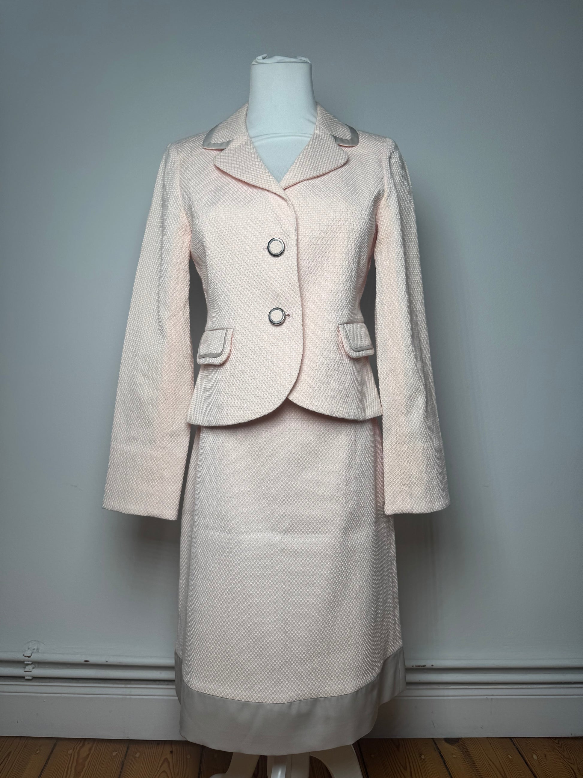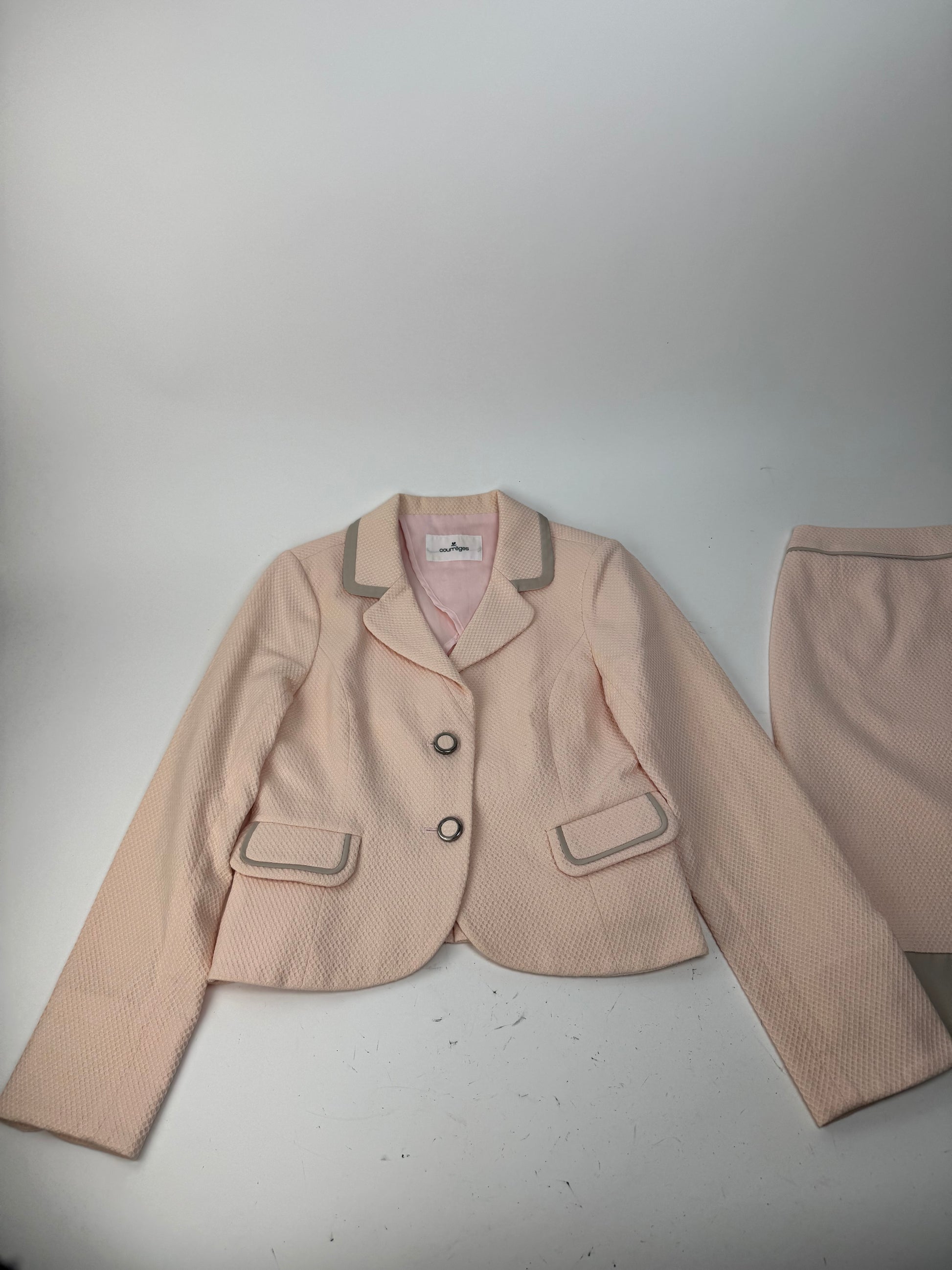 COURRÈGES PARIS Vintage Wool Skirt Suit. This striking two-piece set from the iconic French fashion house Courrèges is crafted from pink wool in a subtle snakeskin texture with contrasting grey elements. The ensemble includes a tailored blazer and matching high-waist skirt, both finished with silver-tone steel hardware and a soft pink viscose lining. Model on photo is size 38/M.