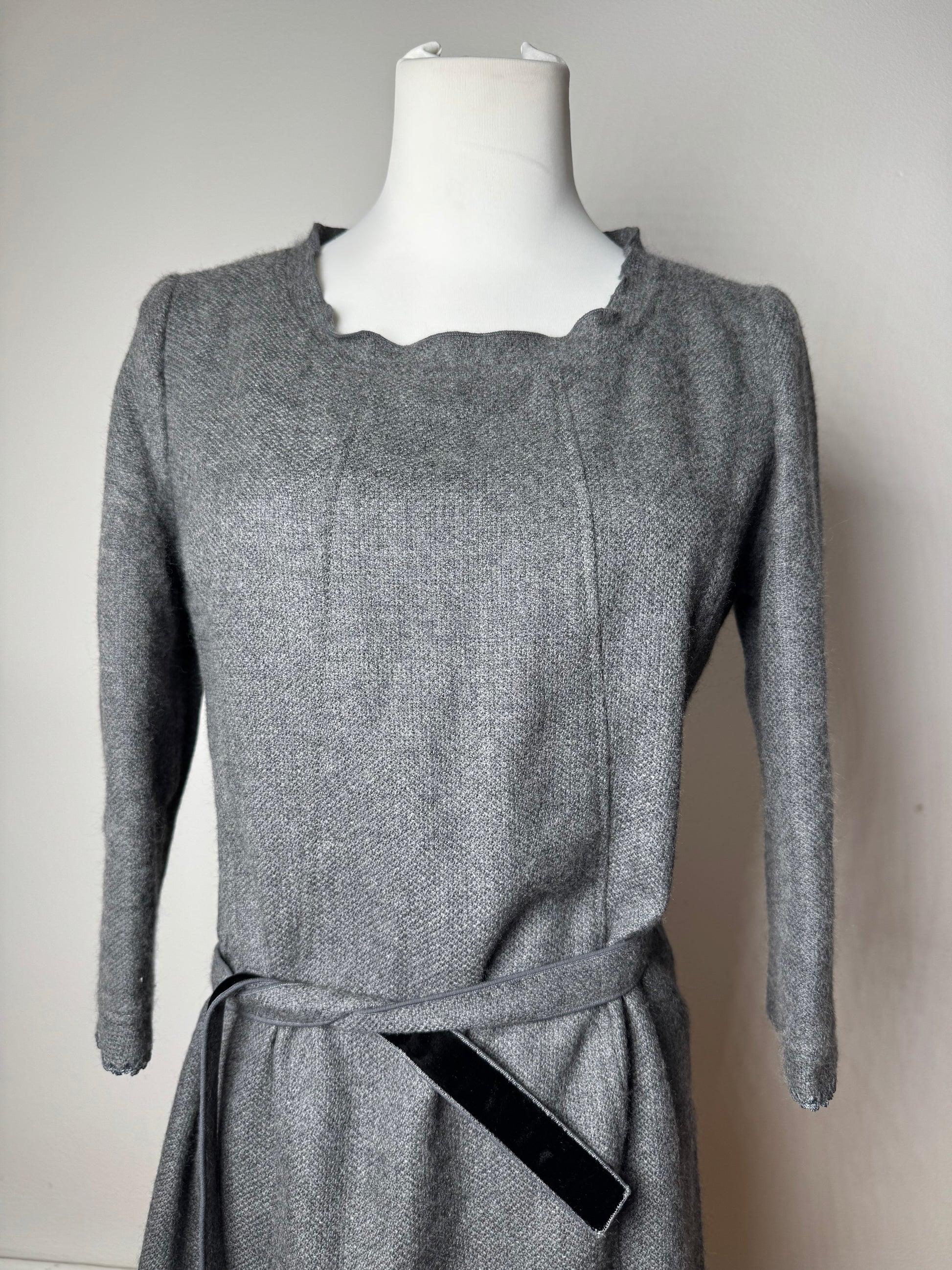 This chic dress is finely crafted from grey wool and features a round neckline, a matching belt, and a back zipper closure. The interior is lined with viscose for comfortable wear.