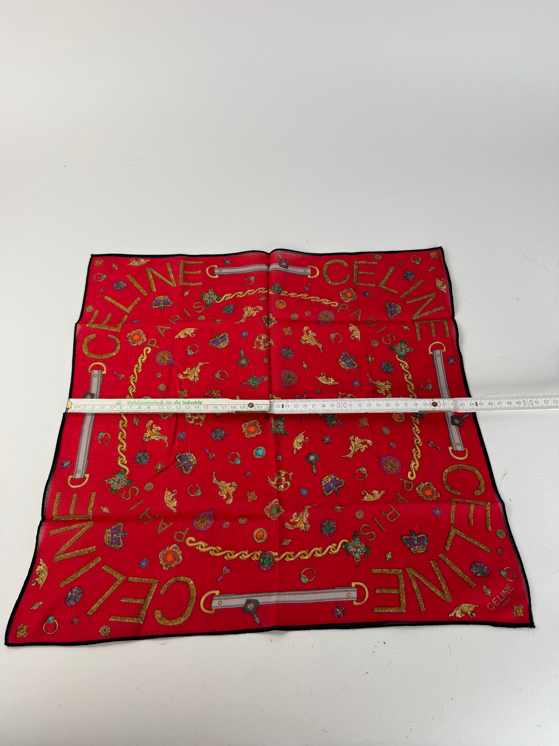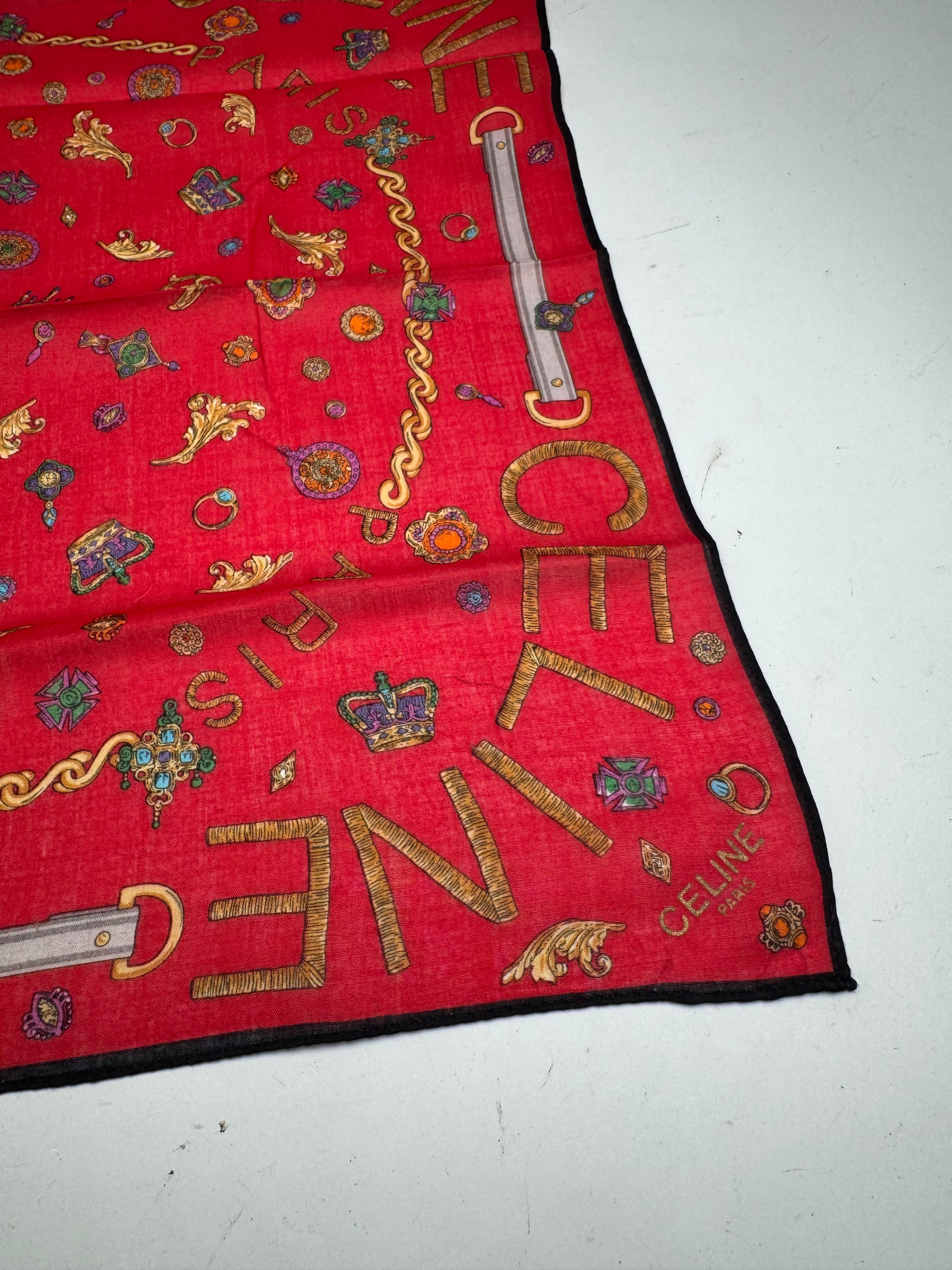 CELINE Vintage Printed Scarf. This vintage scarf is crafted from a luxurious blend of silk and cotton with a rich red base color. The piece features an ornate baroque-style print with golden CELINE logos, crowns, jewelry elements, and decorative motifs throughout.
