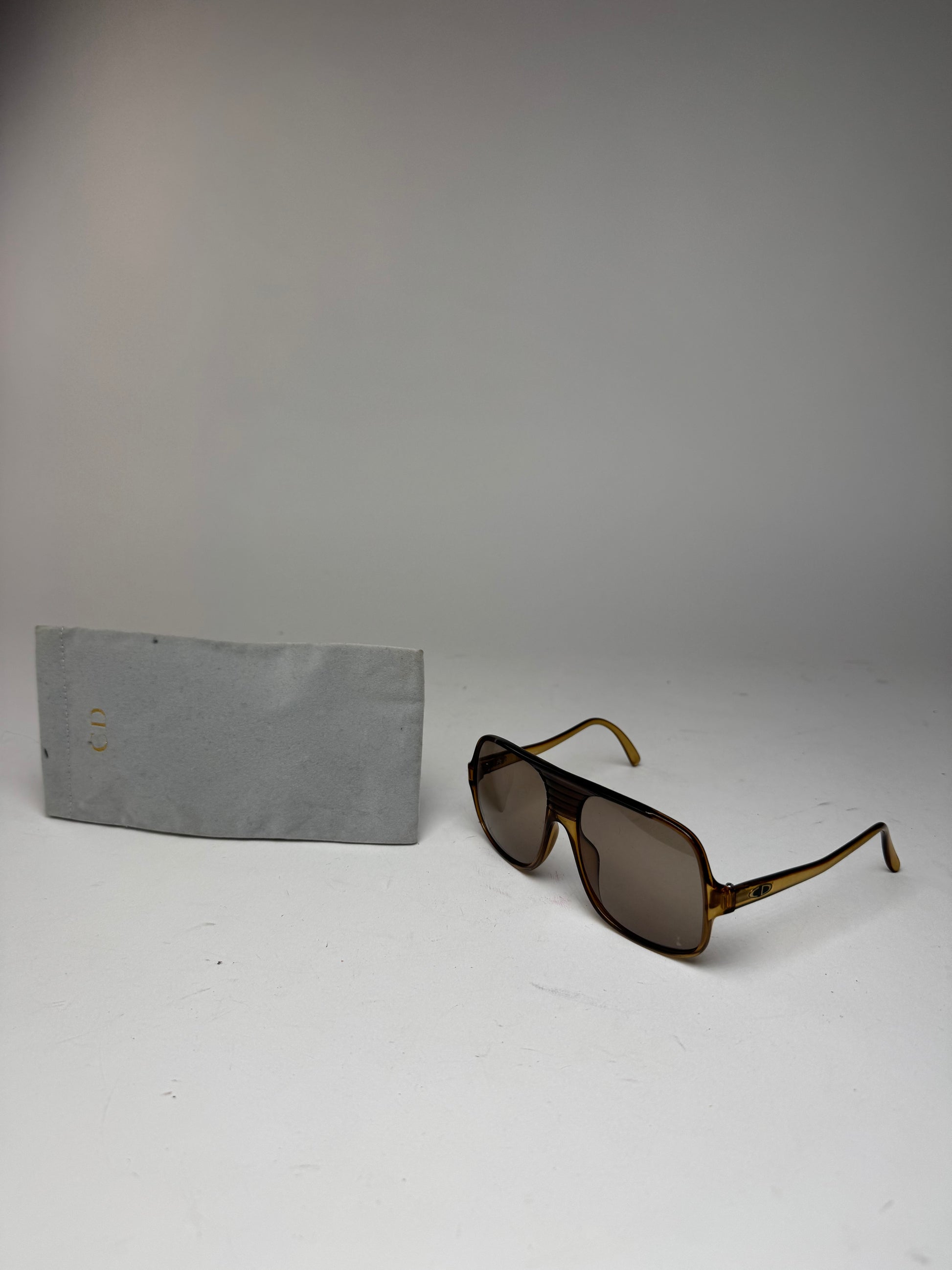 These vintage pilot-style sunglasses are crafted from translucent orange-brown acetate and feature signature gold-tone Christian Dior logo appliqués on both temples. The design combines 1970s-inspired flair with the timeless elegance Dior is known for. The lenses are dark-tinted, offering both style and sun protection.