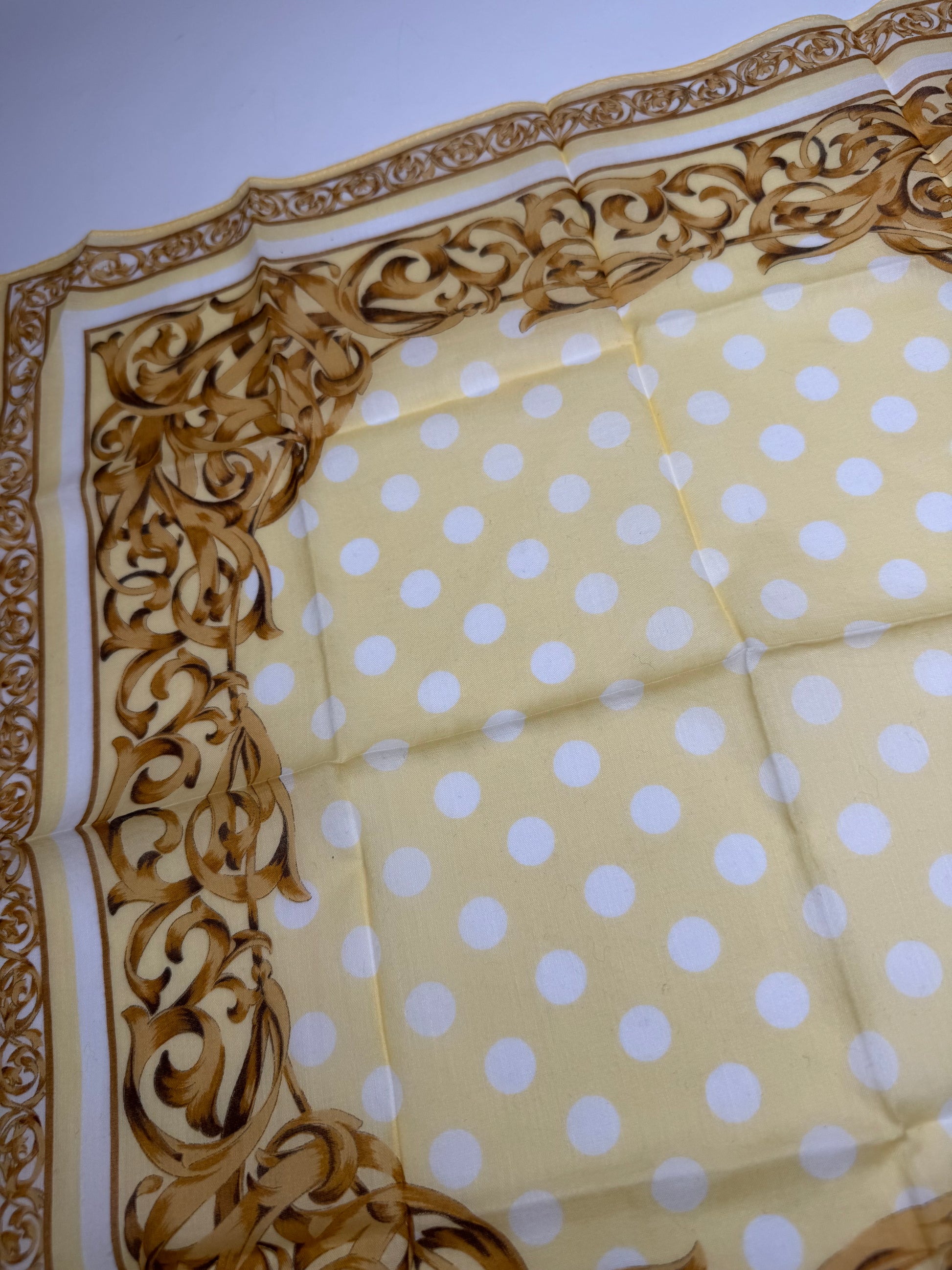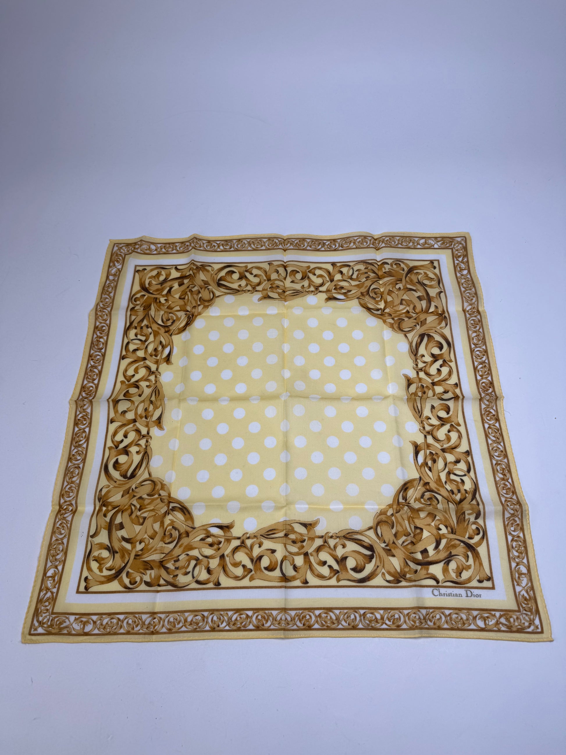 DIOR Vintage Scarf. This elegant vintage scarf features a gold and white base colour with a central area decorated with yellow and white polka dots. The design is enhanced by ornate baroque-style patterns, giving the piece a classic and luxurious aesthetic. A black Christian Dior signature is placed at the lower right on the front.