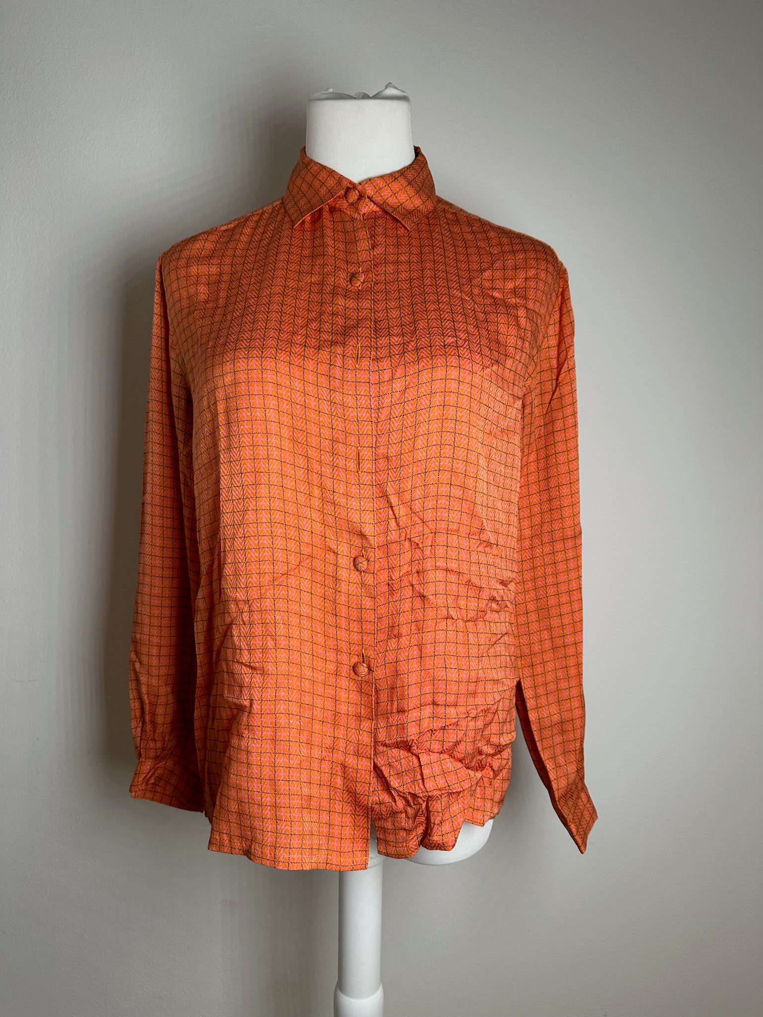 DIOR Vintage Blouse. This chic blouse is finely crafted of orange and black checkered 100% cotton fabric. The design offers a timeless silhouette, perfect for casual or elegant styling. The mannequin in the photo is wearing size M.