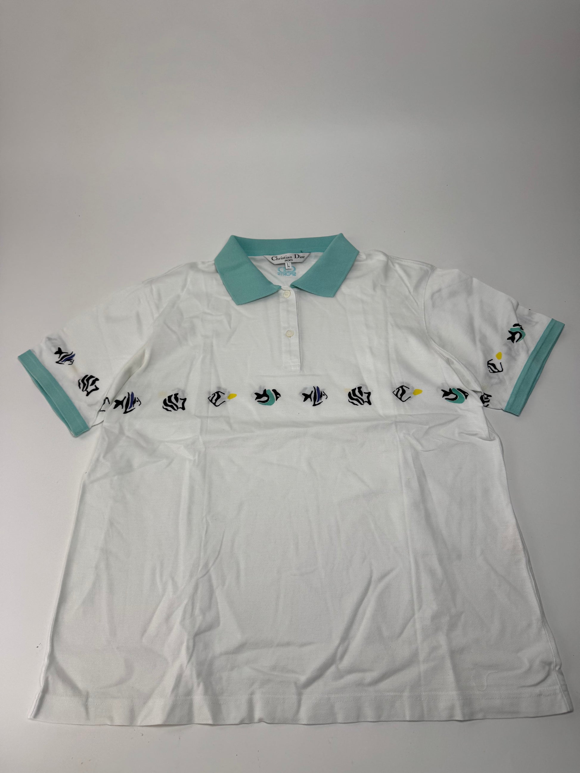 DIOR Vintage White Cotton Polo Shirt with Coral Fish Embroidery.