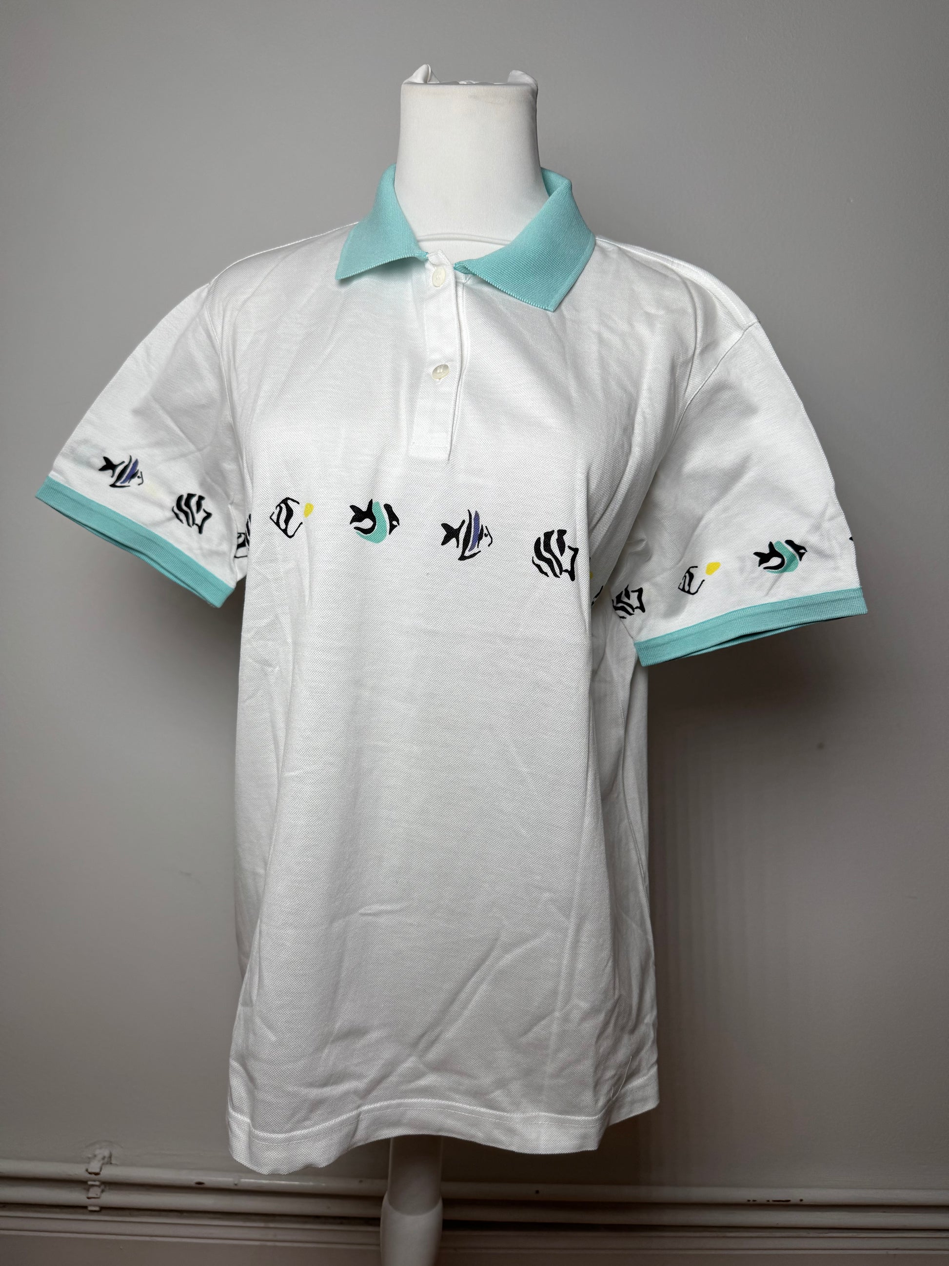 This chic vintage polo shirt is finely crafted of white cotton, featuring a turquoise collar and sleeve hems. Around the collar are embroidered coral fish motifs in black, turquoise, and yellow. The mannequin on the photos is wearing size 38/M.