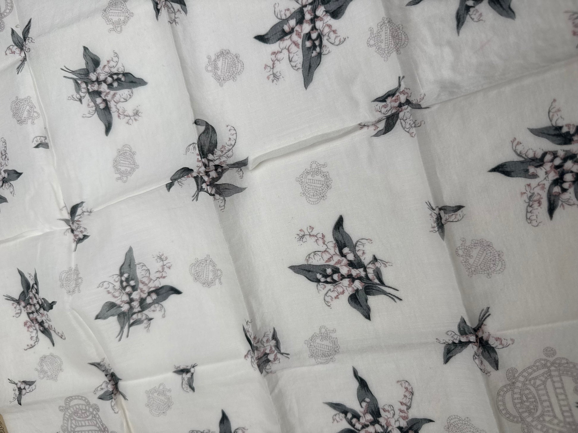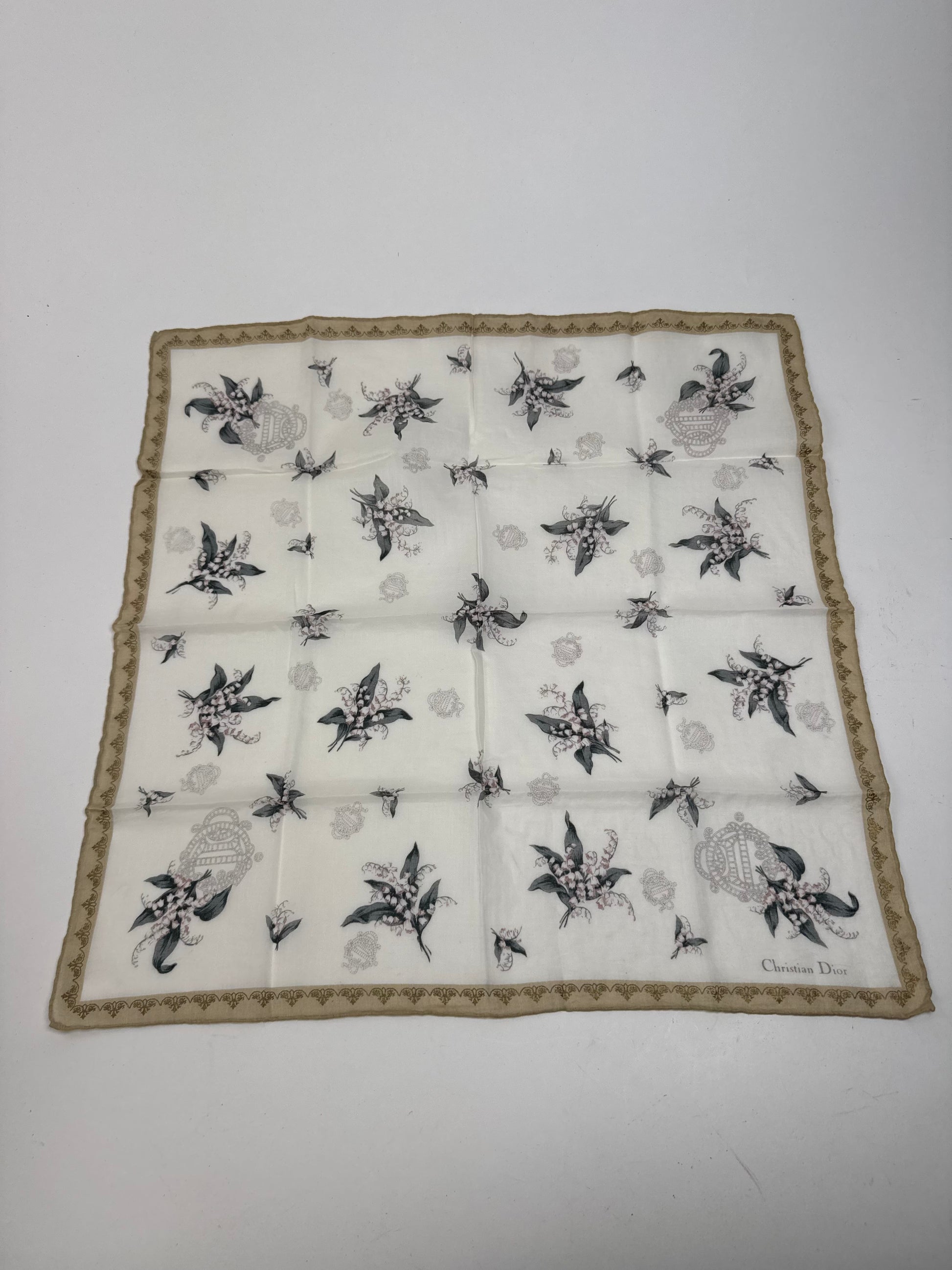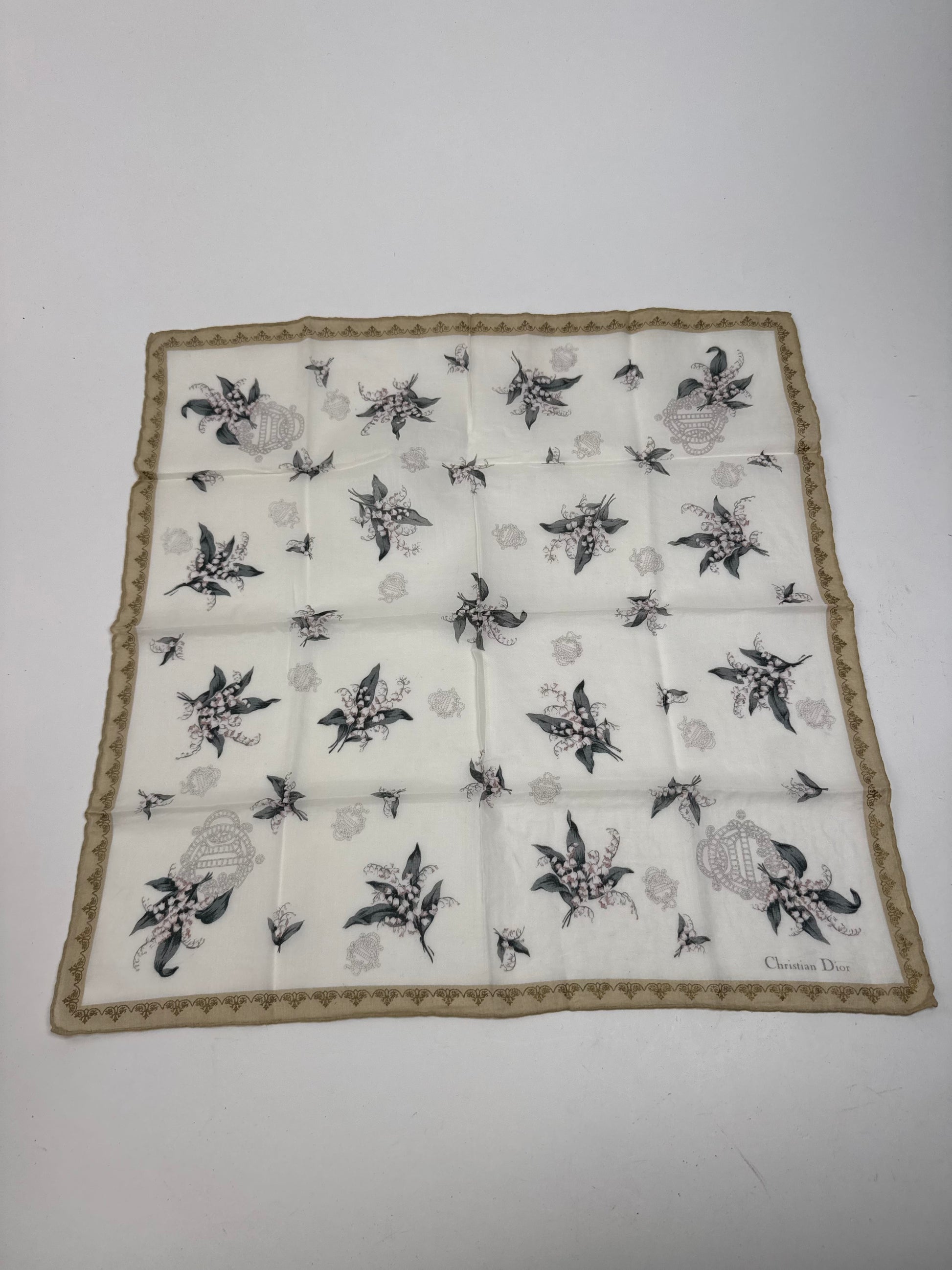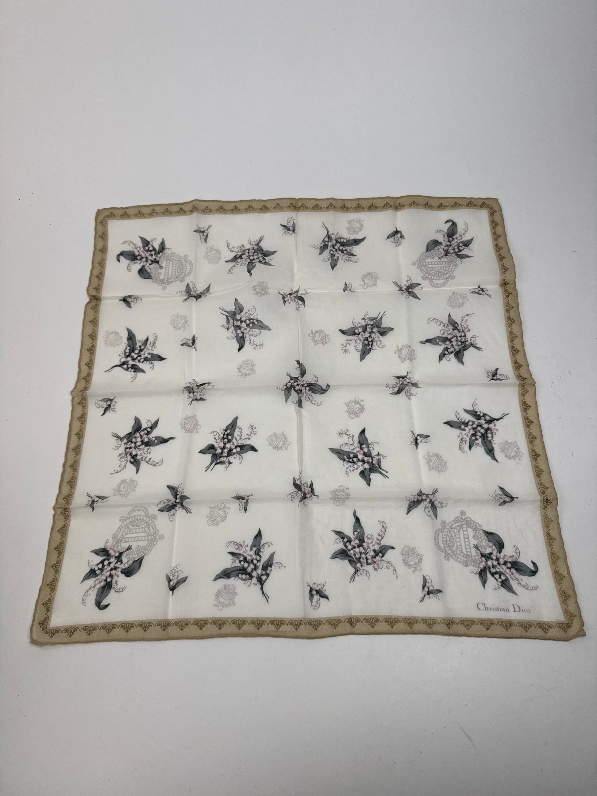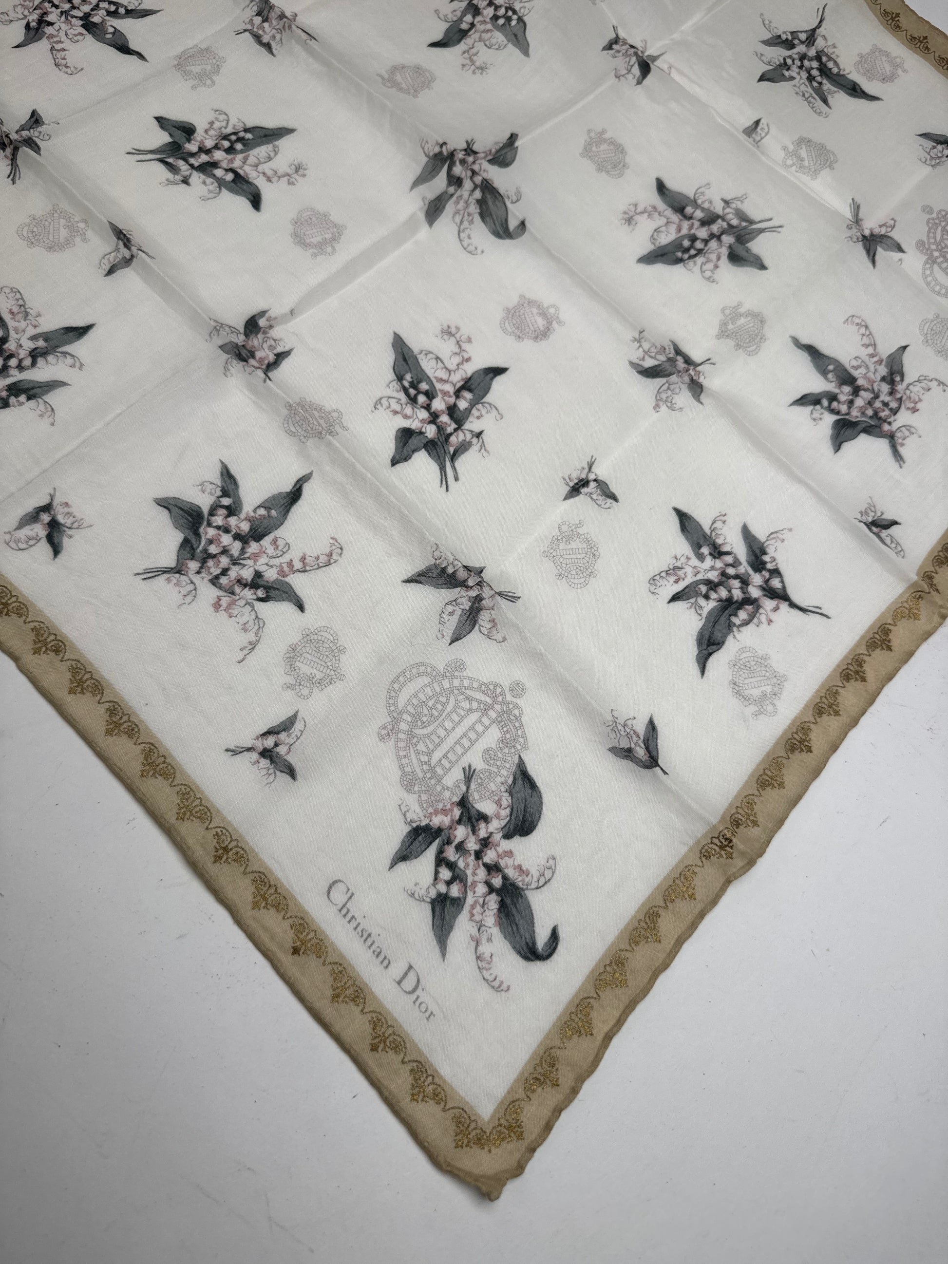 This vintage scarf is finely crafted of canvas and silk in a white base color, featuring a brown border and an elegant floral print with silver Dior logos throughout.