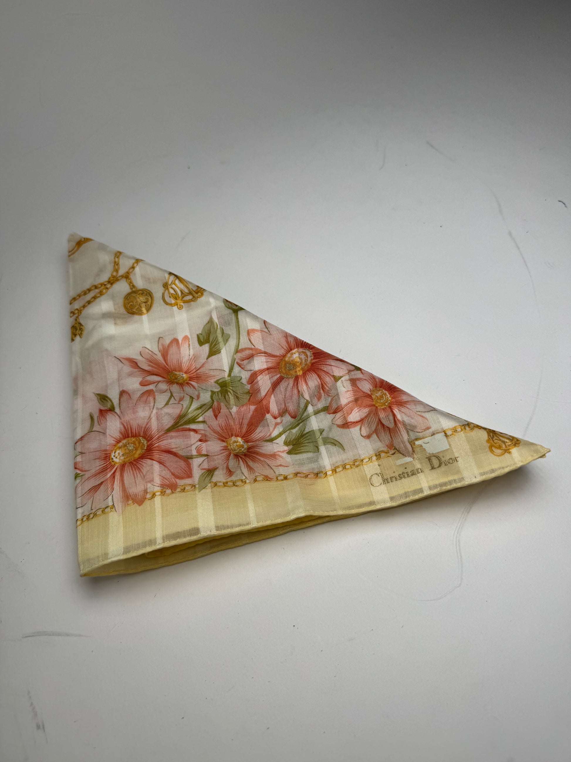 DIOR Vintage Scarf. This chic accessory is finely crafted of white cotton and silk with a lemon-yellow border. The design features golden chains, green and pink flowers.