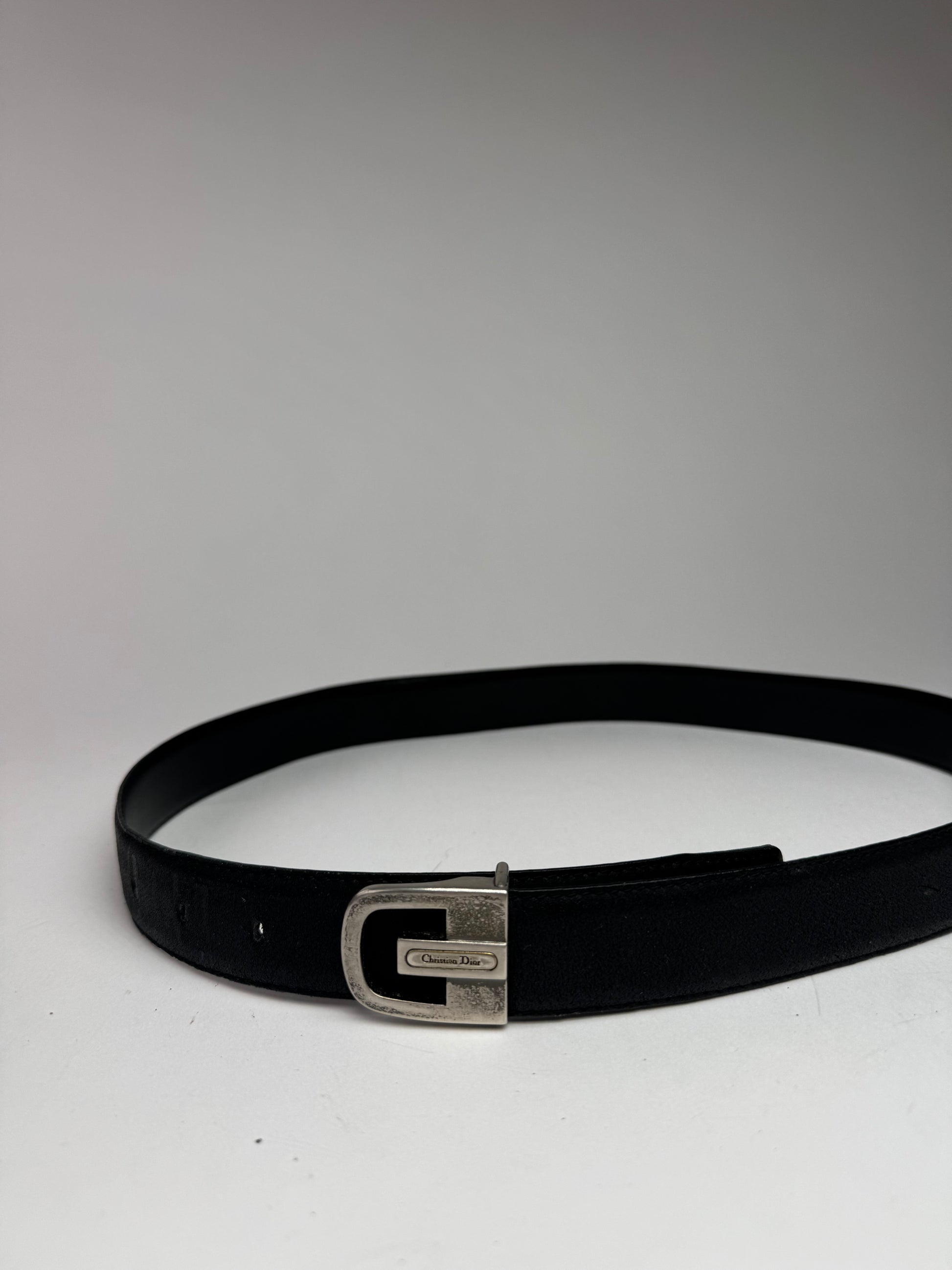 This sleek vintage belt is crafted from black leather and features a partially open silver-tone steel buckle adorned with a black Christian Dior logo. Likely dating back to the 1990s, this unisex piece embodies timeless elegance with a minimalist edge.