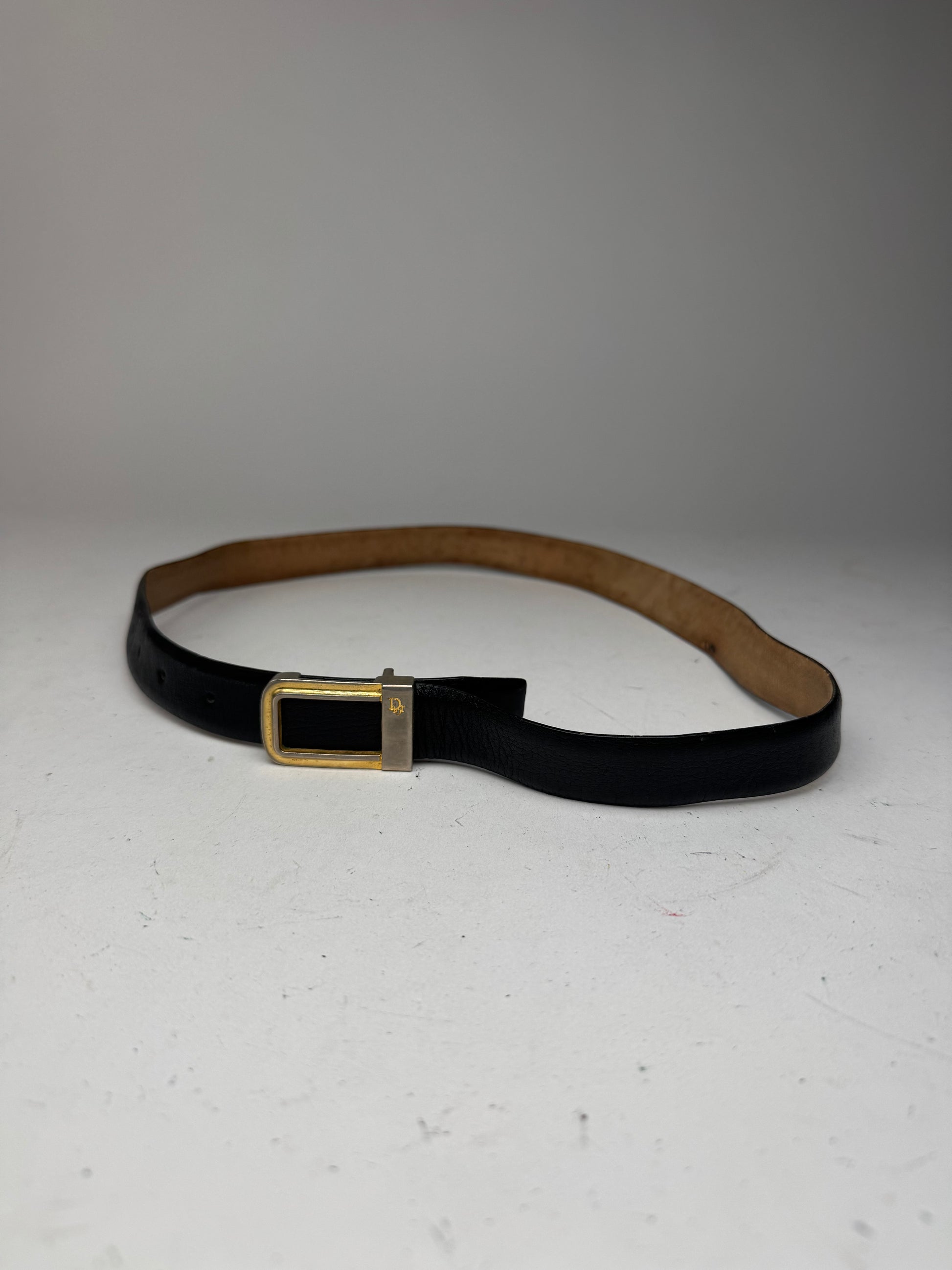 DIOR Vintage Belt. This vintage unisex belt is finely crafted of black leather with a beige suede lining. It features a freestanding bi-tone buckle in silver and gold-toned steel, engraved with the Dior logo.