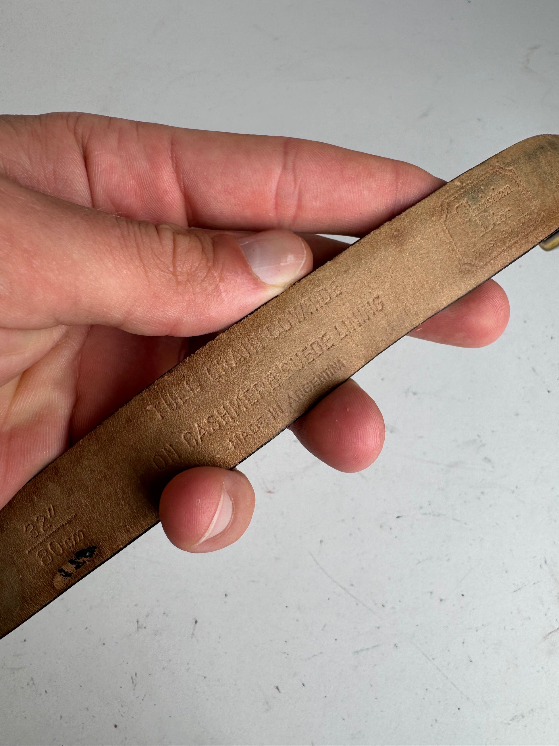 Condition Details: The exterior leather and suede lining are clean with light signs of wear. The buckle remains bright with minor scratches. Overall well-preserved vintage condition.