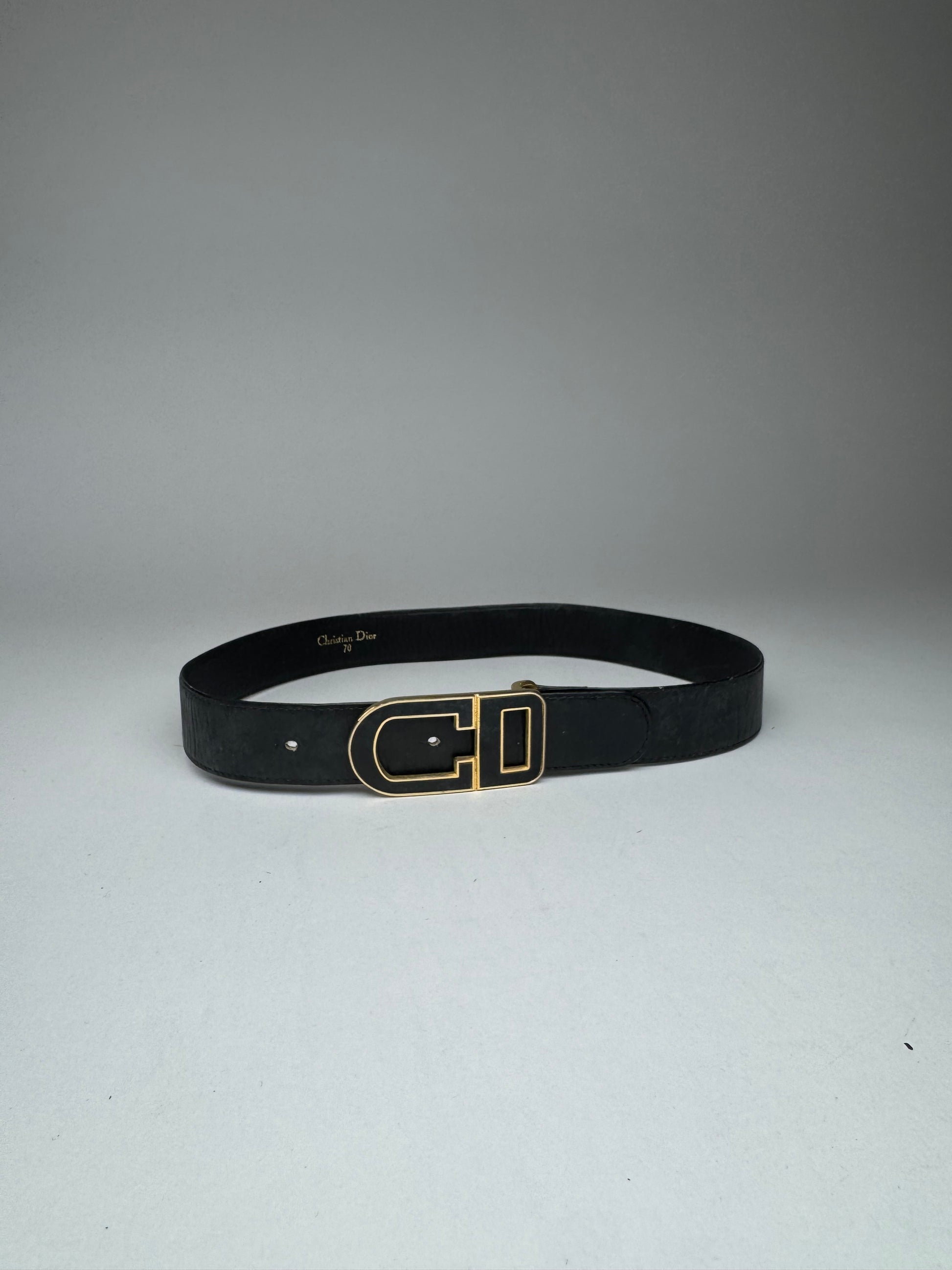 This chic belt is finely crafted of black leather and features a gold-tone steel buckle in the shape of the iconic CD logo, partially coated in black.