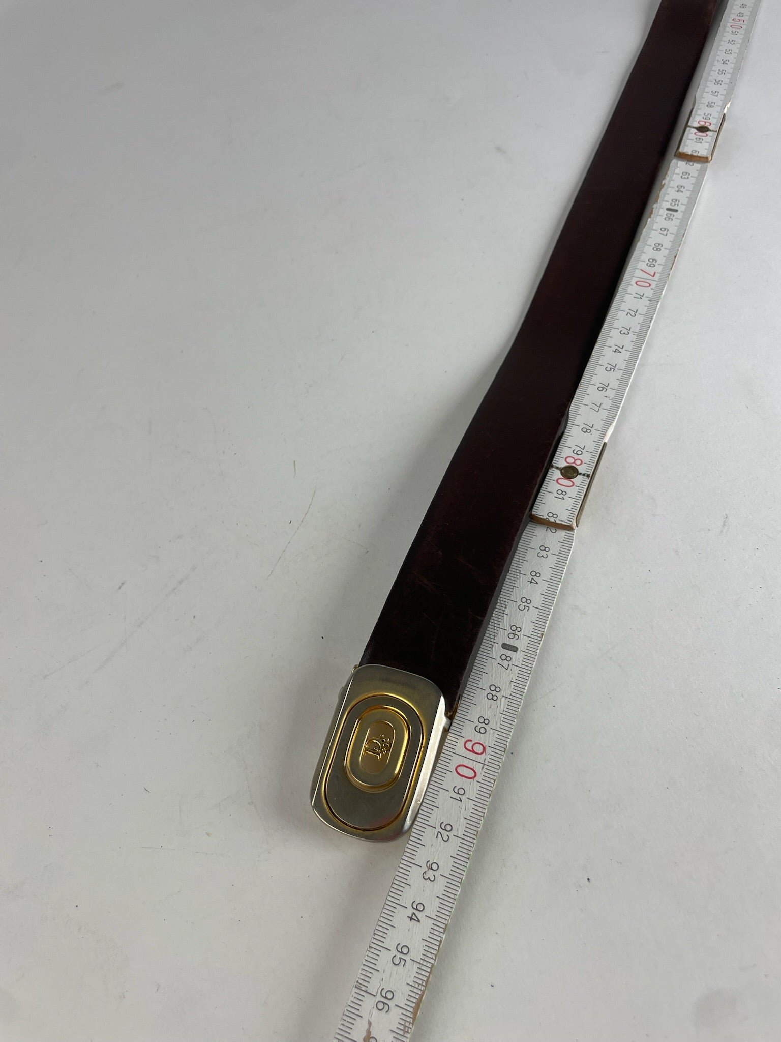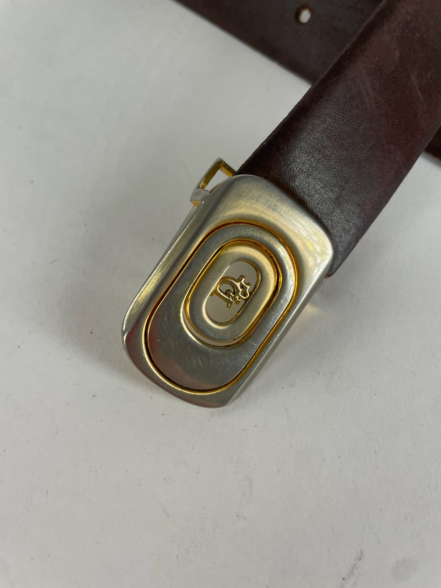 DIOR Vintage Belt. This classic vintage belt is finely crafted of brown leather and features a gold-tone steel buckle with a Dior logo detail. The belt is designed with a timeless silhouette and can be worn unisex.
